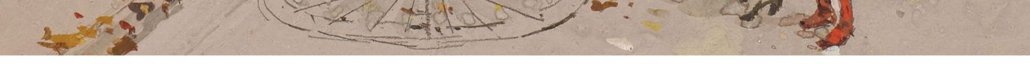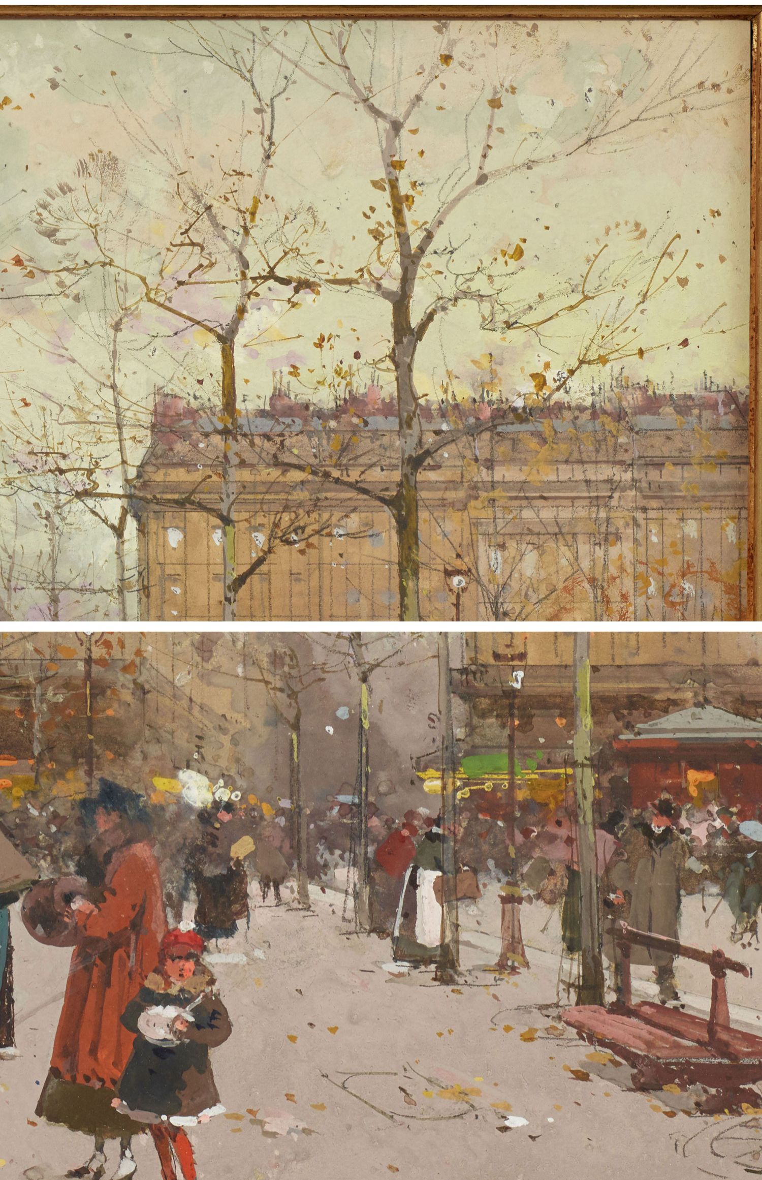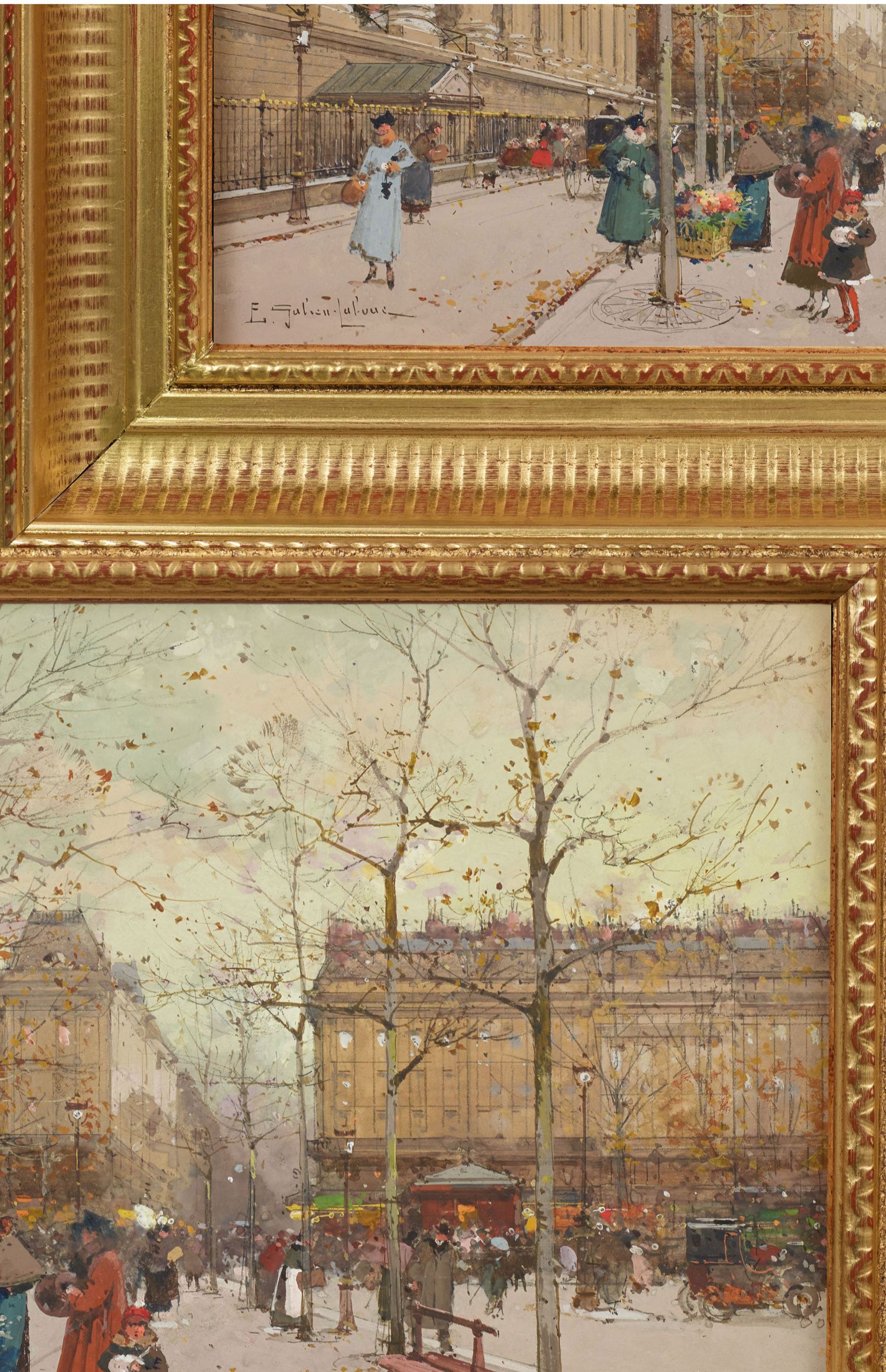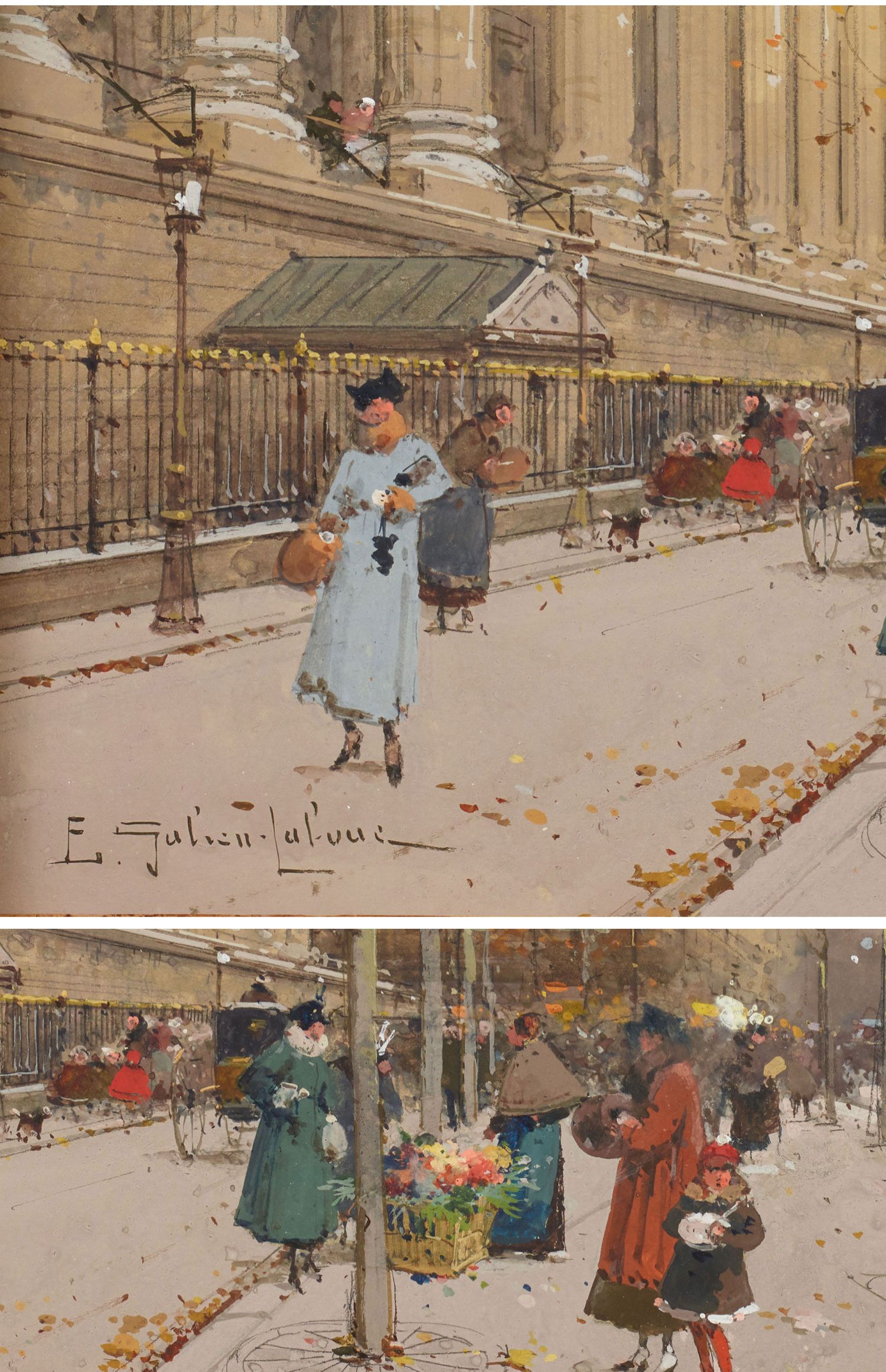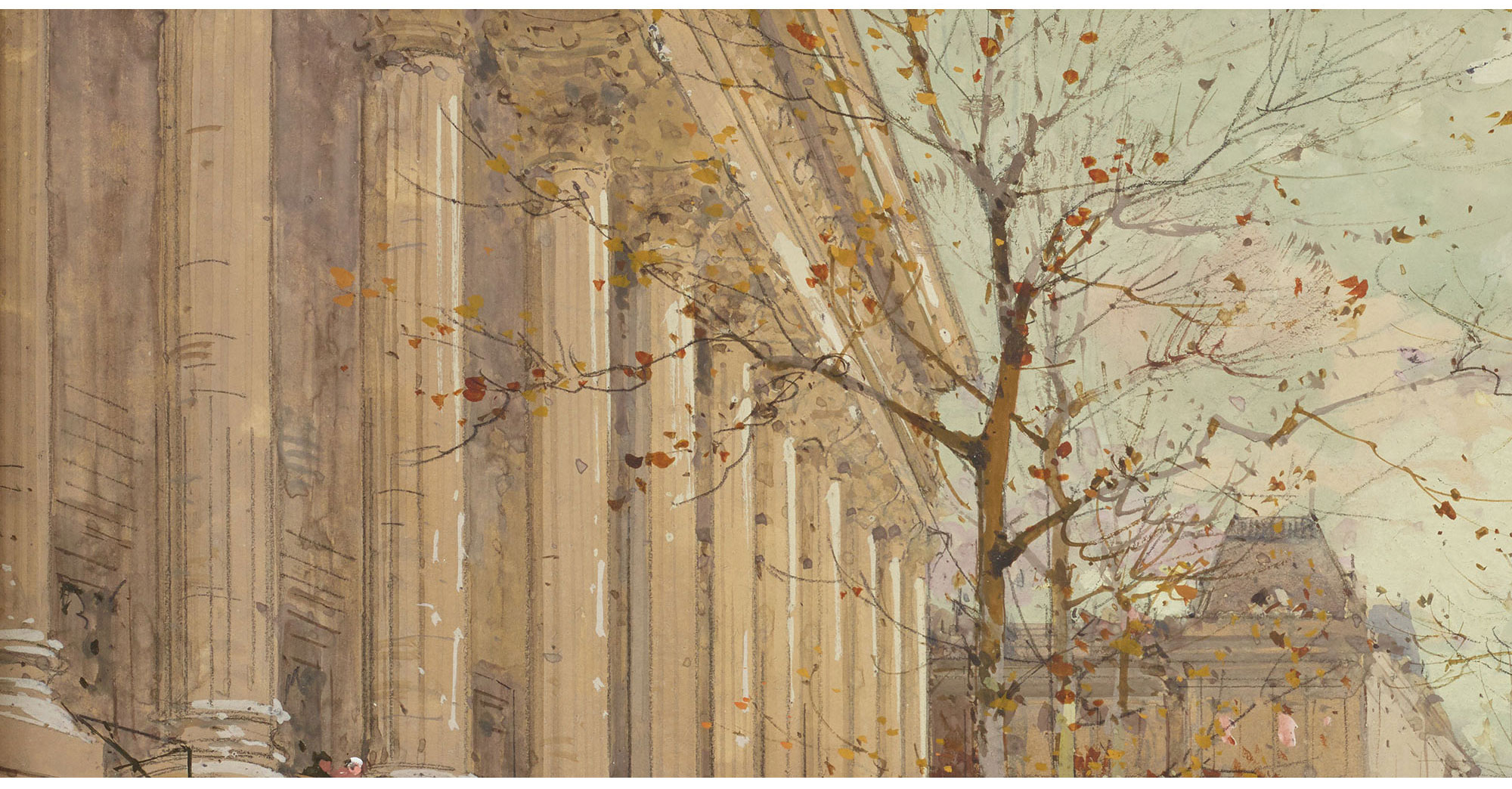 独角鹿西洋古董法国艺术家签名水粉画《冬日的巴黎马德莱娜广场》