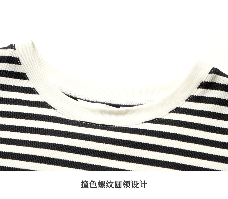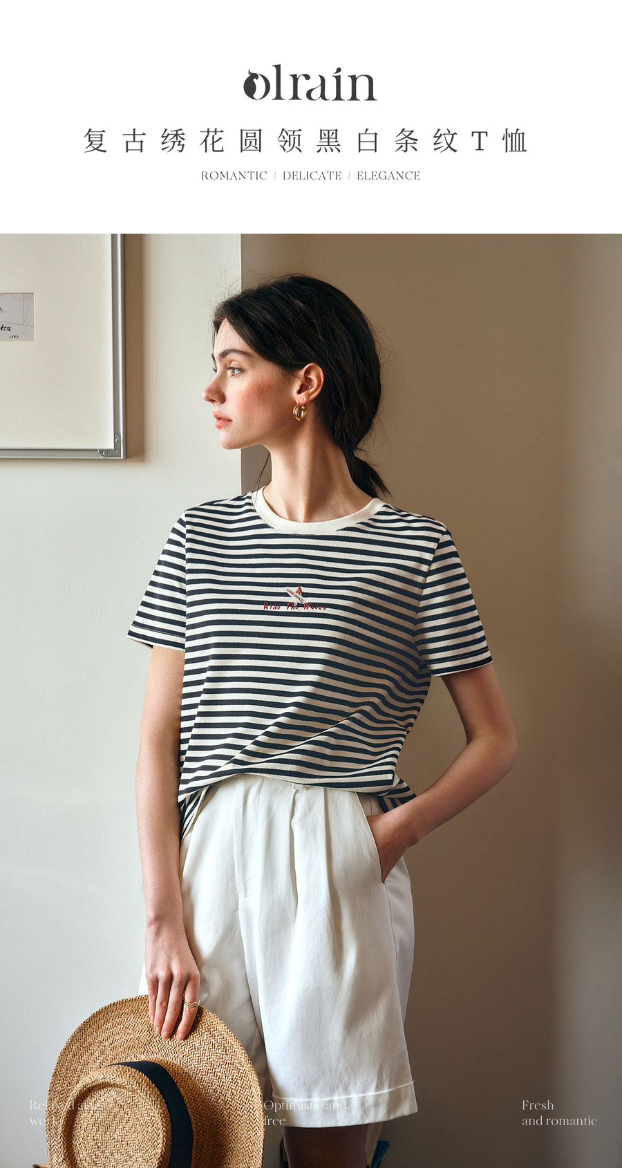 OLrain欧芮儿黑白条纹T恤女夏季2025年新款复古绣花圆领休闲上衣