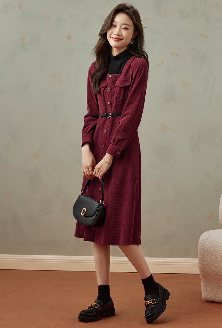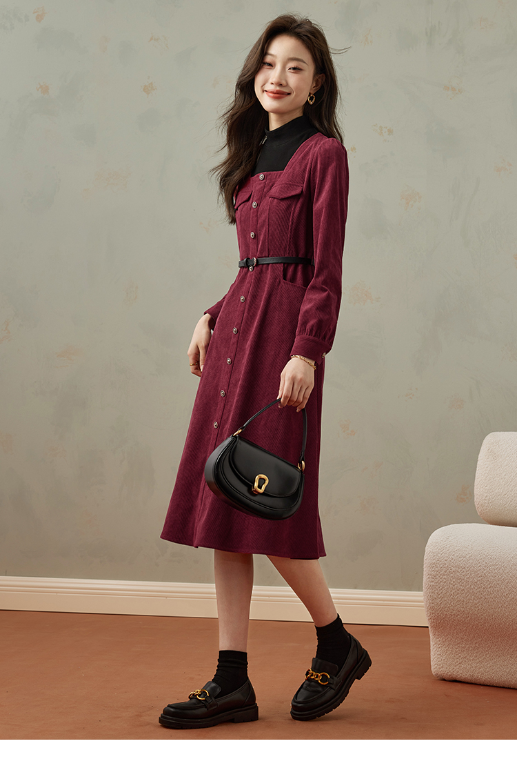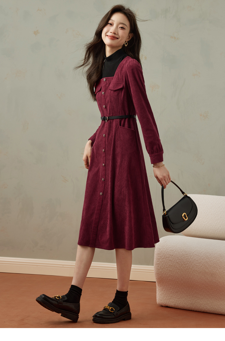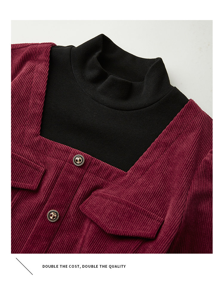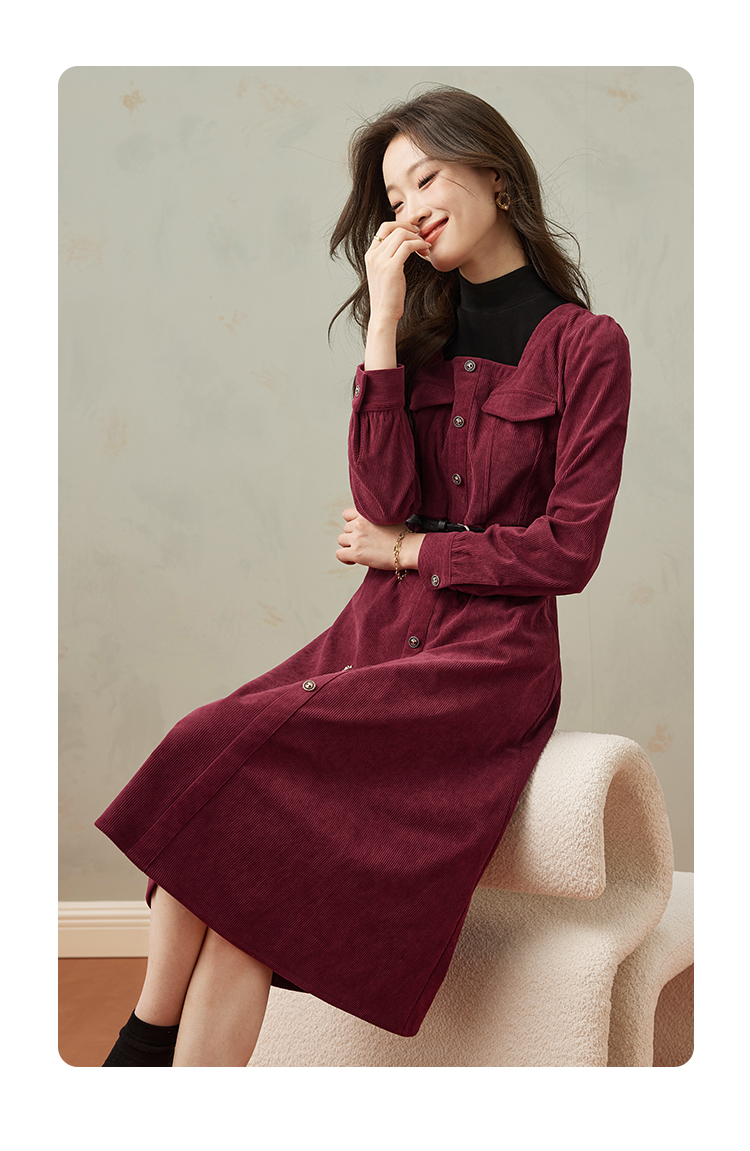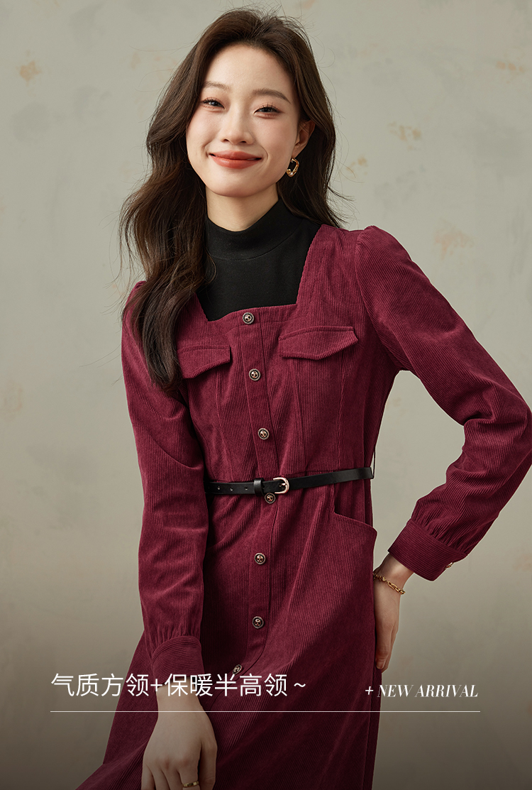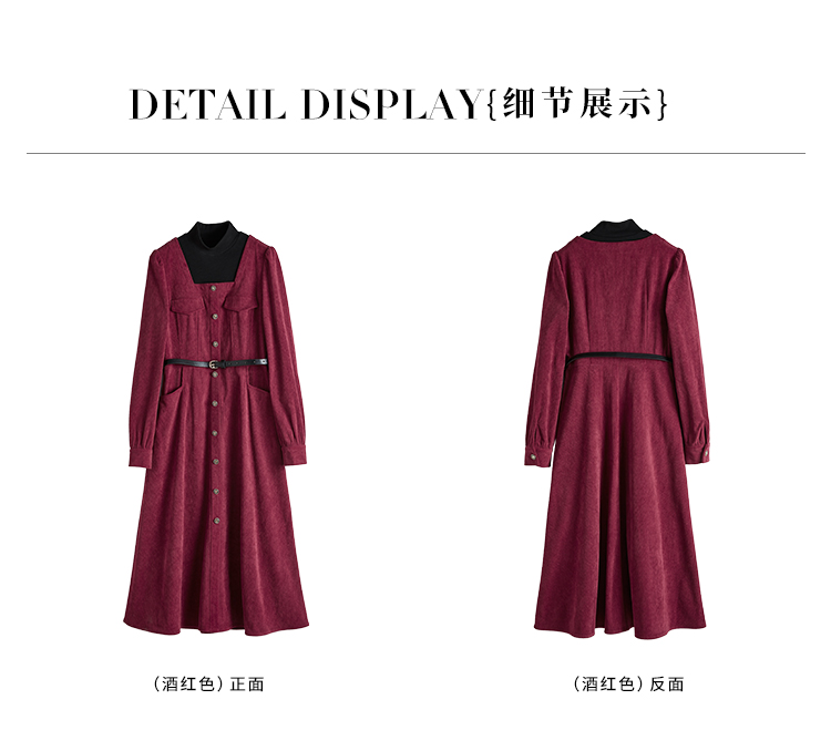 【专属特价】熙世界磨毛灯芯绒连衣裙女秋冬半高领拼接假两件裙子