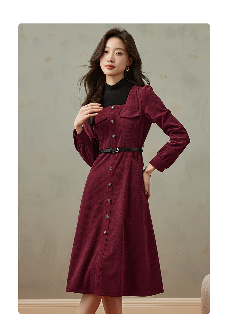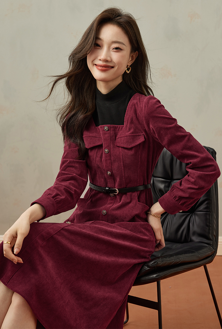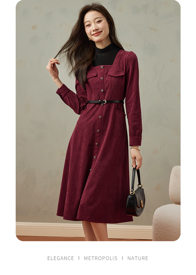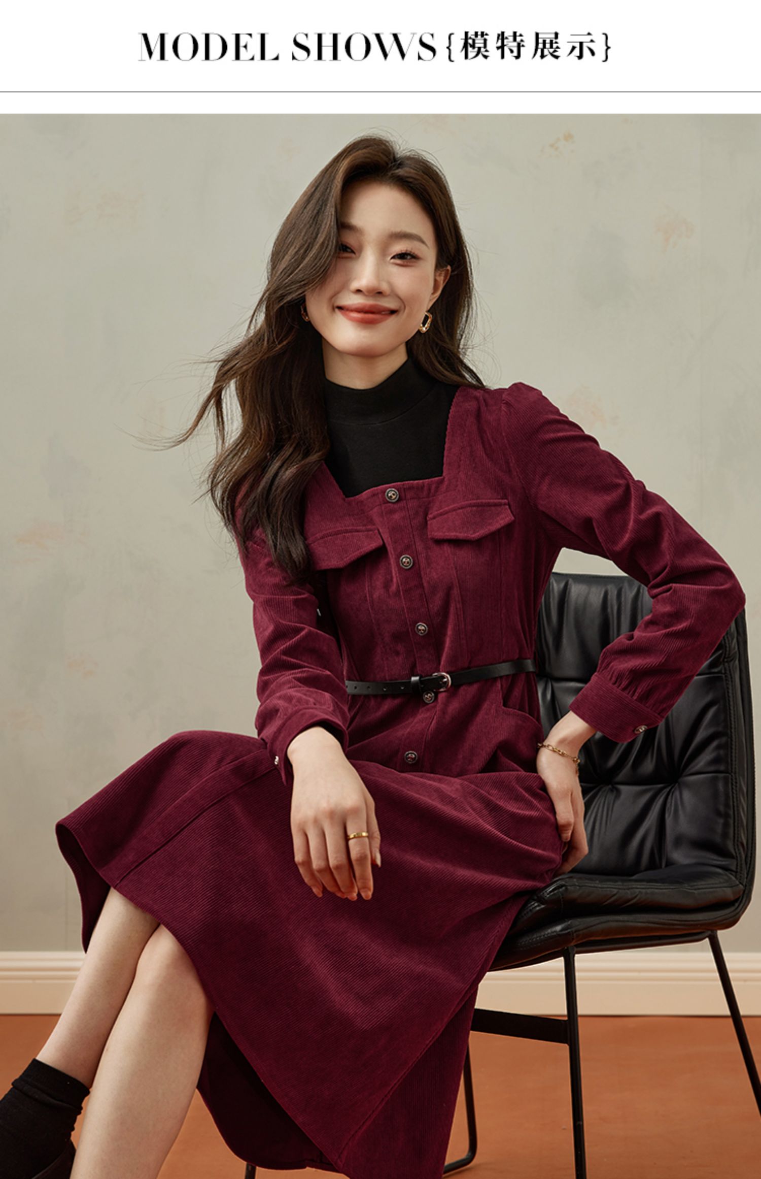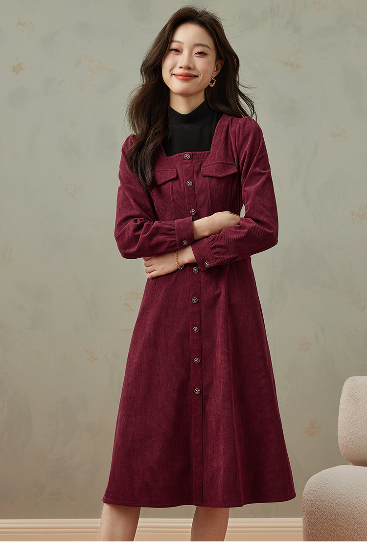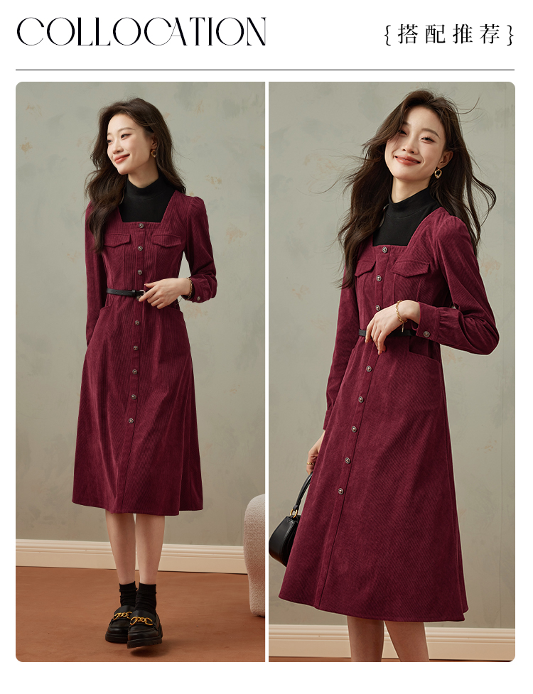 【专属特价】熙世界磨毛灯芯绒连衣裙女秋冬半高领拼接假两件裙子