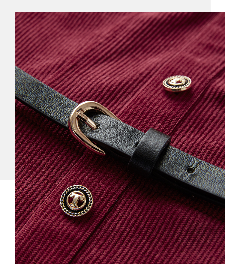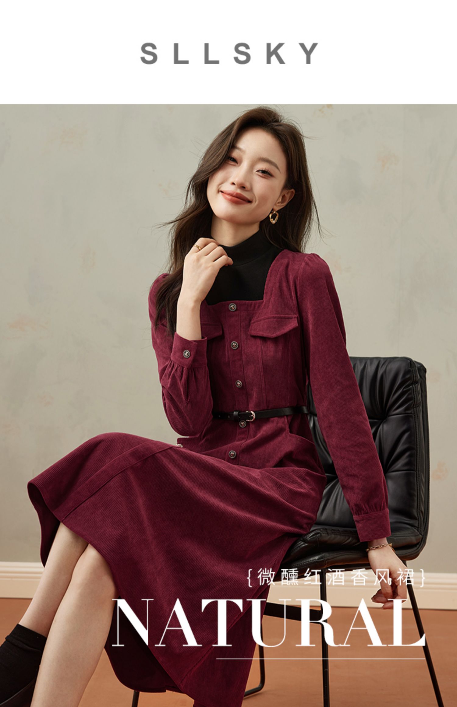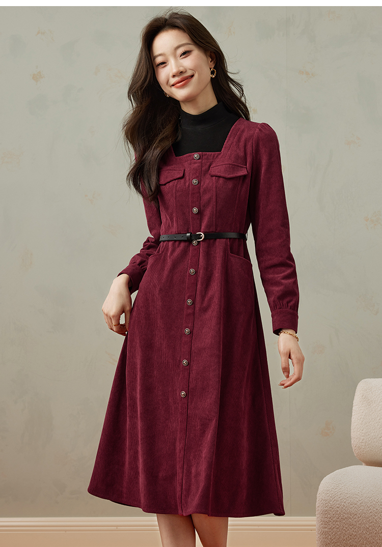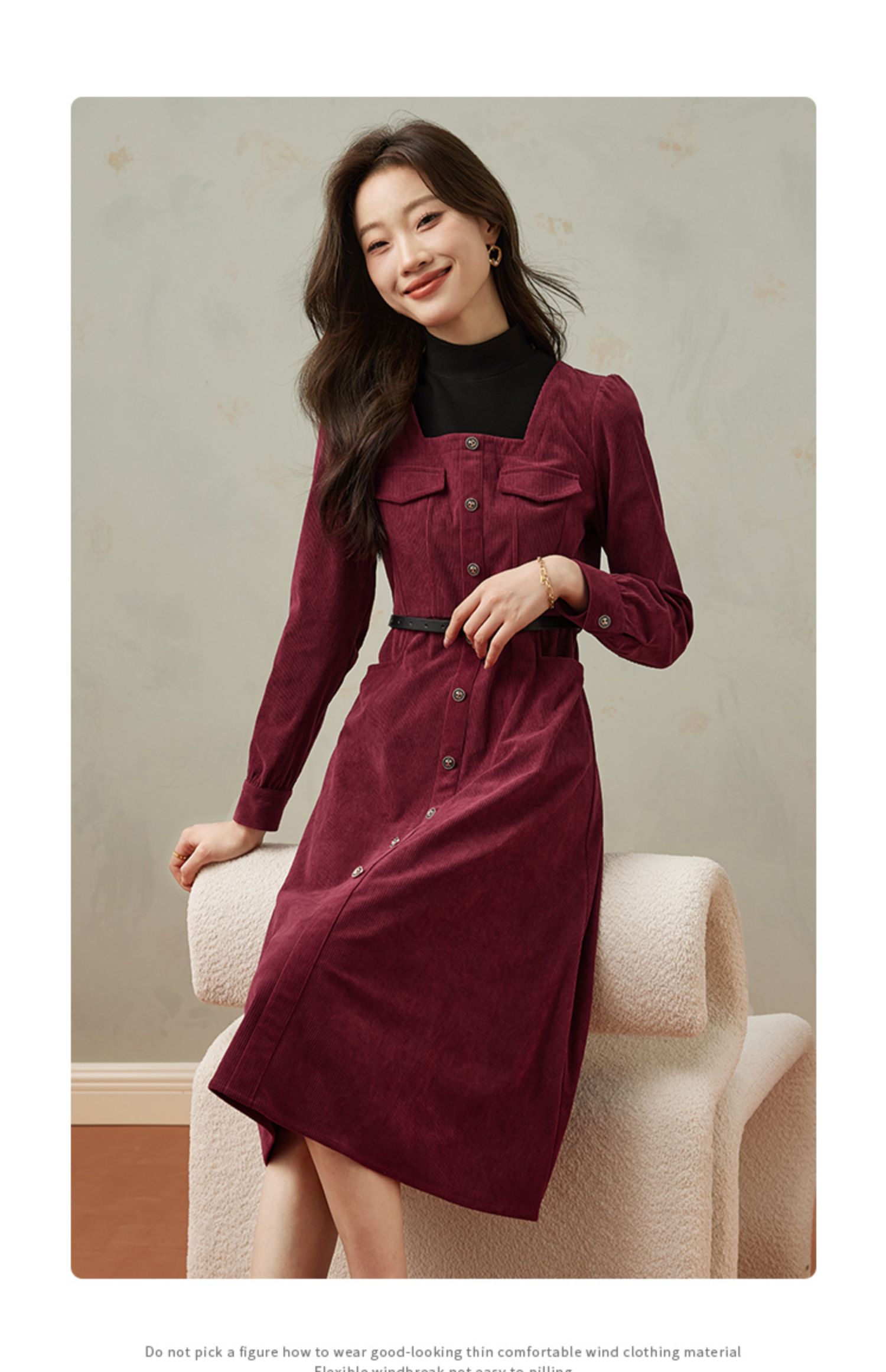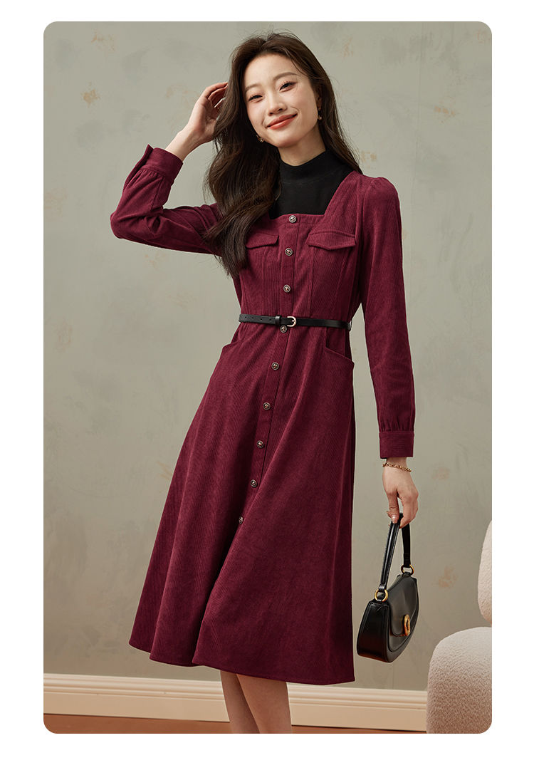 【专属特价】熙世界磨毛灯芯绒连衣裙女秋冬半高领拼接假两件裙子
