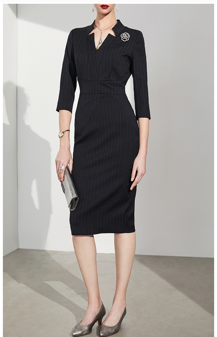 孤品 颈袖添香2024秋季新款连衣裙女V领OL修身条纹高级感商务包臀裙秋不退可换