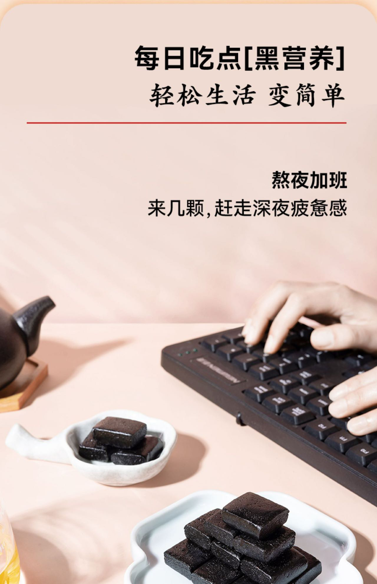 小黑糕均衡人体所需营养,含丰富的蛋白质和原花青素等,建议每天吃6-12块,可作为早餐晚餐代餐,配合多喝水和多吃水果可促进代谢,堪称健康养生及营养补充的完美结合的美味。