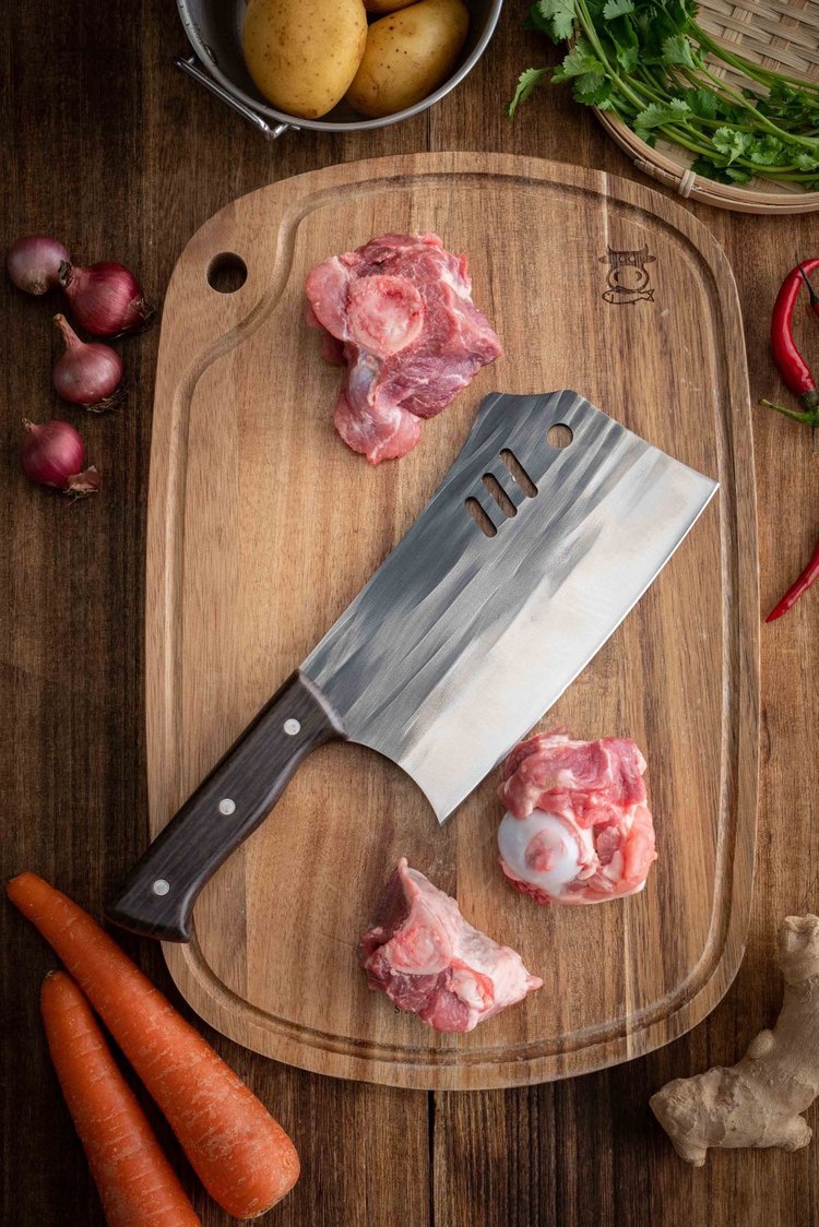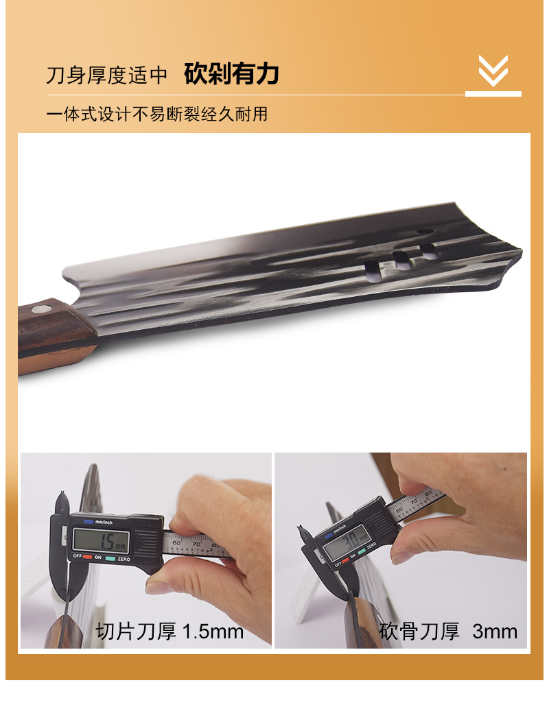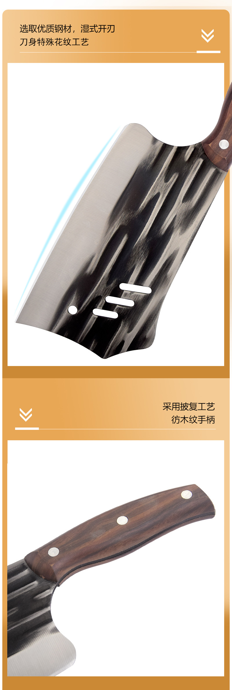 文枝古法锻打斩切刀组合,海豚刀身设计、轻松省力。锻打特殊防滑花纹处理,精选高碳钢耐用耐磨,鸡翅原木手柄握感舒适 ,匠心品质。