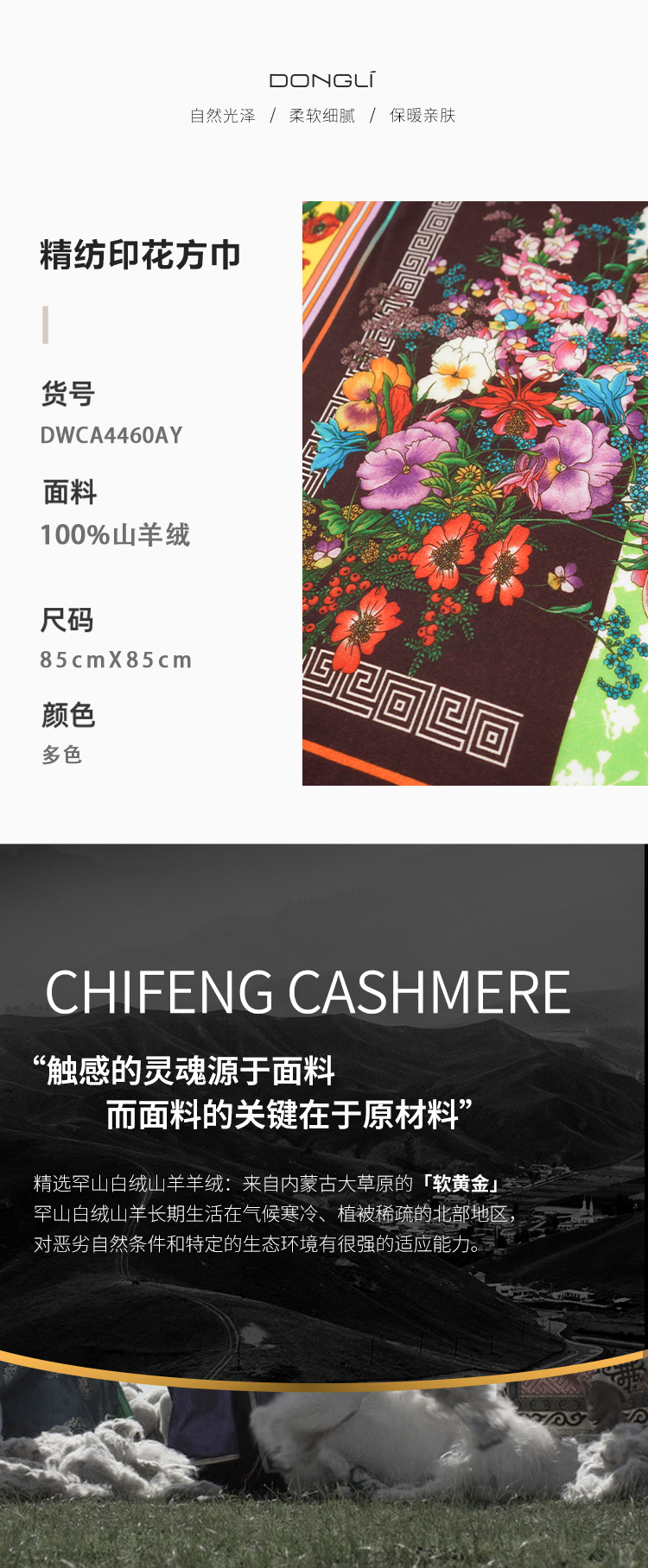 东黎羊绒是赤峰东荣集团自主品牌,自有牧场/羊绒制品全产业链优势,实现了羊绒从“牧场”到“商场”的华丽转变。
