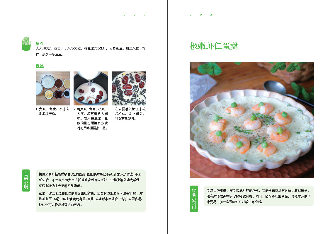范志红:我的健康家常菜Part 1 吃出苗条的美食 001瘦身八宝粥 004豆浆藜麦金银饭 006极嫩虾仁蛋羹 008莴笋木耳拌鸡丝 010虾皮玉米炒时蔬 012豆腐藜麦鸡丸汤 014火龙果青笋炒虾仁 016金针菇青豆烧丝瓜 018芦笋草菇炒虾仁 020Part 2 畅通肠道的美食 022果仁炒薯丁 028韭菜豆渣煎饼 030茴香蘑菇炒蛋 032火龙果猕猴桃酸奶 034牡蛎韭菜炒鸡蛋 036炒四丝 038Part 3 滋润皮肤的美食 040茴香杏仁鸡肝泥 044黄豆凤爪冻 046美丽果蔬汁 048火腿鸡蛋羹 050Part 4 呵护胃肠的美食 052胡萝卜炒米粥 056山药大枣糯米浆 058山楂苹果大枣汤 060醪糟木瓜牛奶羹 062Part 5 增重促长的美食 064蔬菜奶酪饼 068甜味杂粮饭 070韭菜香干炒小米饭 072土豆肉饼 074萝卜鱼夹 076Part 6 补钙健骨的美食 078上汤千张娃娃菜 082洋葱香菇炒豆腐 084香葱海米豆腐千张 086牛奶包子 088野菜奶酪饼 090腐竹茴香豆 092Part 7 补铁补锌的美食 094洋葱青椒炒鸡心 098牛蒡香菇炖牛腩 100风味炒羊肉 102黑芝麻果干红豆包 104鸭血木耳烩豆腐 106牛肉蒜薹炒双椒 108三彩烧鸭血 110酱拌茄子 112红烩牛肉粒 114Part 8 关爱眼睛的美食 116南瓜胡萝卜糙米饭 120三文鱼炒饭 122香甜炒桑葚 124鸭肝熟蛋拌菠菜 126Part 9 平稳血压的美食 128白灼豆苗 132鸡汤蛋碎煮苋菜 134豌豆百合炒虾仁 136醋拌海蜇裙带菜 138南瓜百合炒荷兰豆 140茴香拌豆嘴 142芒果虾仁 144Part 10 控制血糖的美食 146粉蒸蔬菜 150金珠豆浆饭 152红豆黑米燕麦粥 154杂粮饭 156马齿苋菜卷 158荠菜鸡蓉豆腐丸 160Part 11 健康早餐 162蔬菜鸡蛋软饼 166油麦菜鸡蛋汤面 168酸奶饼 170Part 12 健康便当 172煎银鳕鱼 176番茄蘑菇鸡丁 178什锦沙拉 179鲜蒸豆腐 180范志红:我的健康饮食经吃好主食,吃出健康 001软煎饼的健康制作 005汤面怎么做才营养 010杂粮饭的健康福利 014炒饭也能吃出健康 018什么人该喝什么粥 022美味羹糊的妙用 026营养面点的制作考虑 030带馅食品的营养改良 034发挥肉菜的健康作用 038留住水产品的健康好处 045蛋类怎样吃健康 050豆制品也能吃得津津有味 055蔬菜烹调方法的营养大比拼 059简单美味水油焖菜 064安全美味的水炒菜 074美味蒸菜的N 种面孔 078凉拌蔬菜的四类做法评点 082从自制饮品中喝出健康 087在美味零食中找到营养 091晚餐怎样吃,身体买账 094远离肥胖的营养夜宵 097