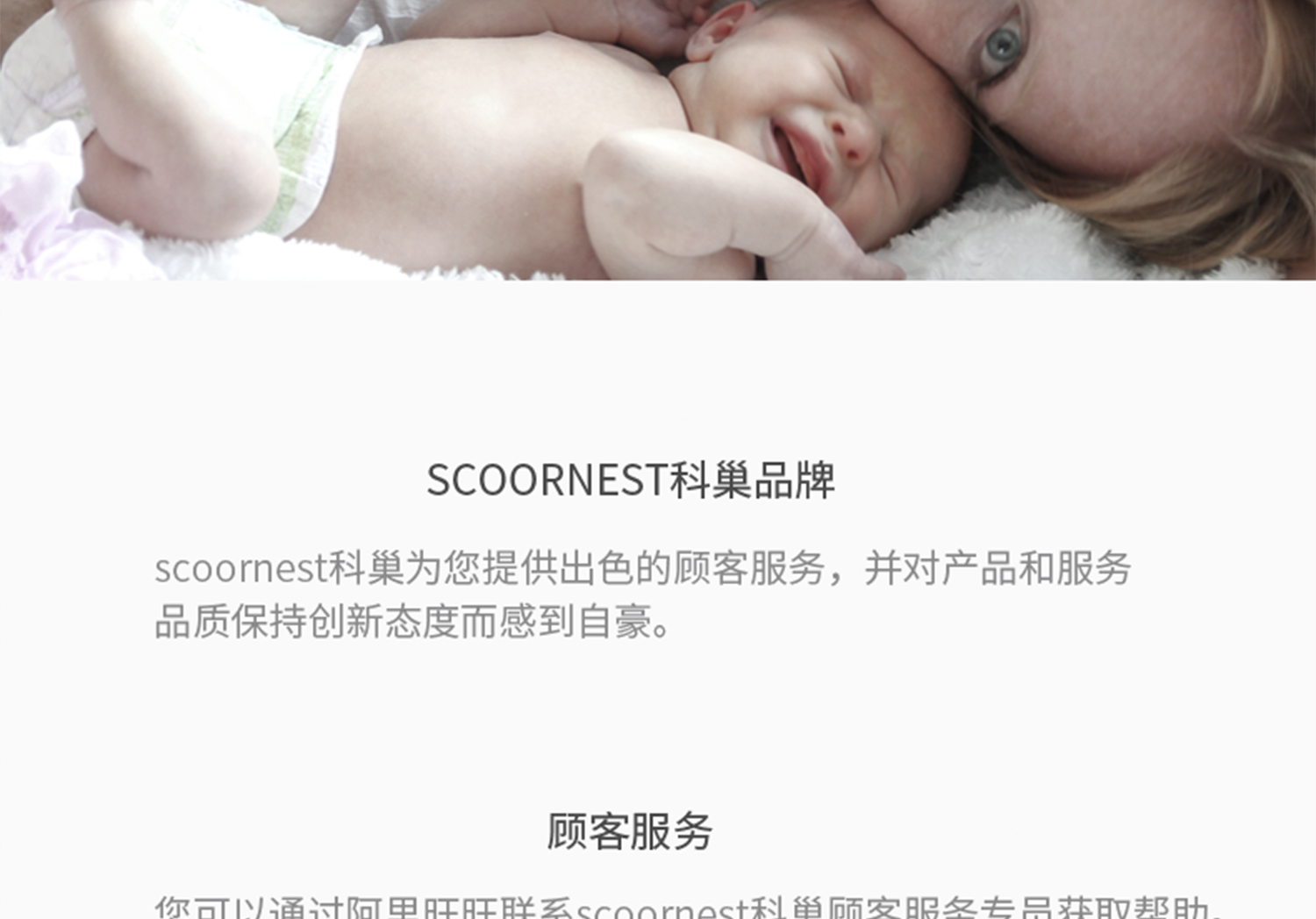 - Scoornest始终秉承给每一位宝宝送去科学的、关心的、创新的成长体验,通过提供商品和服务,使顾客形成守护、发展、巩固这种弥足珍贵的亲情的爱。