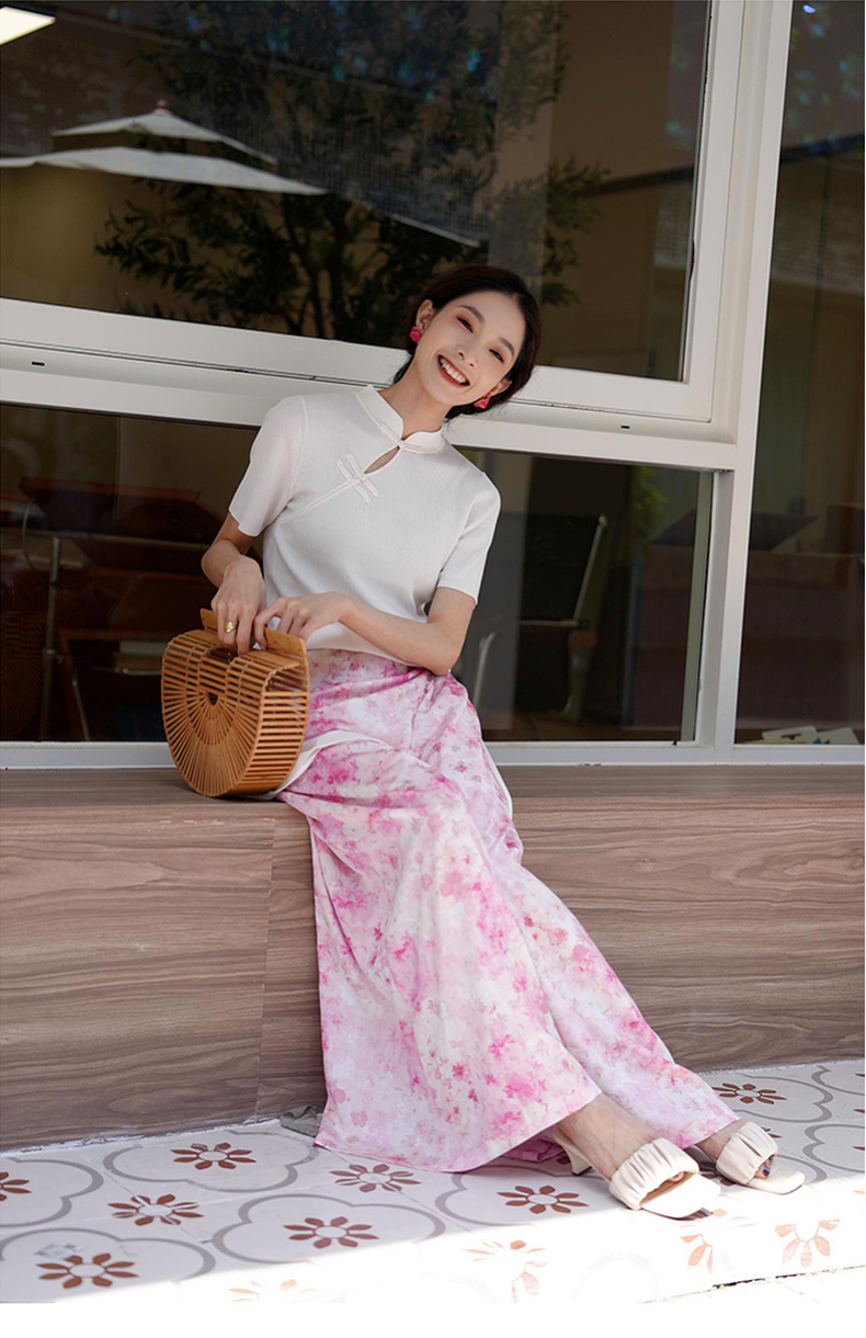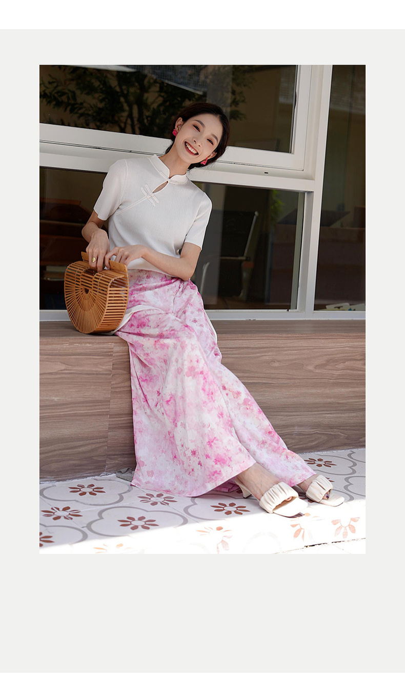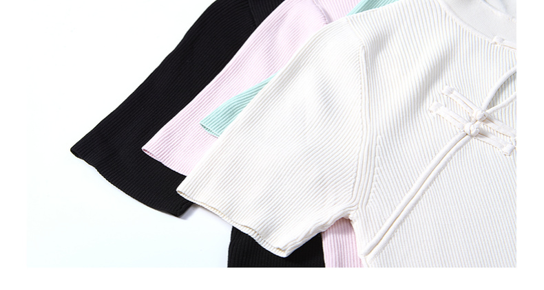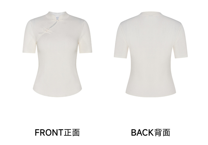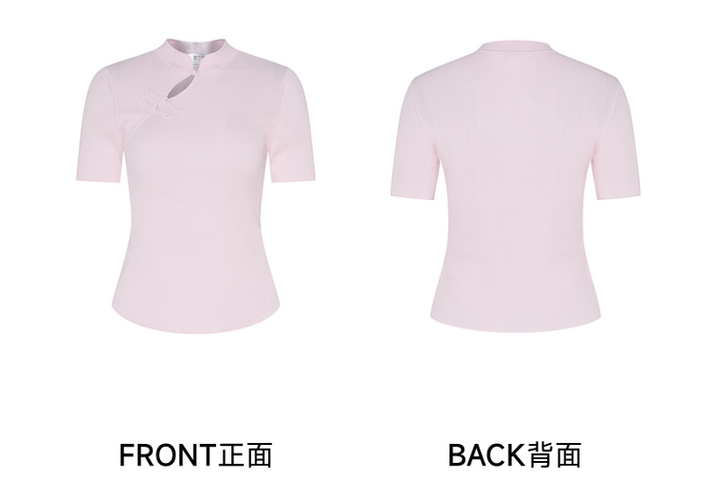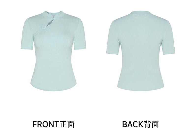 两三事山月寄情2024夏季新款新中式盘扣立领弹性修身短袖针织衫女