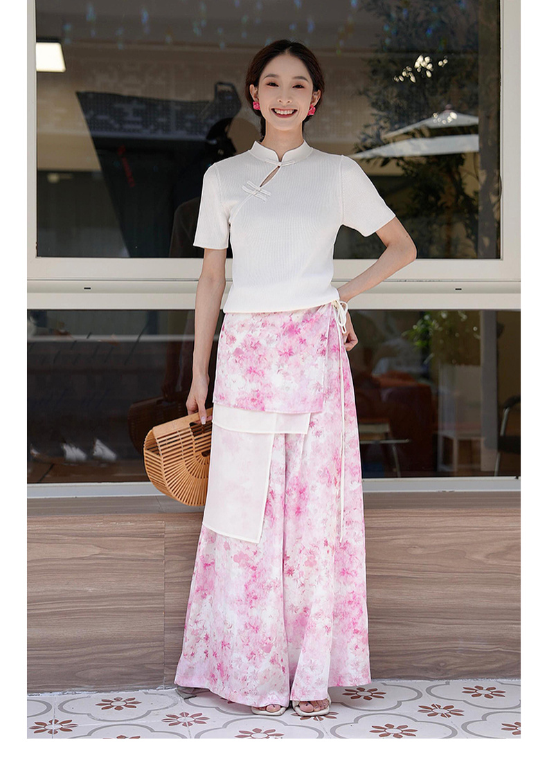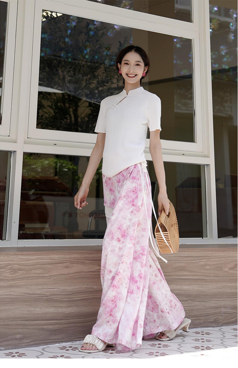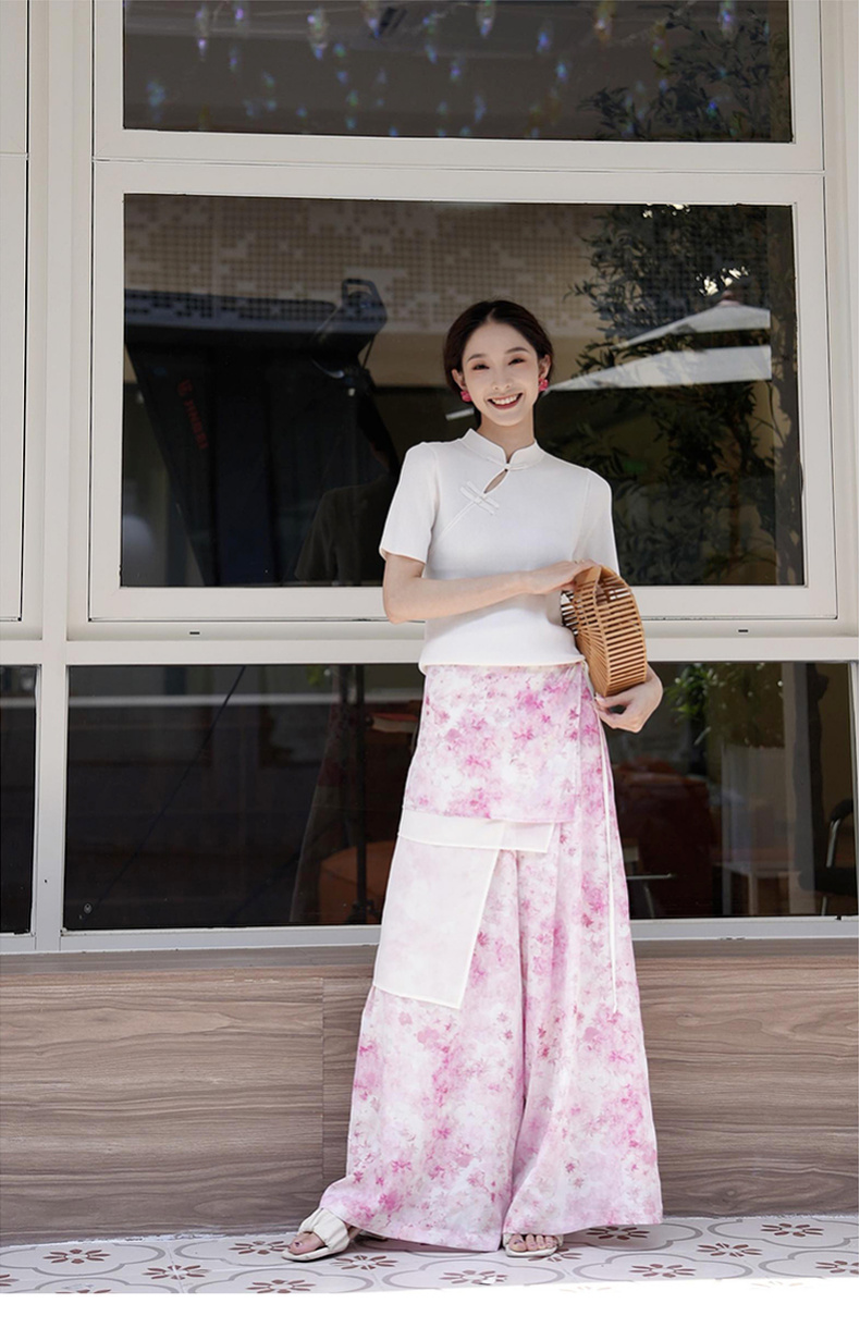 两三事山月寄情2024夏季新款新中式盘扣立领弹性修身短袖针织衫女