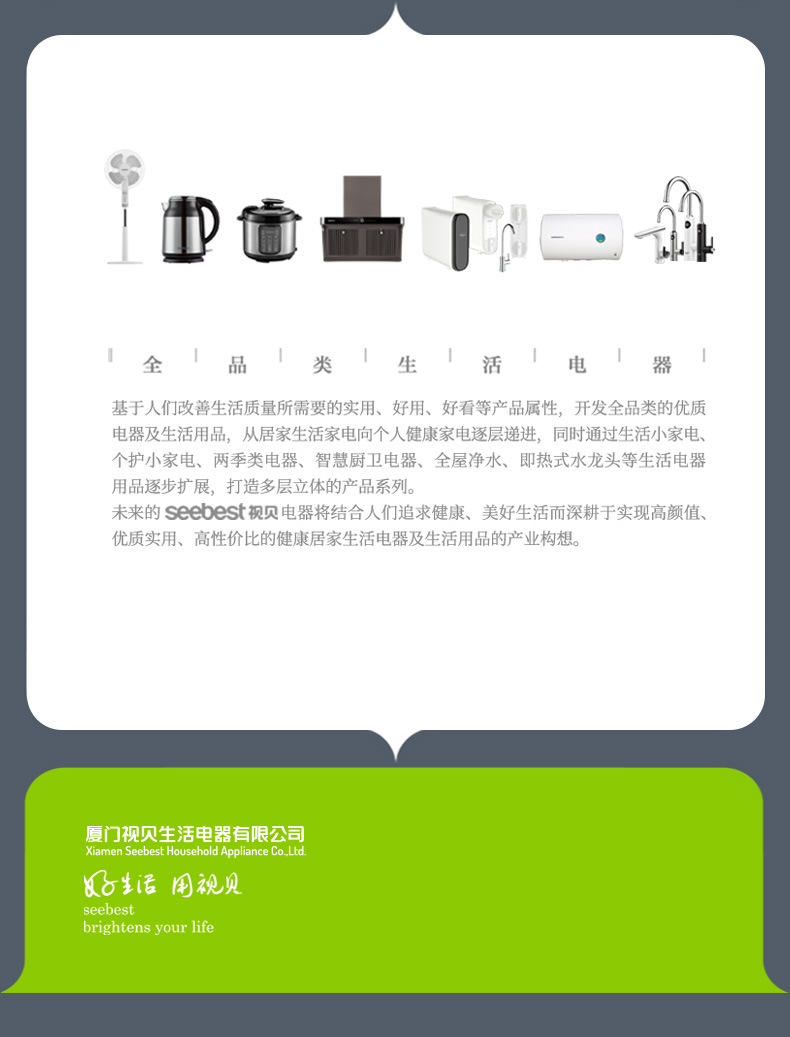 厦门视贝科技有限公司是集产品自主设计,研发,生产,销售于一体的高科技企业。拥有80000平方米的制造厂房,核心员工2000多人。产品线涵盖照明、电工,卫浴,线路,集成风暖等领域。