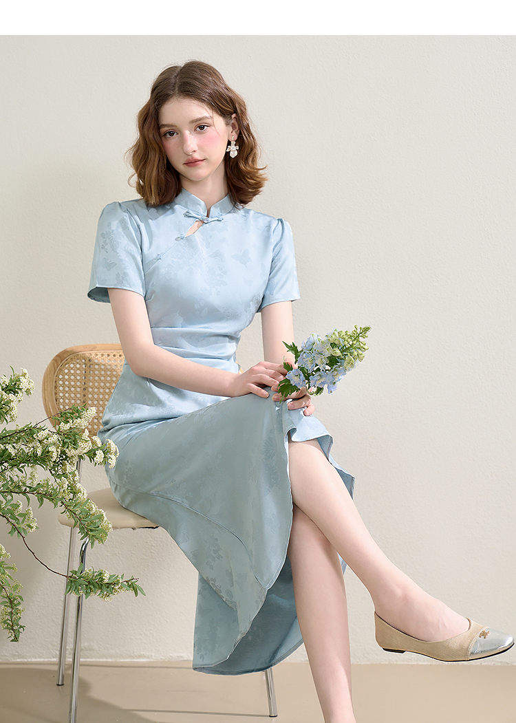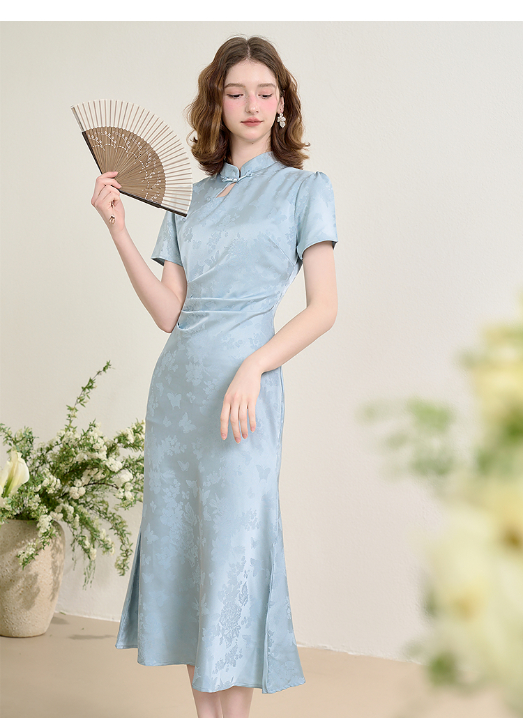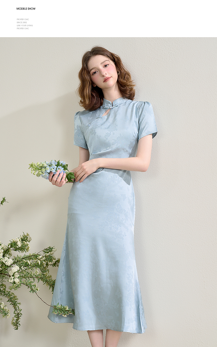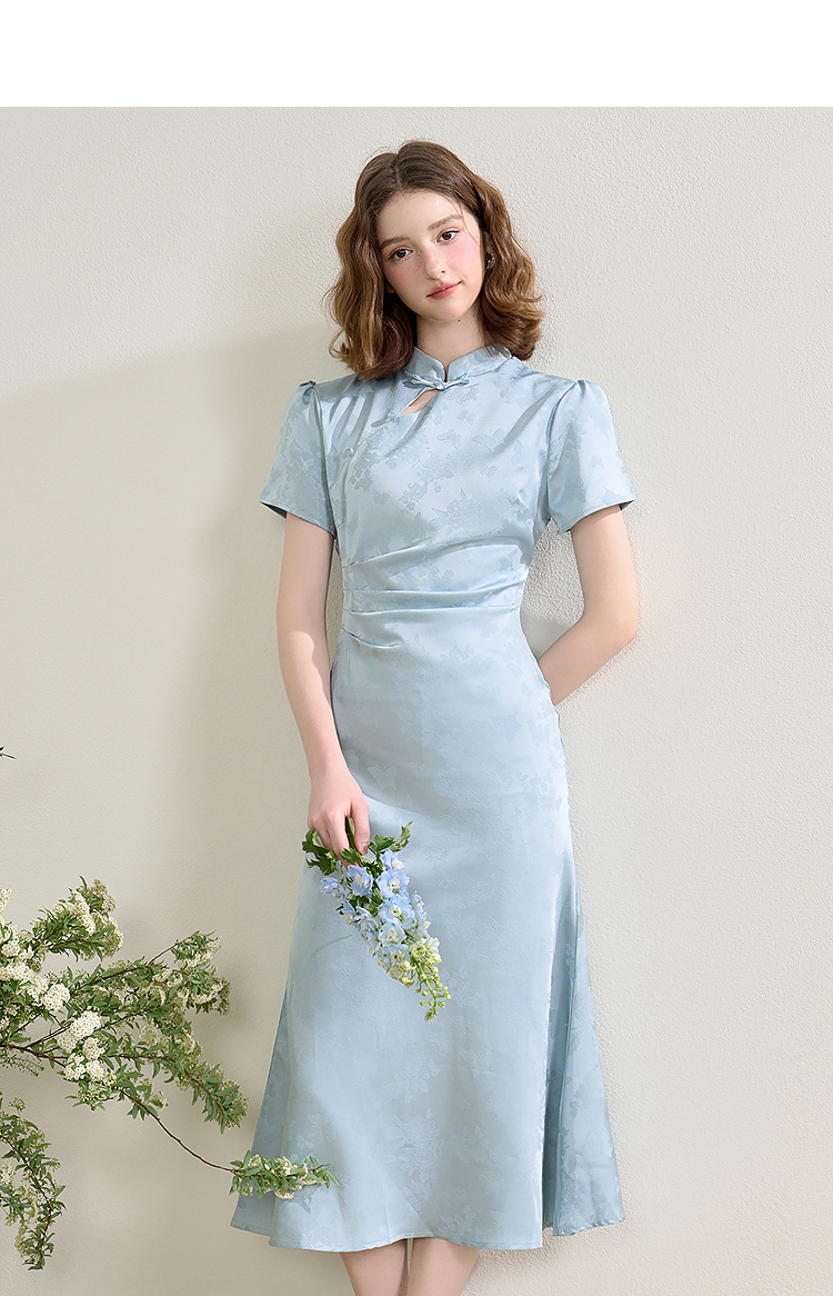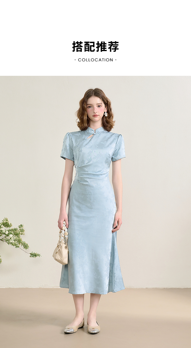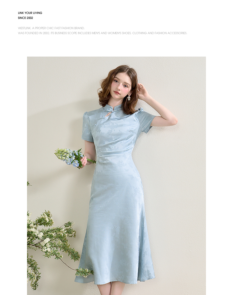 西遇新中式改良旗袍长裙女新款提花盘扣收腰短袖连衣裙SS150112