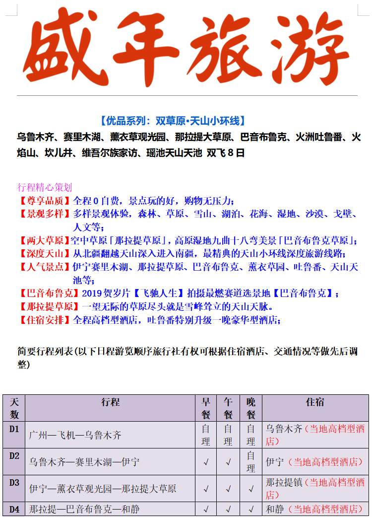 优品系列:双草原•天山小环线】 乌鲁木齐、赛里木湖、薰衣草观光园、那拉提大草原、巴音布鲁克、火洲吐鲁番、火焰山、坎儿井、维吾尔族家访、瑶池天山天池 双飞8日