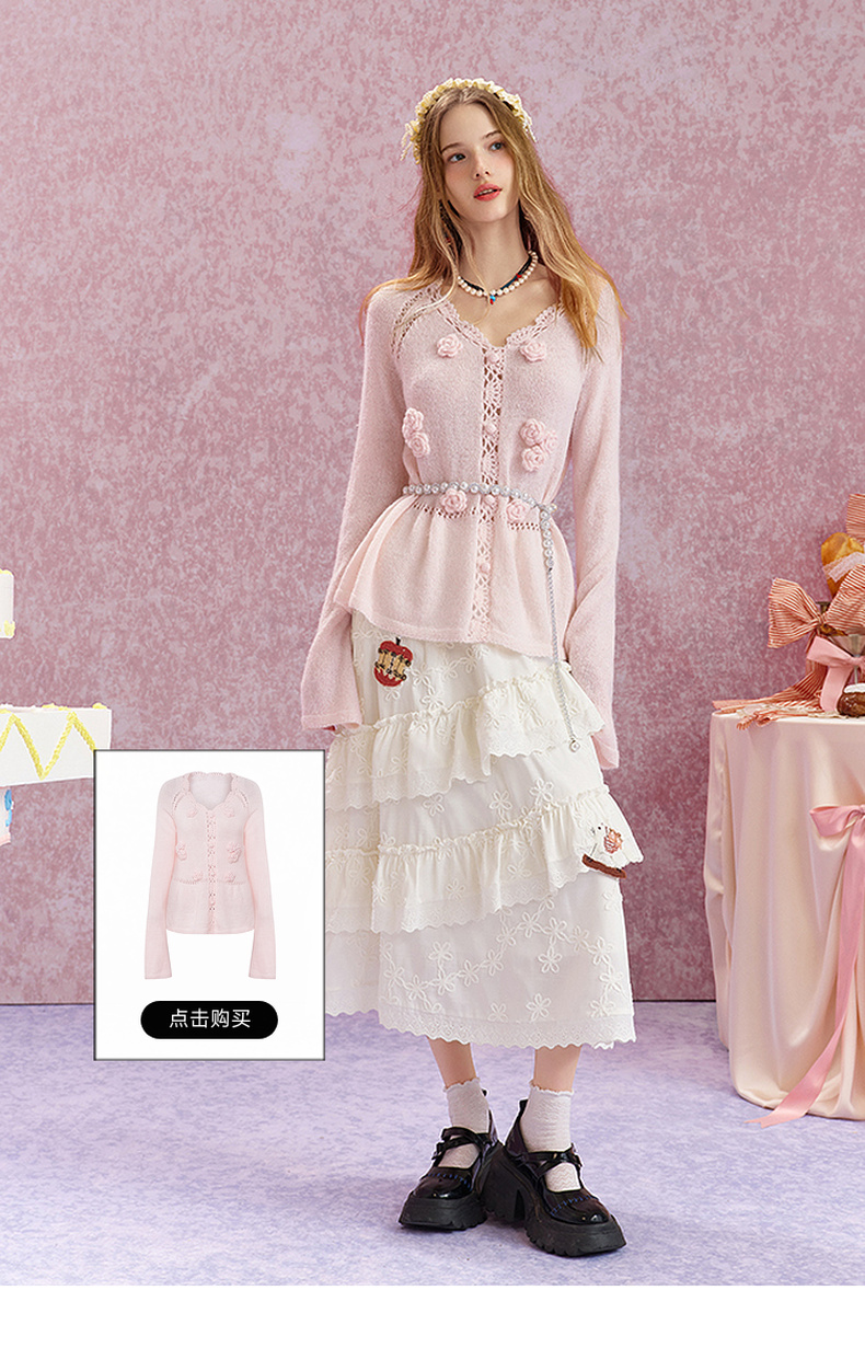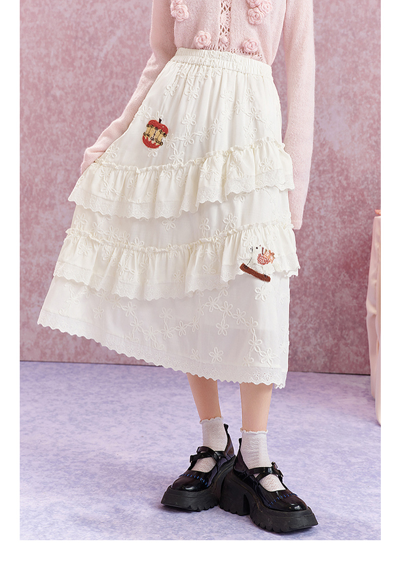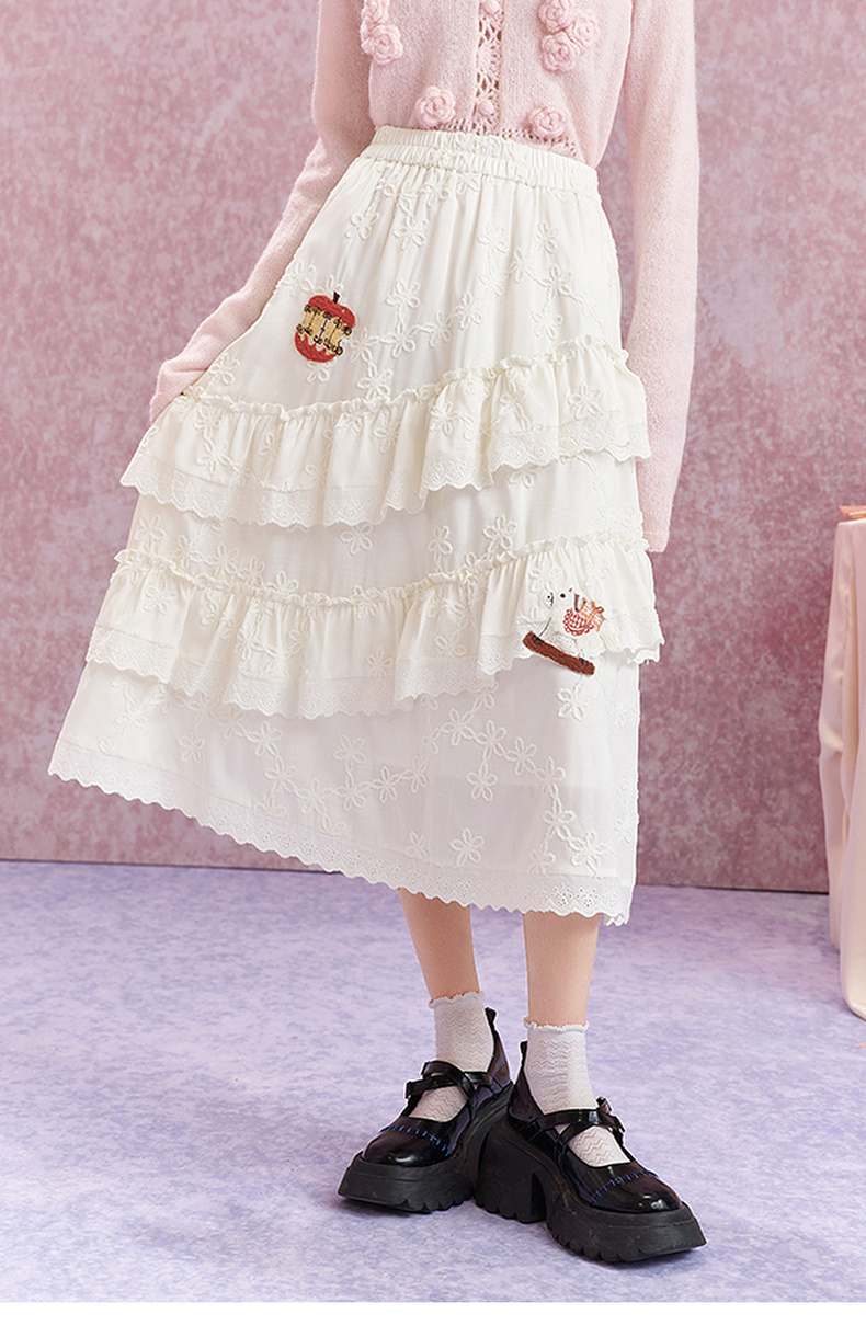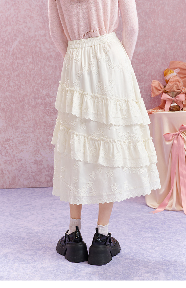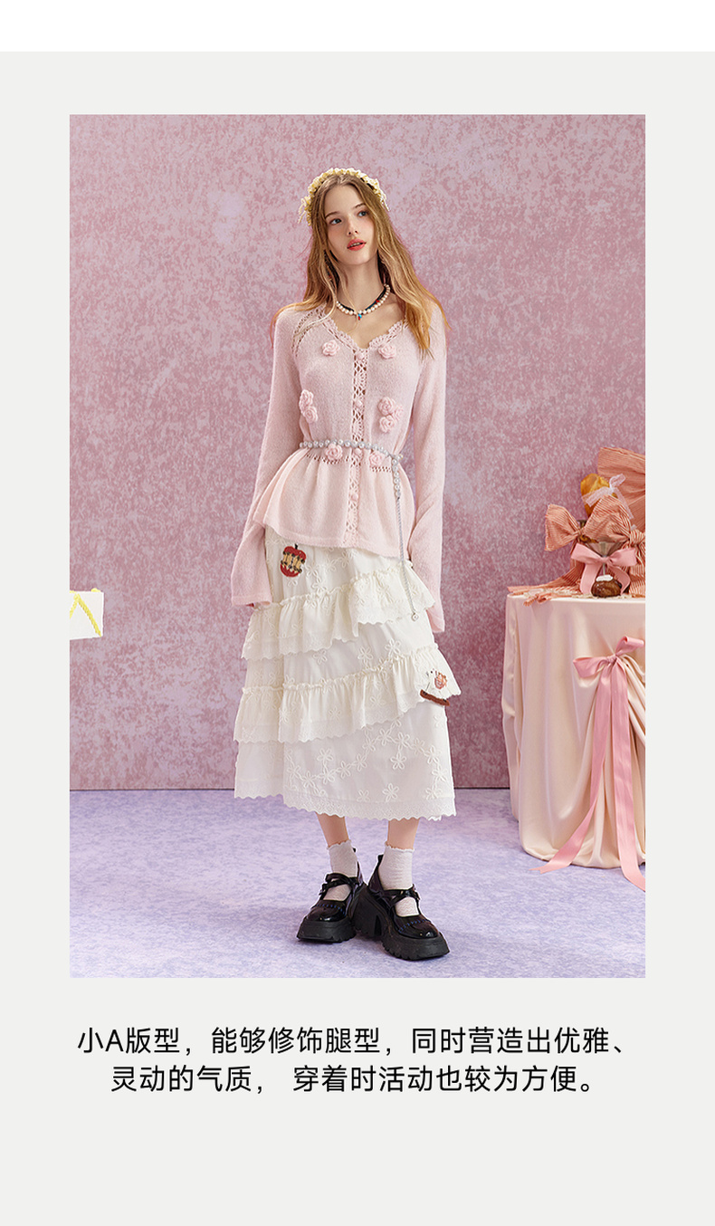 两三事 奶油涟漪 2025秋季新款立体刺绣章仔蕾丝拼接蛋糕裙半身裙