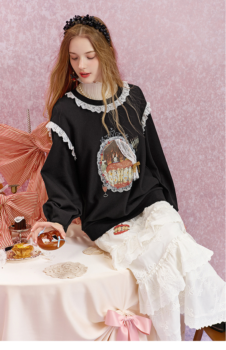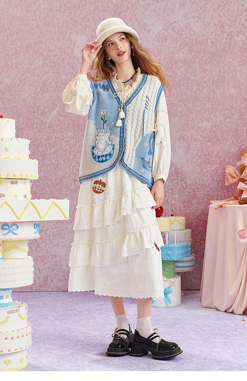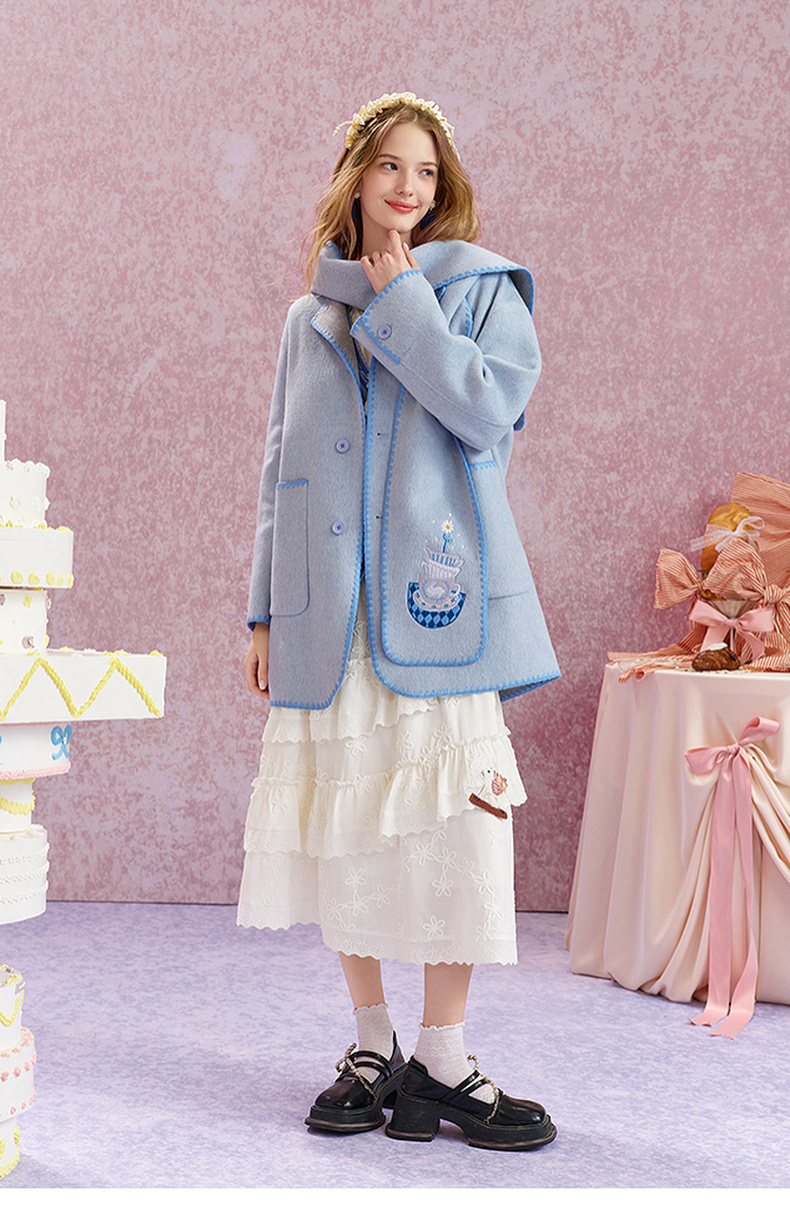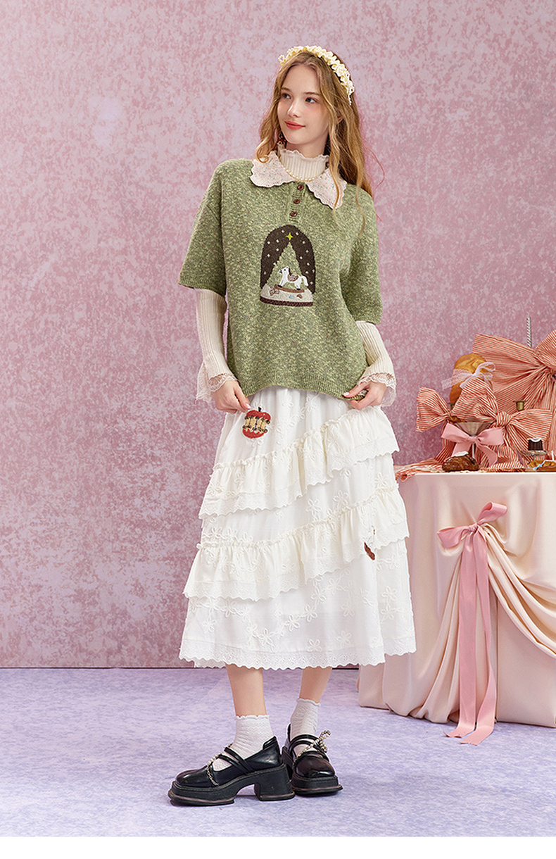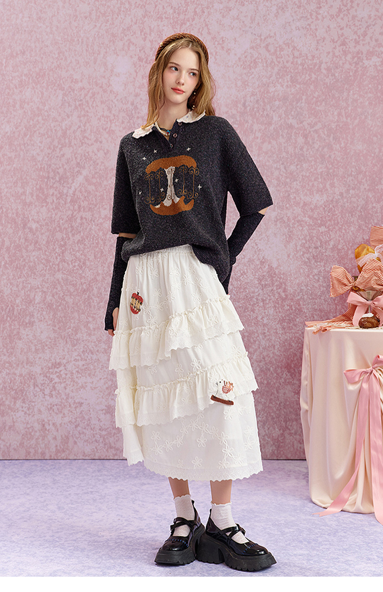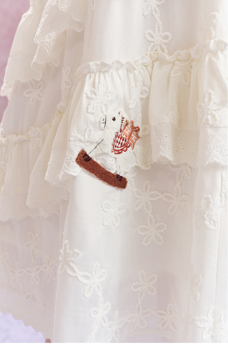 两三事 奶油涟漪 2025秋季新款立体刺绣章仔蕾丝拼接蛋糕裙半身裙