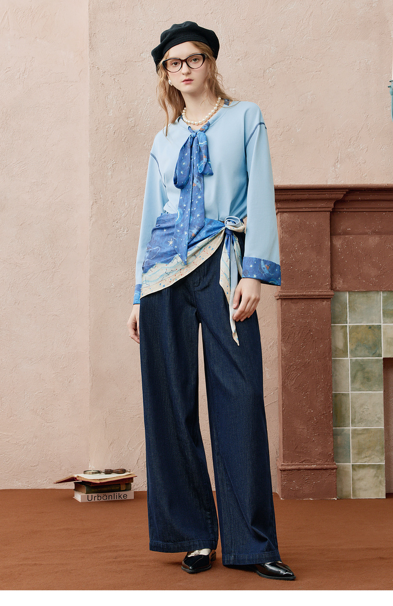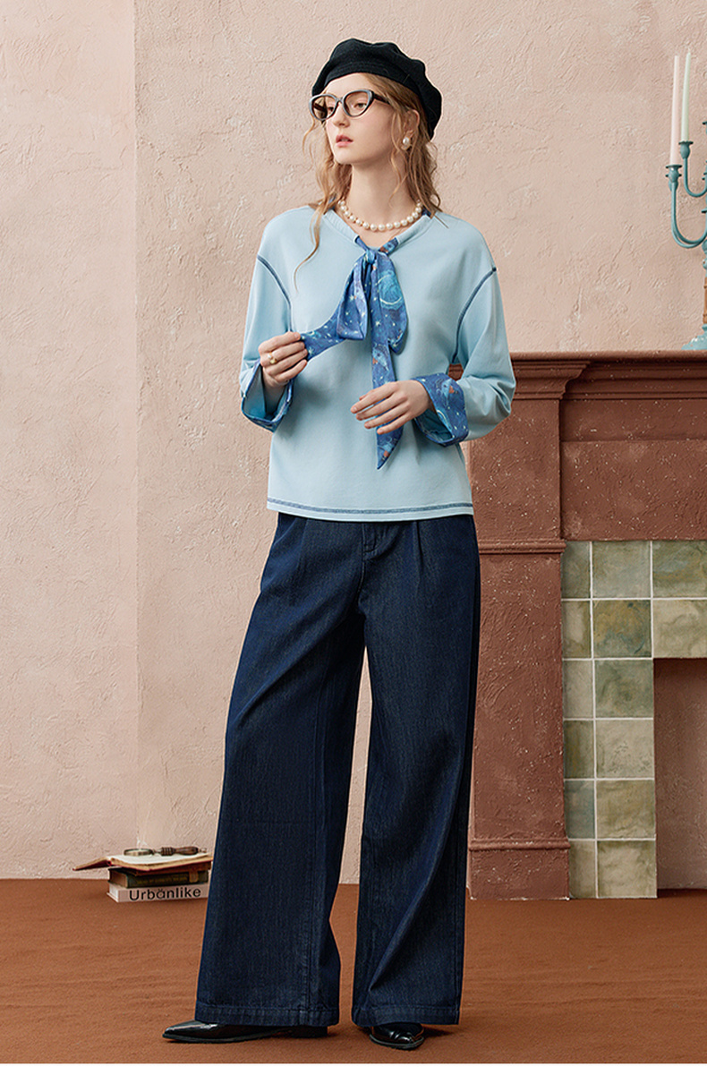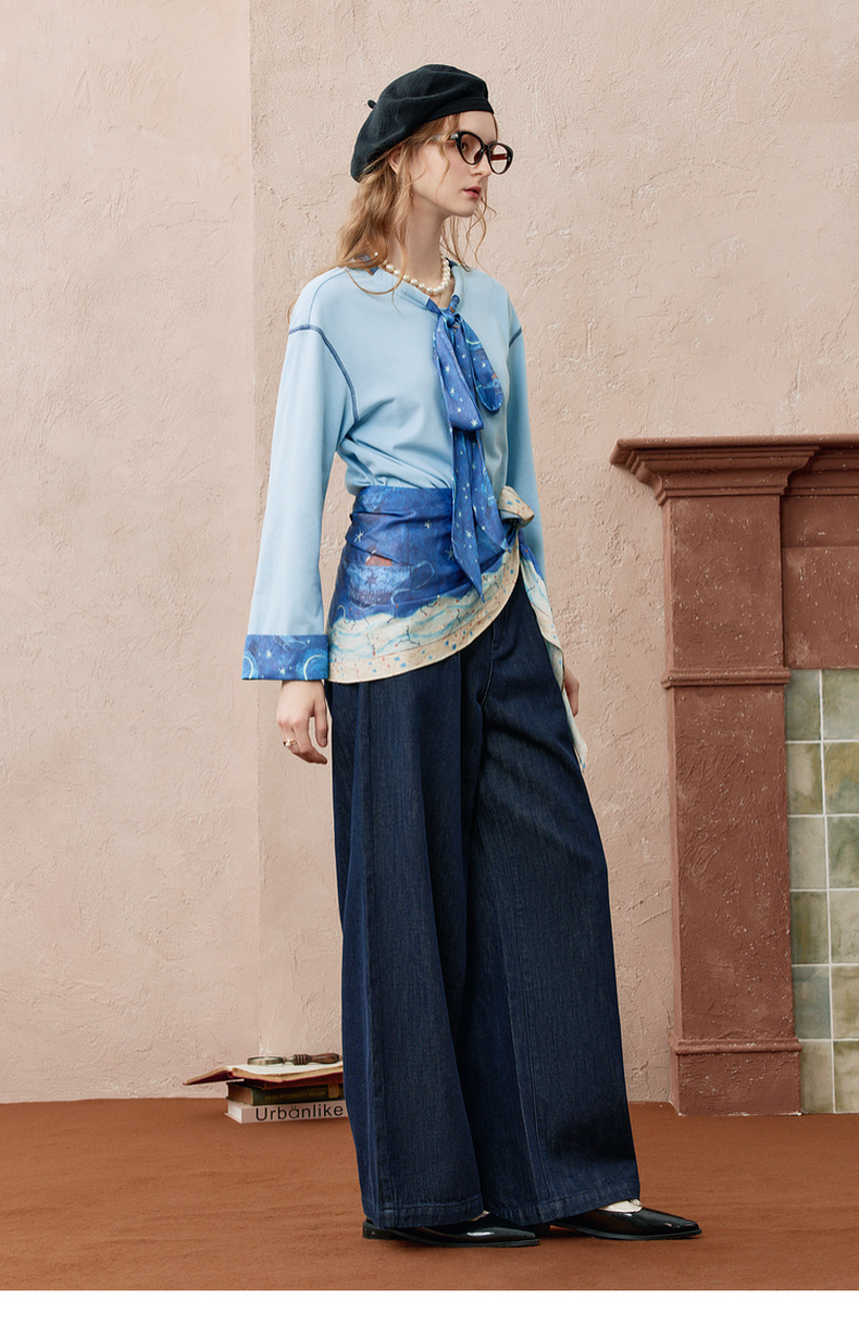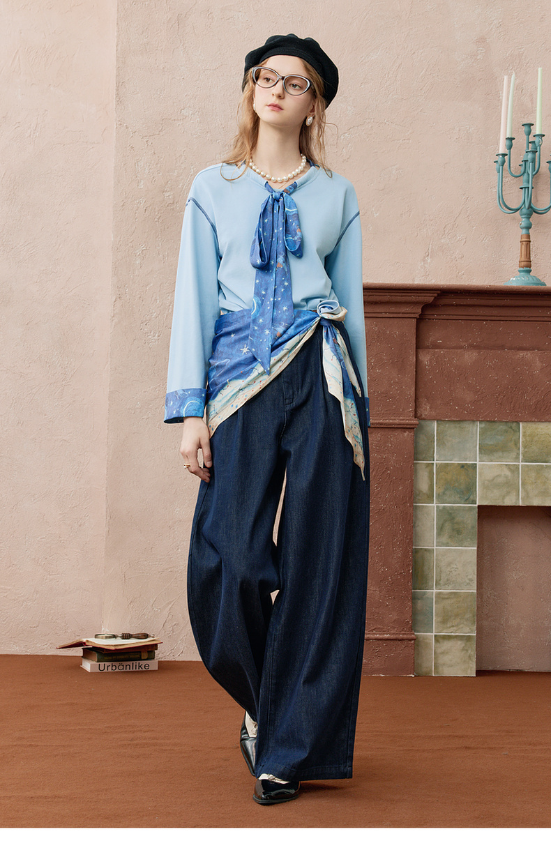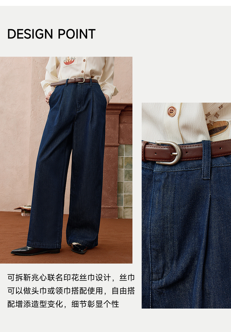 两三事 放牧星尘 2025秋季新款时尚可拆印花丝巾阔腿牛仔裤女