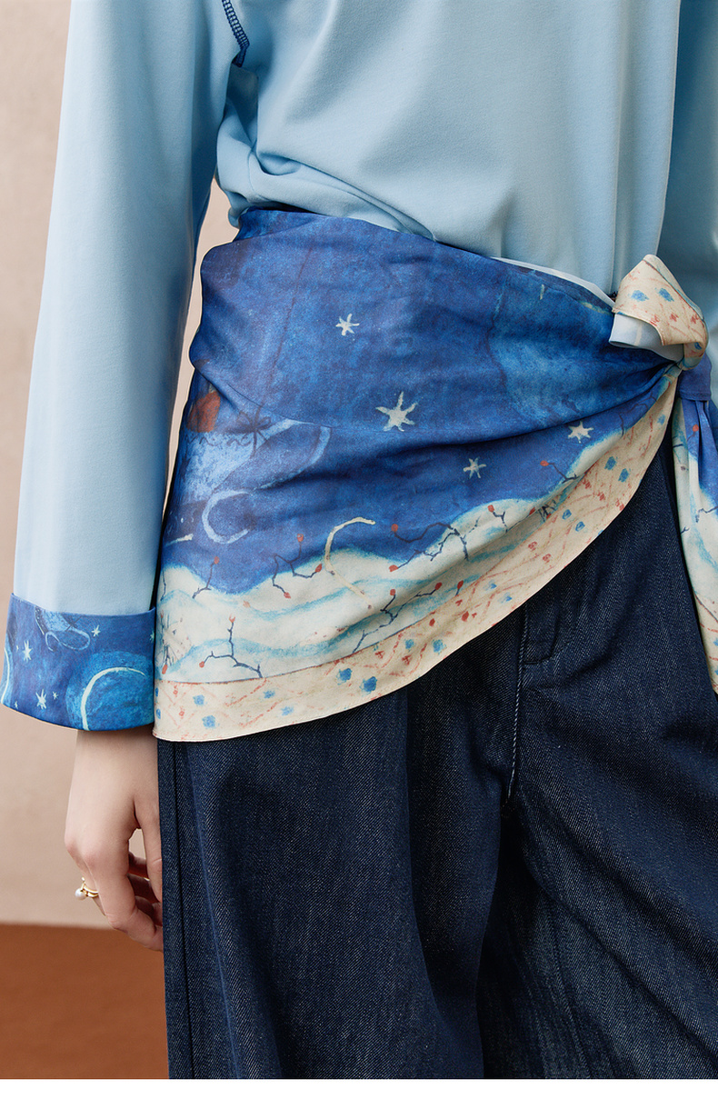 两三事梵高文艺 风过书页 2025冬季新款印花披肩拼接假两件衬衫女