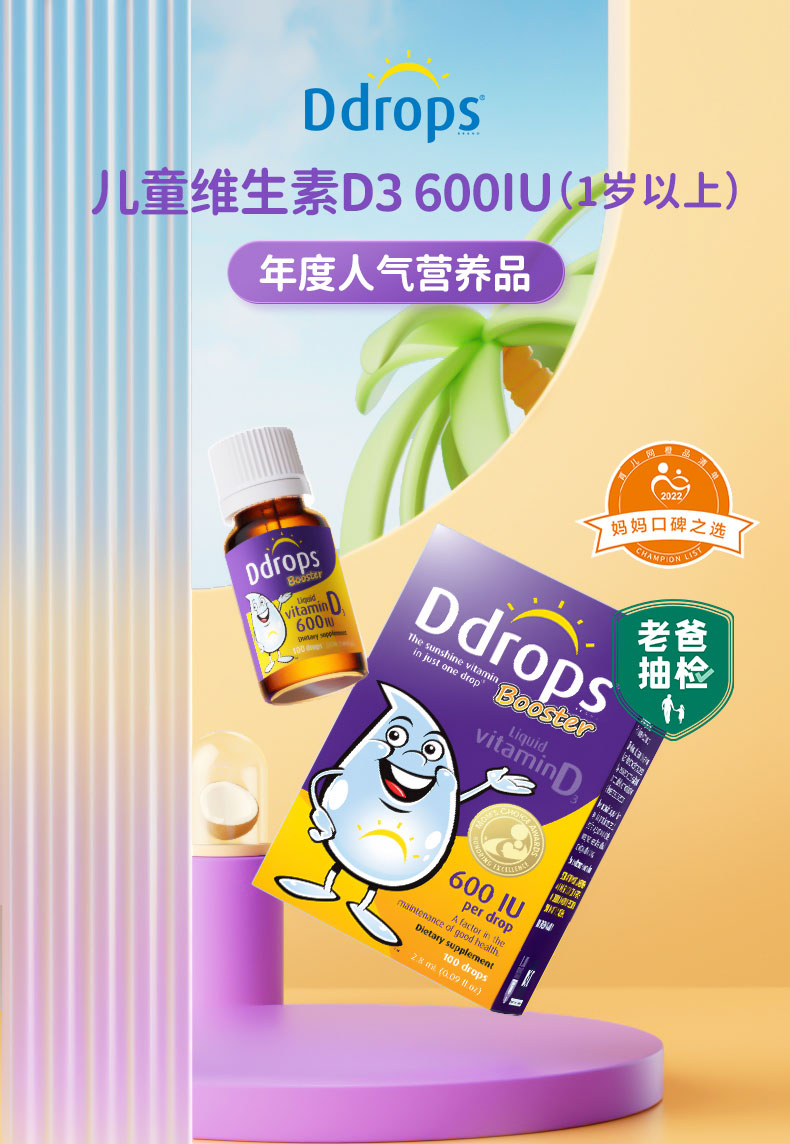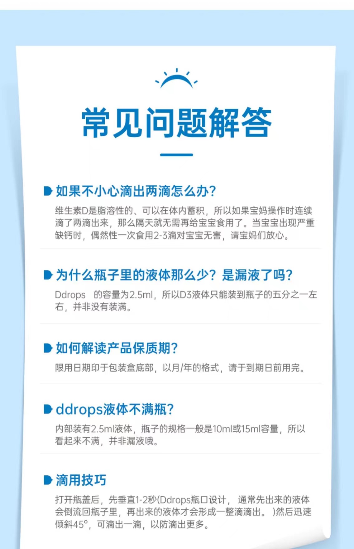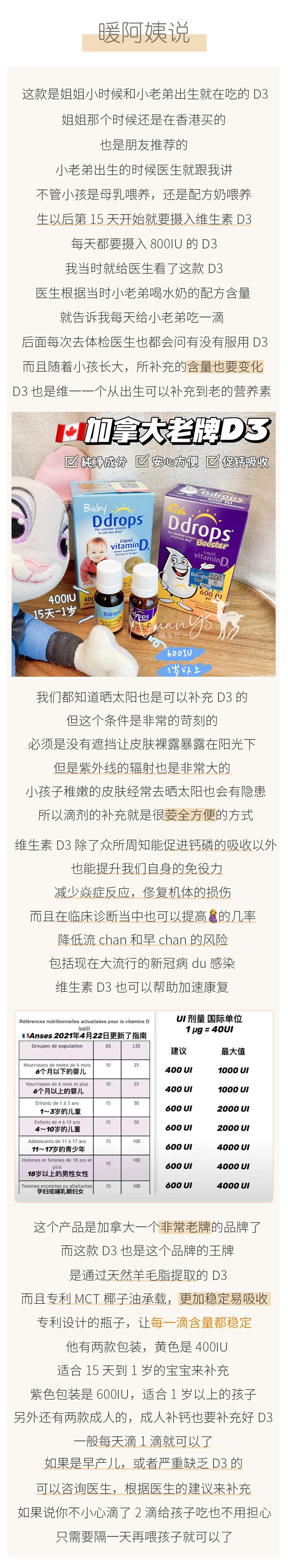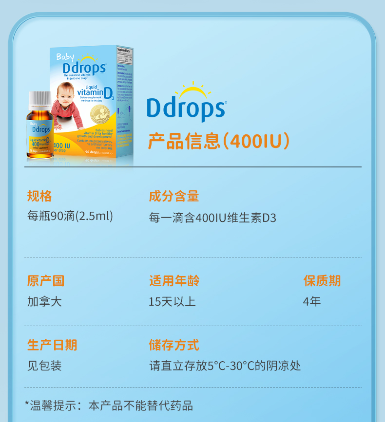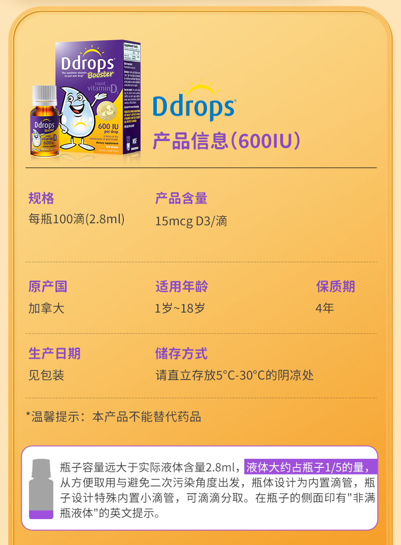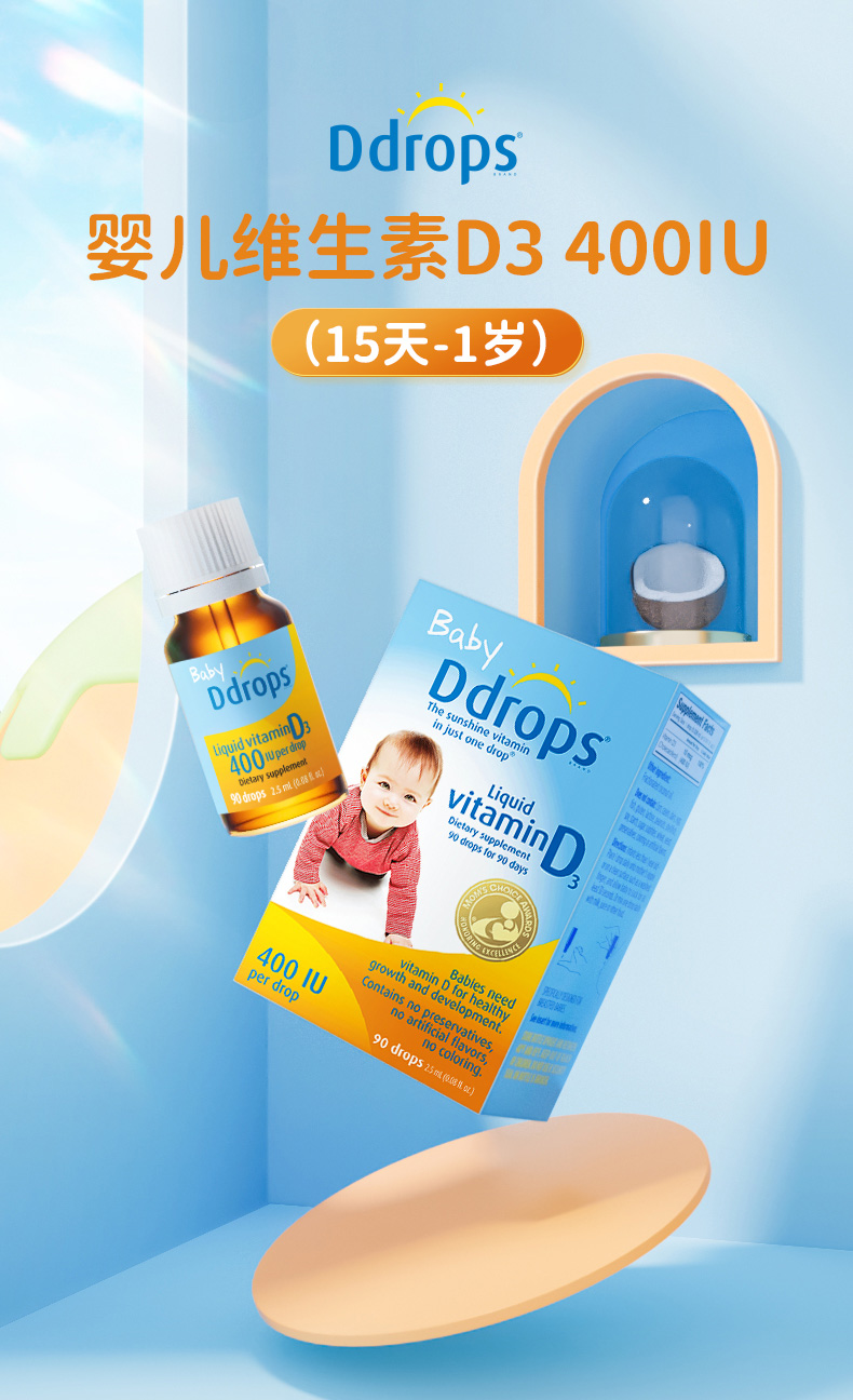 维生素D3 15天以上【成长必备 补钙】 D3滴剂 蓝瓶400IU/紫瓶600IU 加拿大Ddrops滴卓思