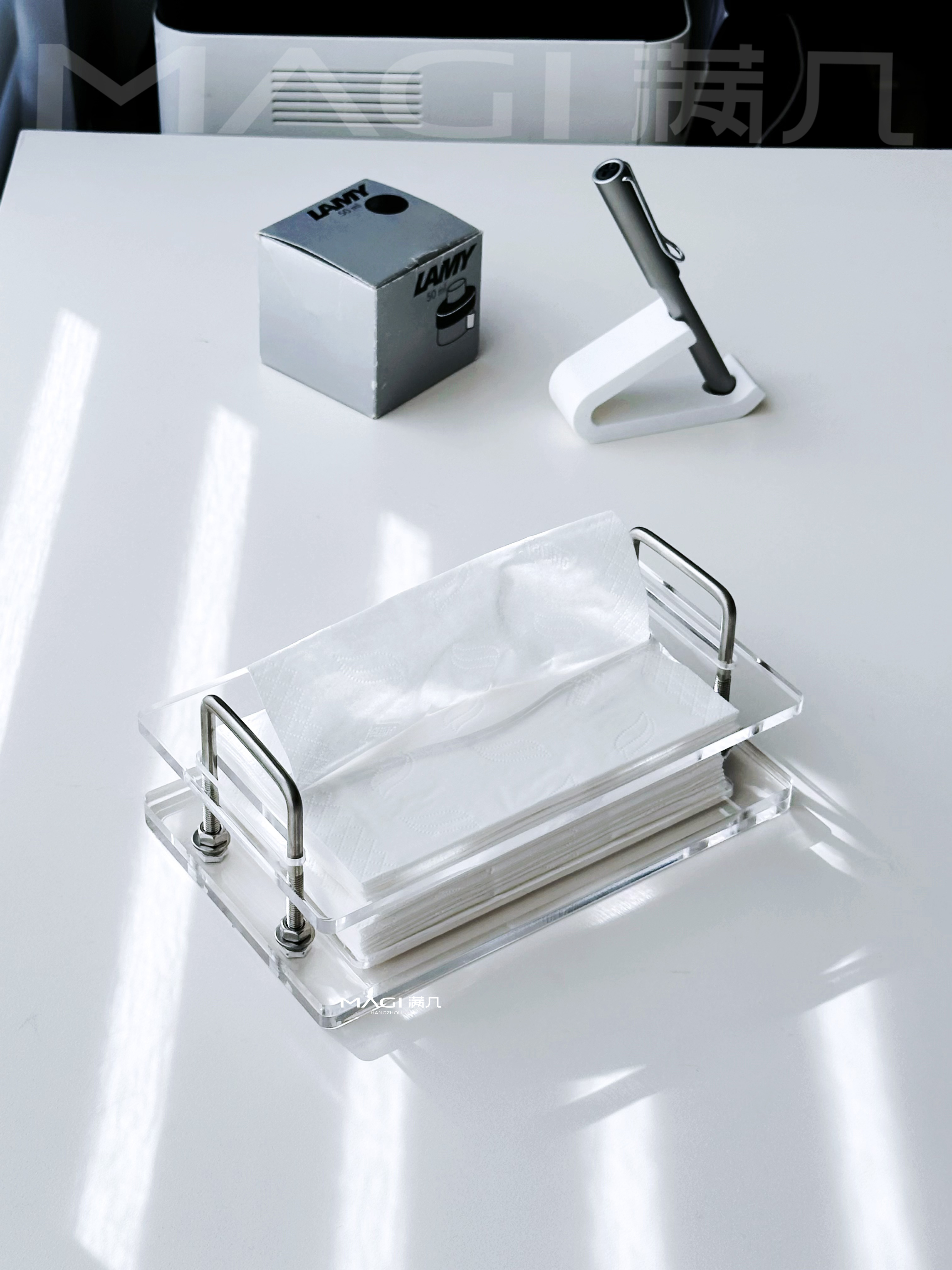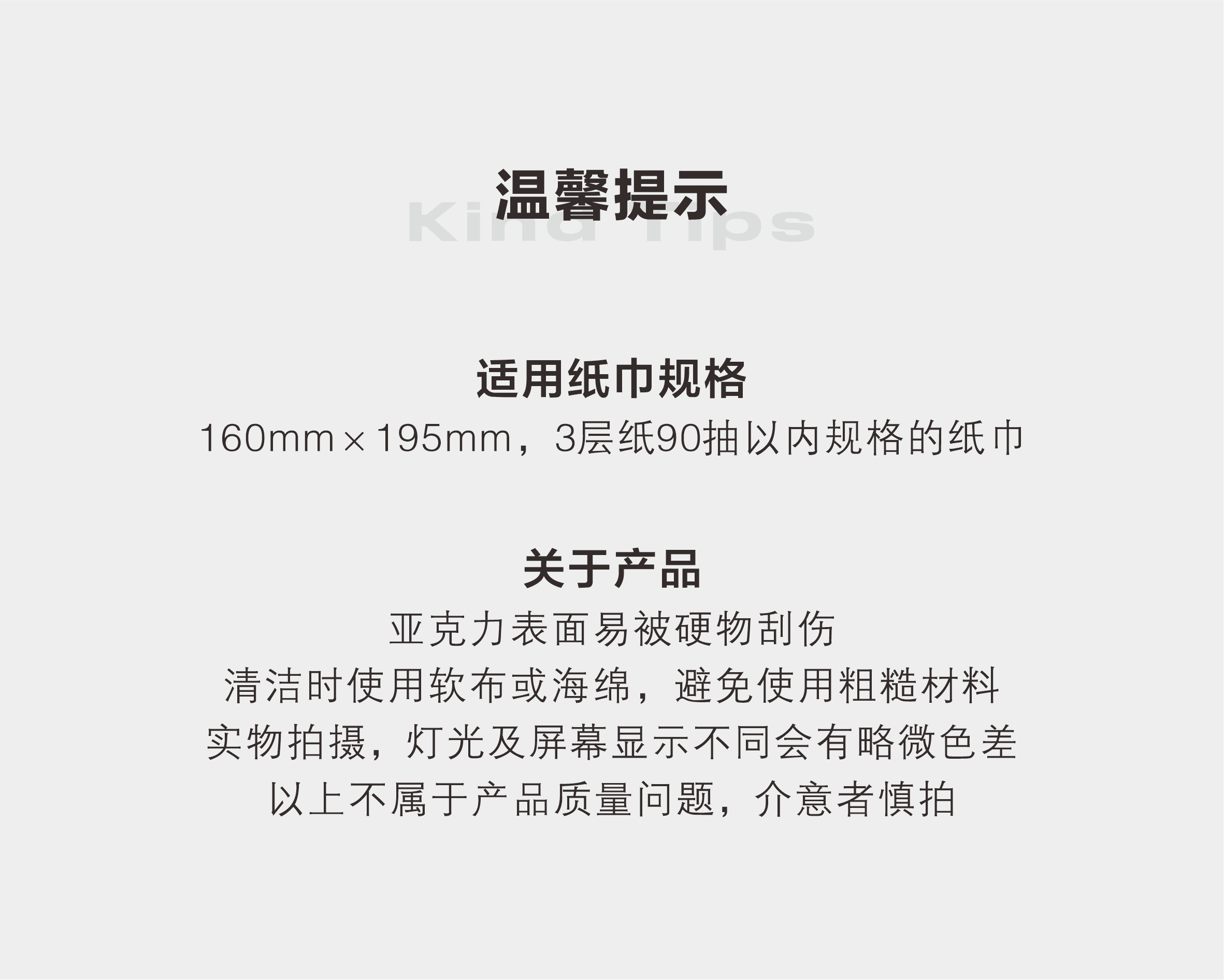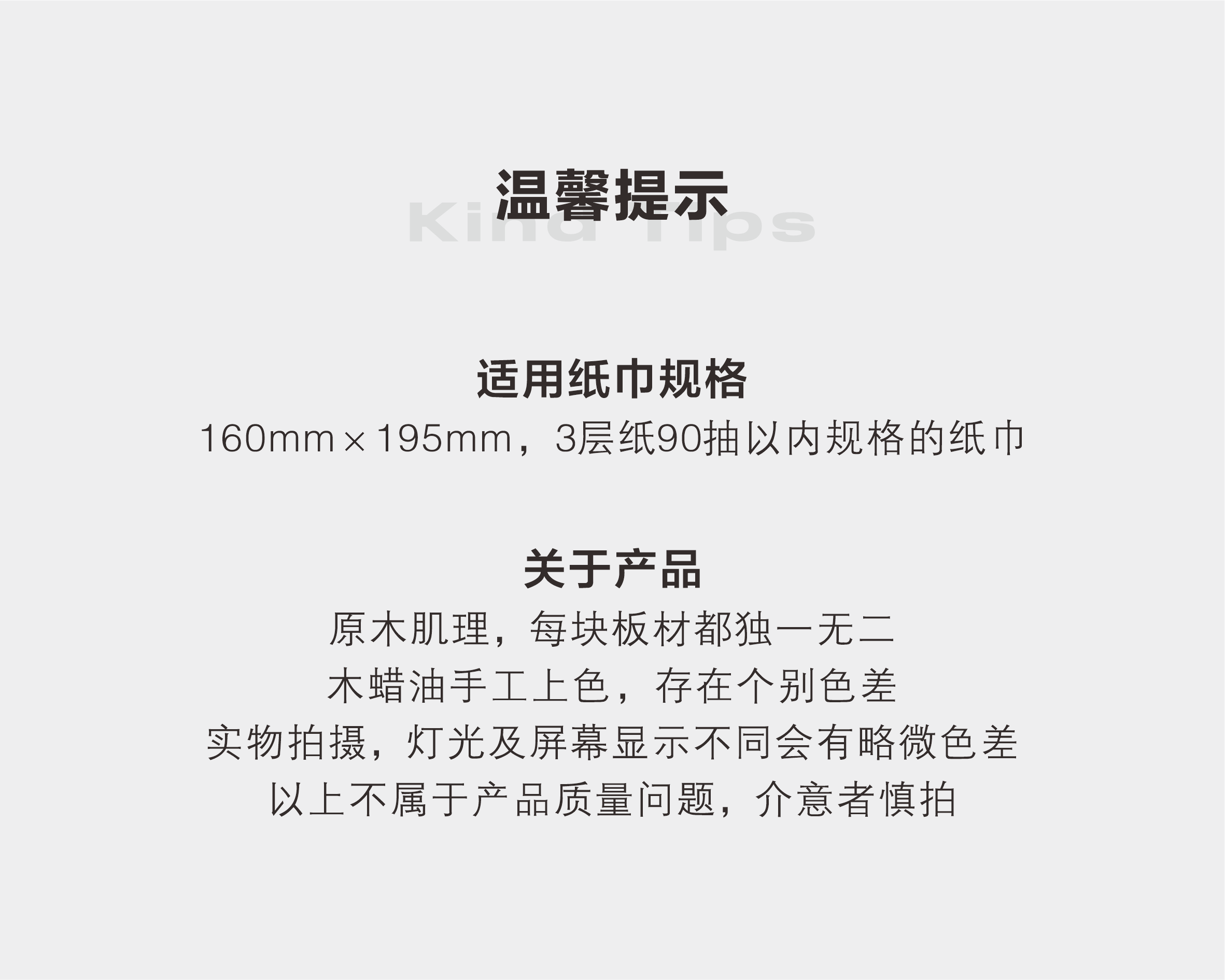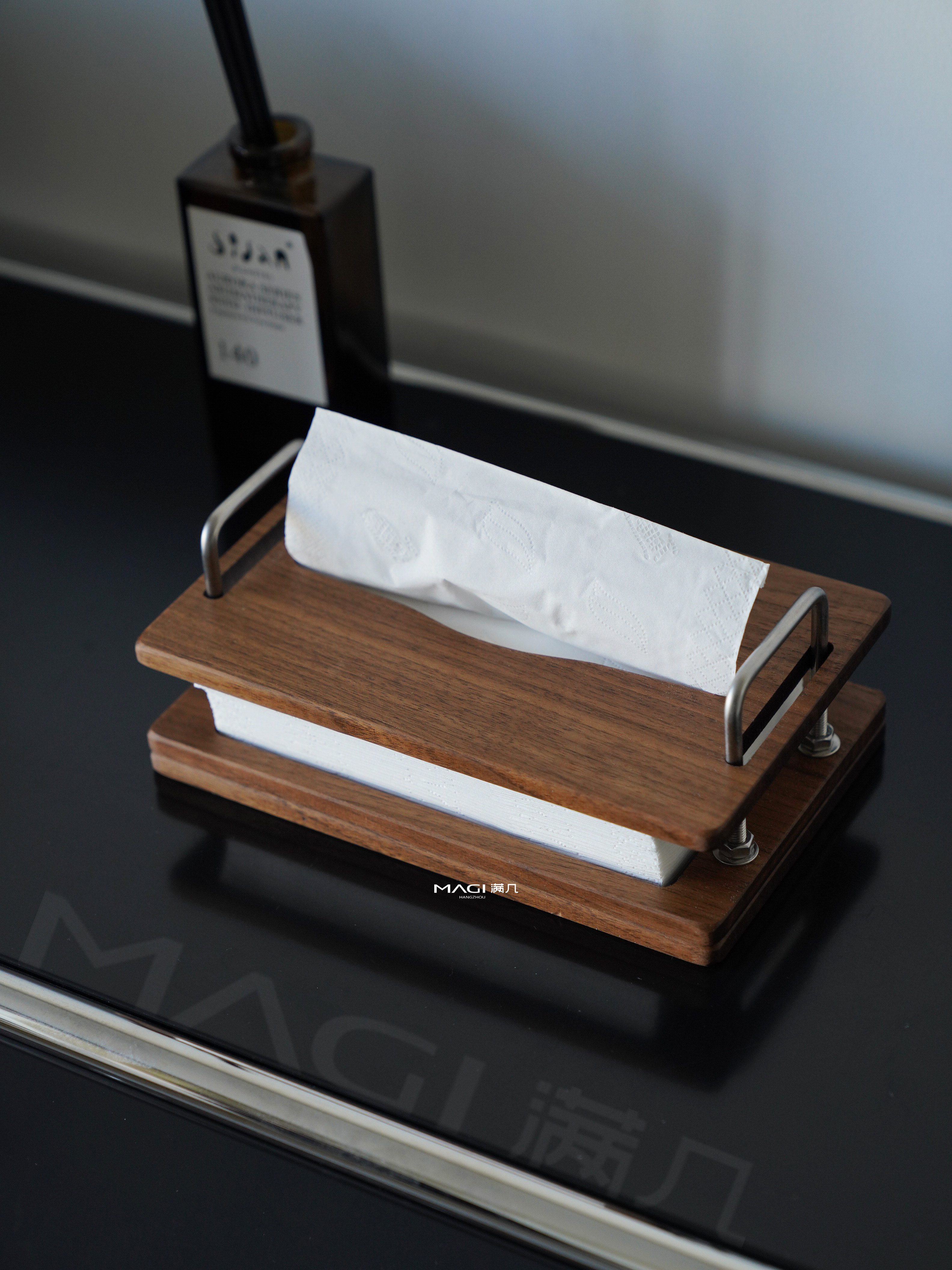 主打设计师原创,手工打造,选料健康无害,家居or办公搭配逼格拉满。取适量纸巾放入储纸盒(金属构件高度的三分之二处为最佳),再盖面板压盖抽出首张纸巾,物理自压设计,即可享受丝滑抽纸~