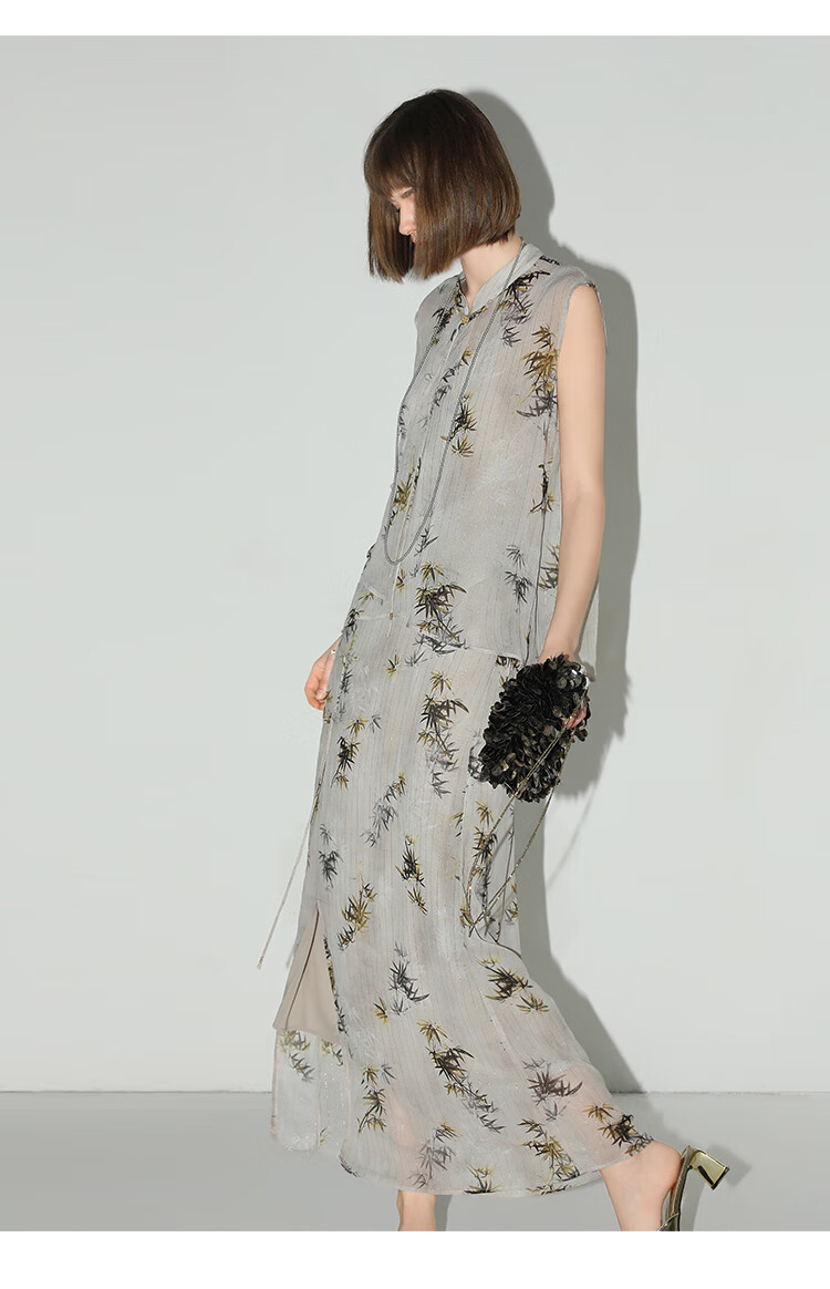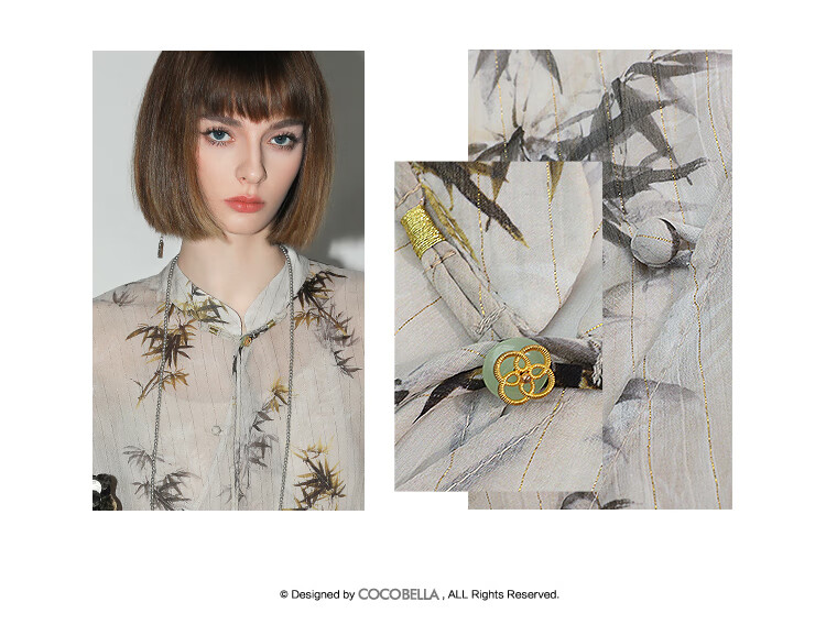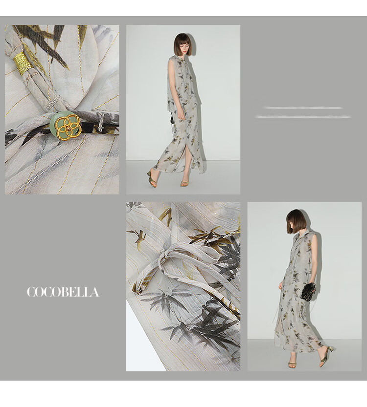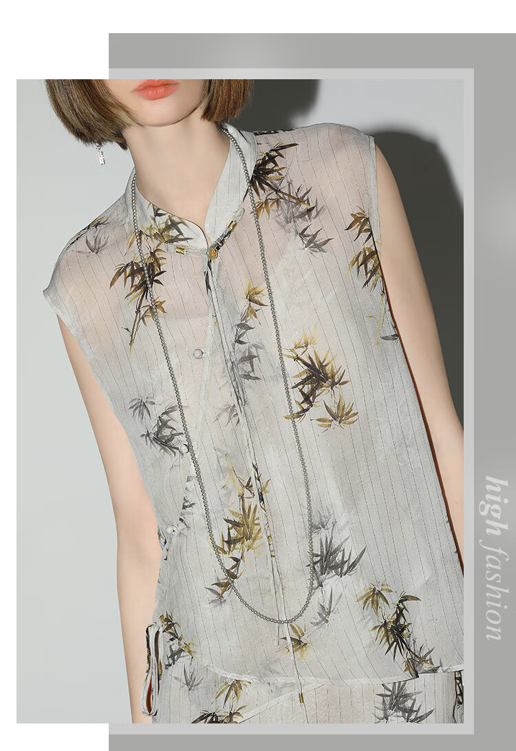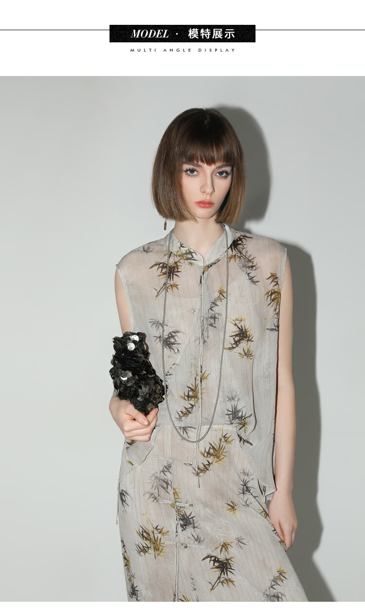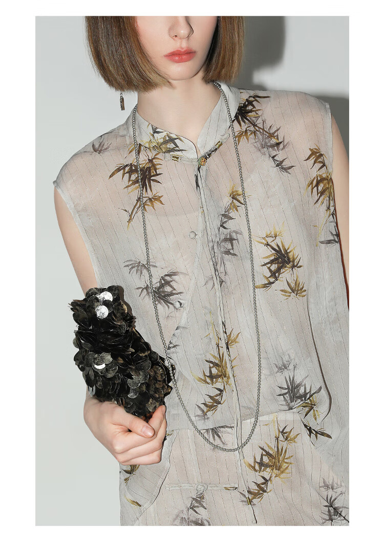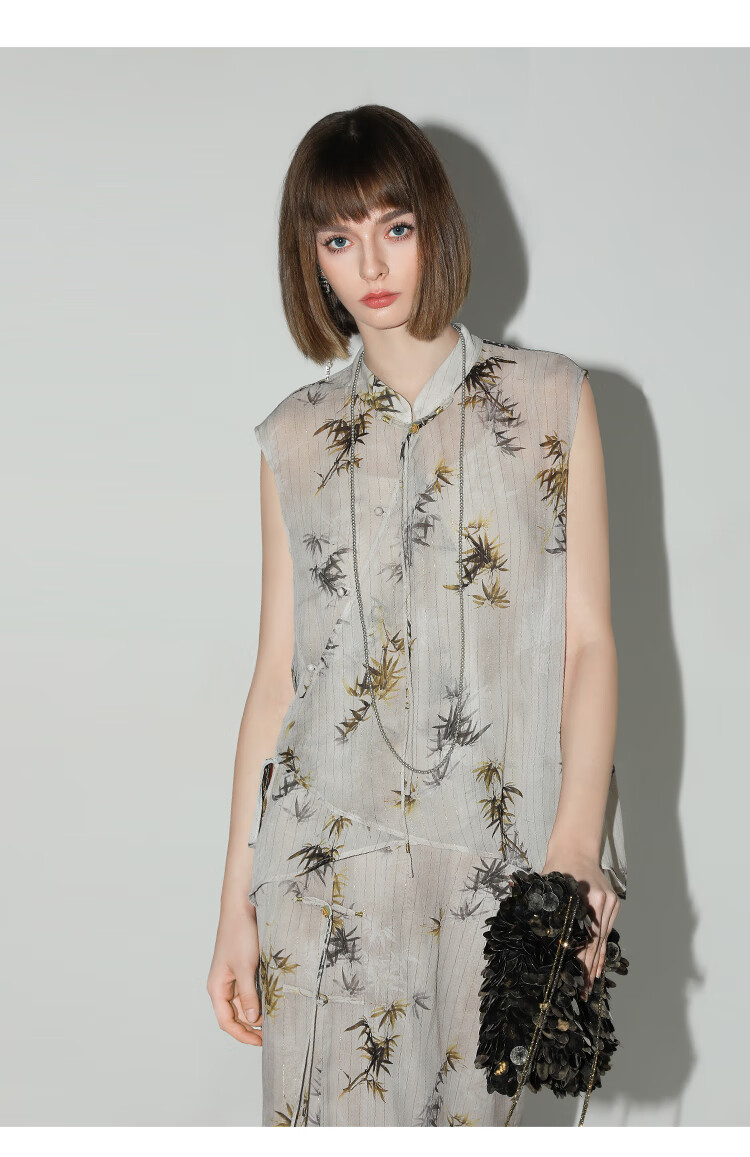 【秒杀】COCOBELLA新国风金丝竹叶印花无袖斜襟雪纺衫附吊带SR3052