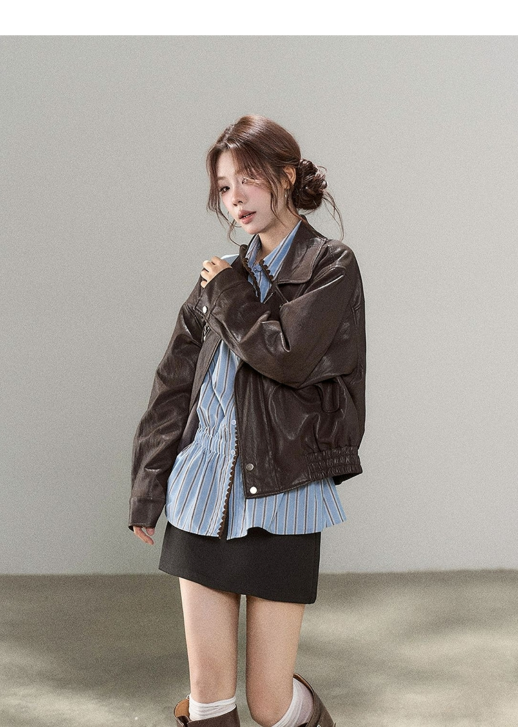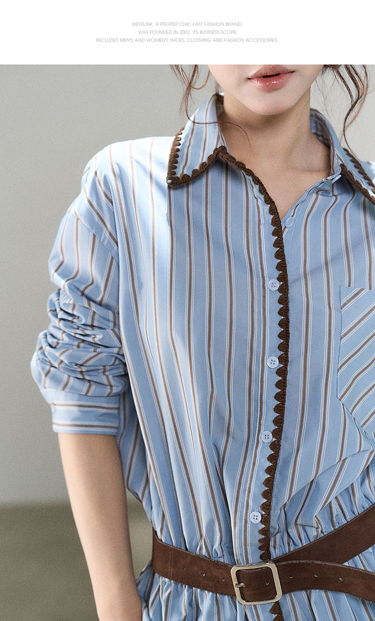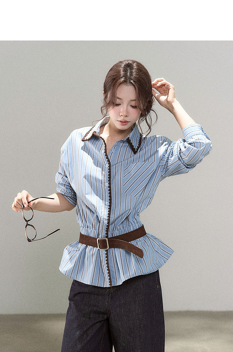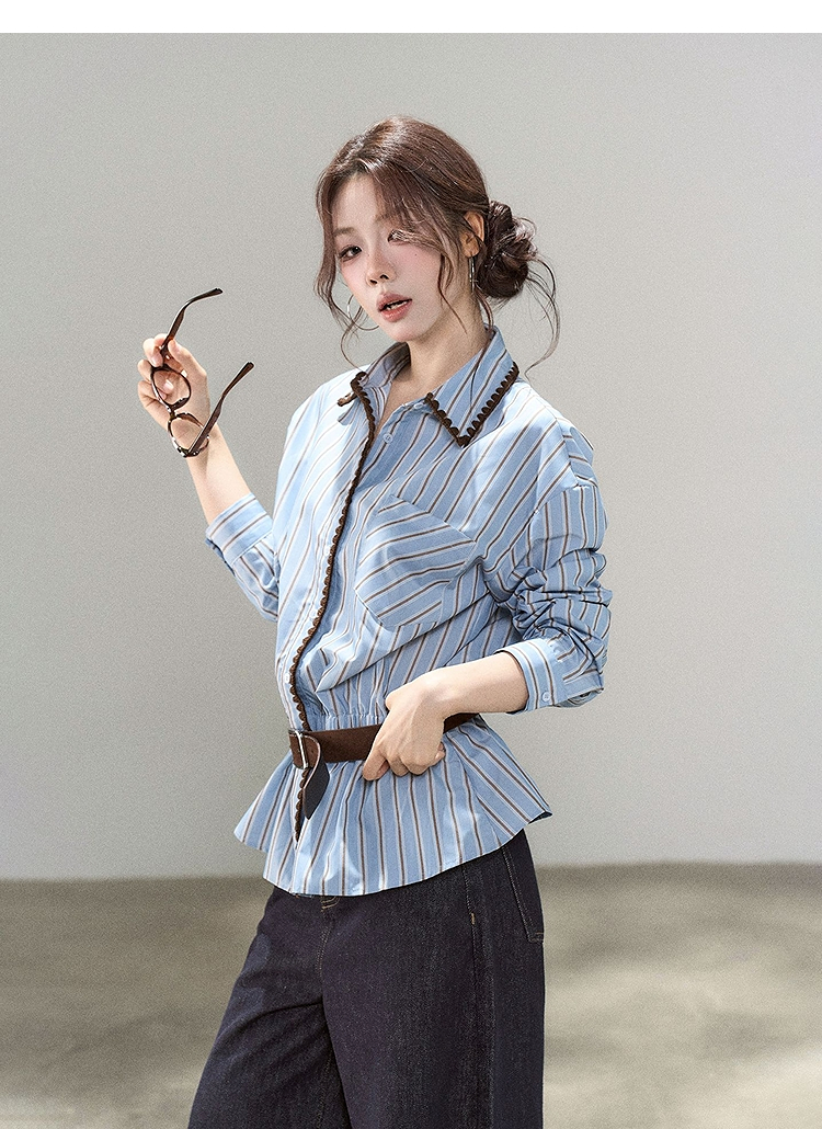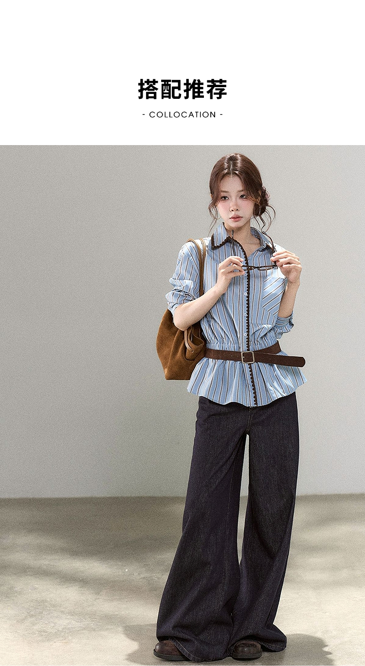 西遇独特花边条纹蓝色衬衫女2026年春季新款韩系chic宽松衬衣SS060070