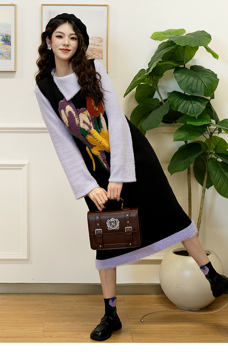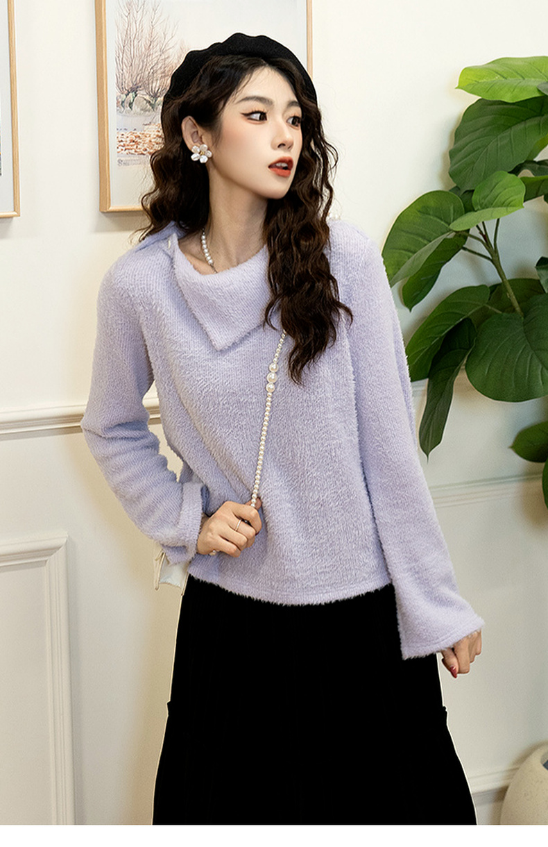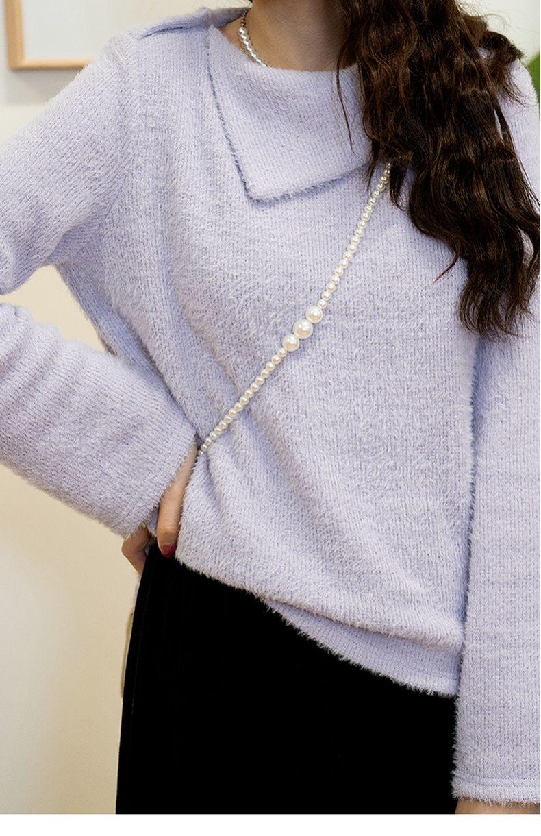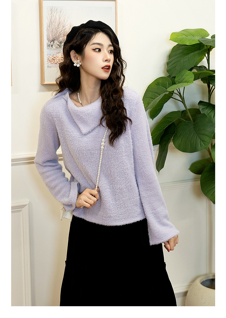 两三事 柔雾紫霞 2024秋季新款简约斜三角翻领套头毛衣女