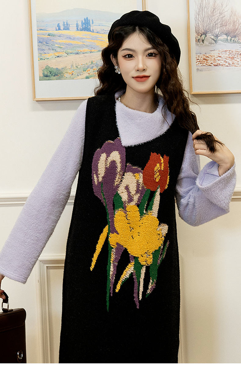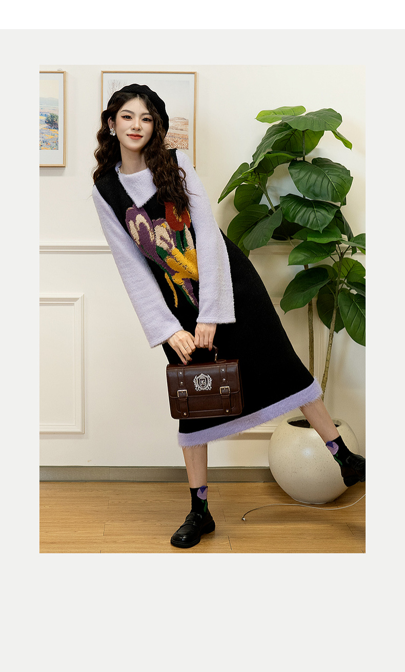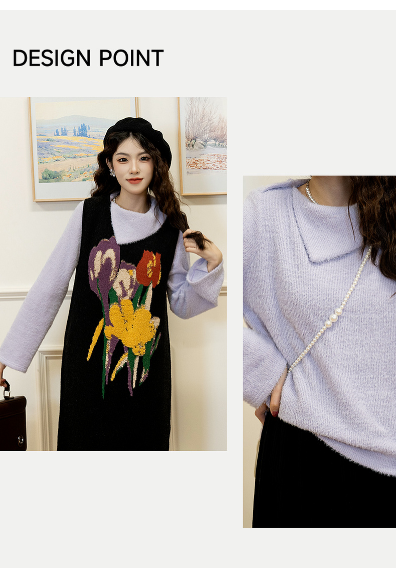 两三事 柔雾紫霞 2024秋季新款简约斜三角翻领套头毛衣女