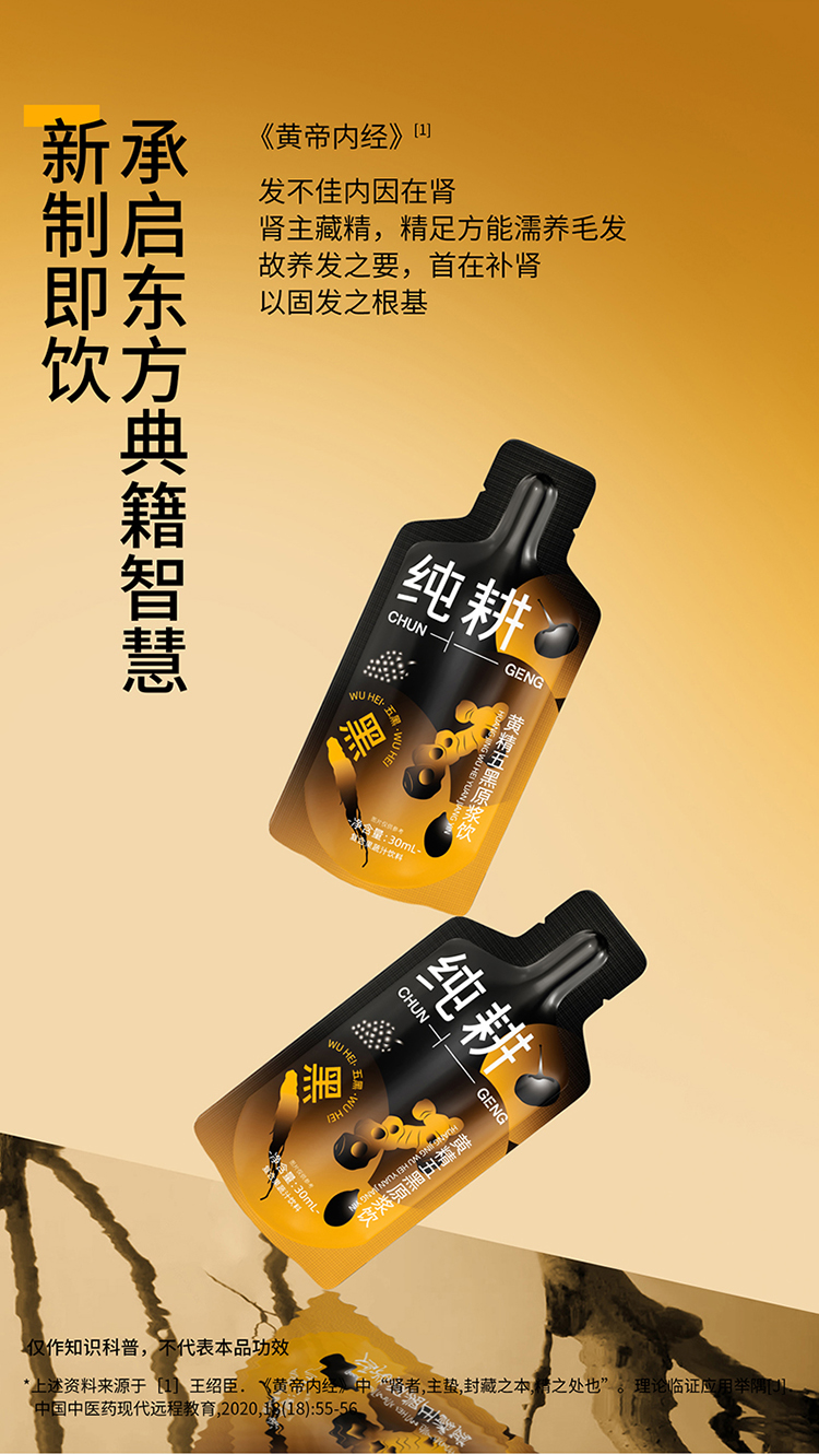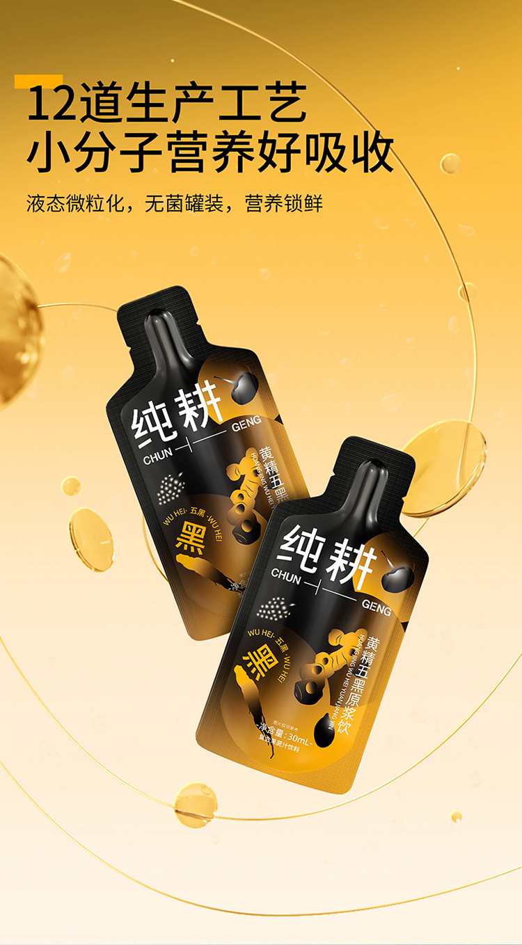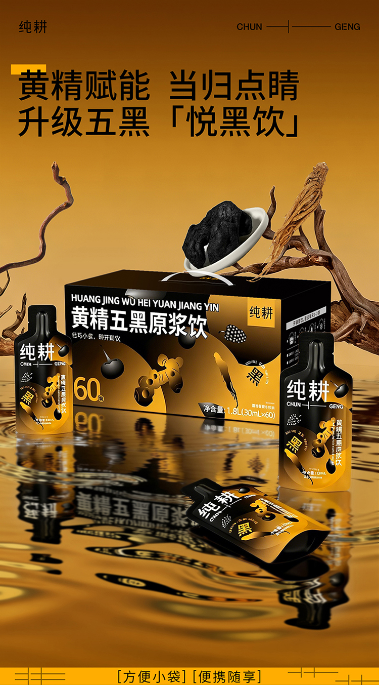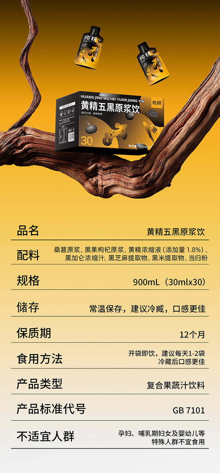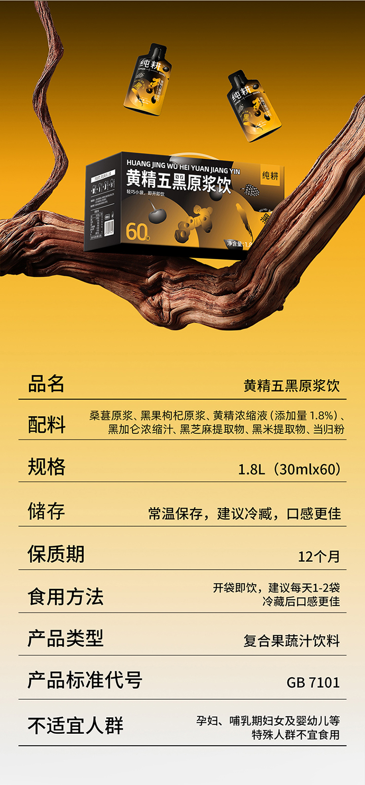 纯耕900ml(30袋)、1.8L(60袋)黄精五黑原浆饮;桑葚原浆黑枸杞原浆黑芝麻提取物黑米提取物黑加仑浓缩汁当归;黄精赋能 当归点睛升级五黑「悦黑饮」