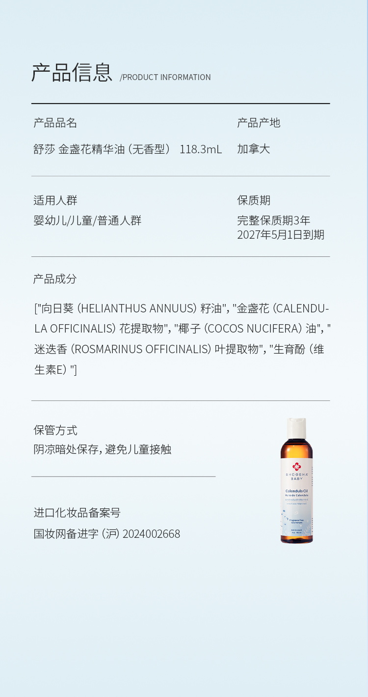 舒莎 金盏花精华油(无香型) 118.3mL 加拿大进口 保湿舒缓肌肤 婴幼儿/儿童/普通人群适用