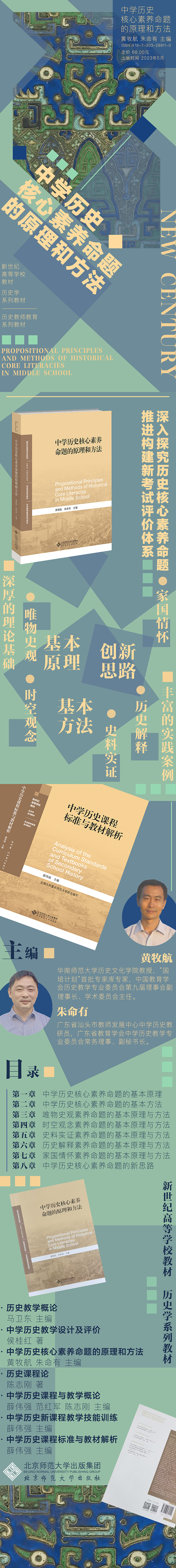 黄牧航,华南师范大学历史文化学院教授,“国培计划”首批专家库专家,中国教育学会历史教学专业委员会第九届理事会副理事长、学术委员会主任,广东省中小学教师继续教育专家委员会历史学科组长,广东教育学会中学历史教学专业委员会学术委员会主任,主要研究中学历史课程与教学论、历史教师教育。参与国家级、省级课题10多项,撰写、参编、主编著作近30部,主要有《高中历史教学与评价》《中学历史教材研究》《高中历史科学业评价体系研究》《历史试题编制原理与技术》《中学历史核心素养的教学与评价》《时空观念的教学设计与学业评价》等。