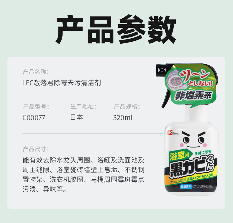 【清仓特惠7折】LEC浴室卫生间浴缸马桶周边去斑霉菌洗衣机密封圈除霉剂320ML