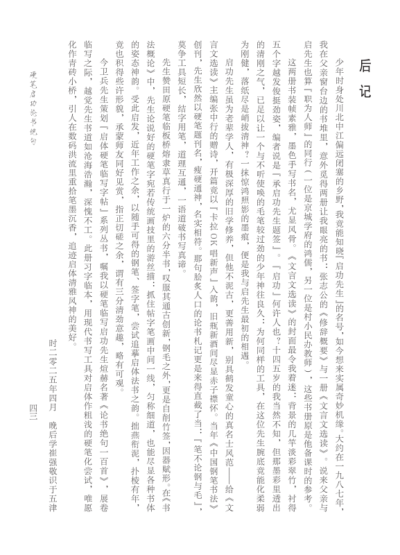 崔强,四川德阳人,现居成都。北京启功艺术研究会会员,四川省硬笔书法协会会员。以硬笔书体见长,拥有广泛的人脉,其启体硬笔,形神皆备,体现启体精髓,受广大硬笔书法爱好者推崇。