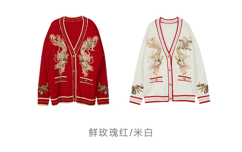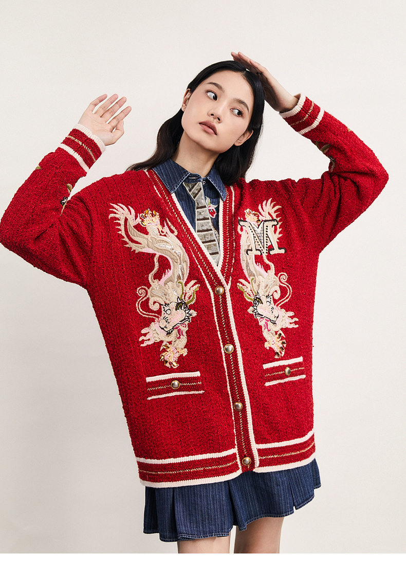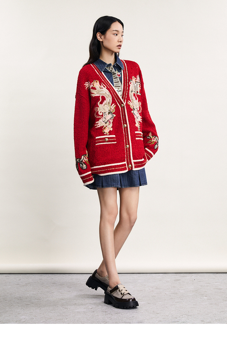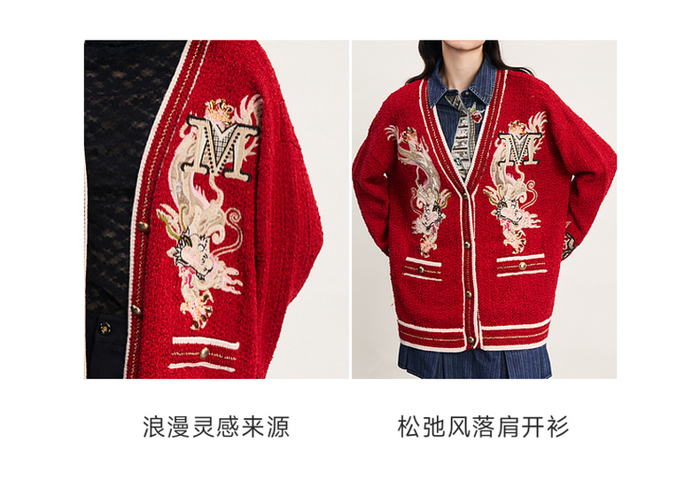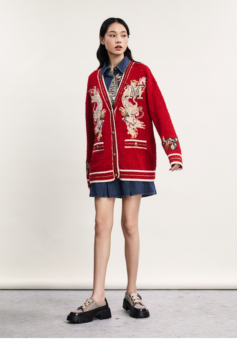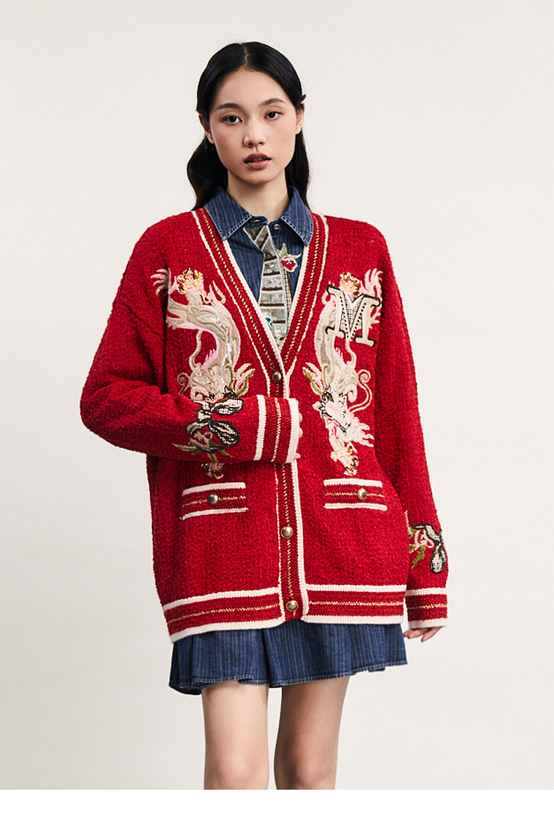 谜底新年红针织开衫女2024春新款V领中国龙绣花毛衣外套241MZ0317