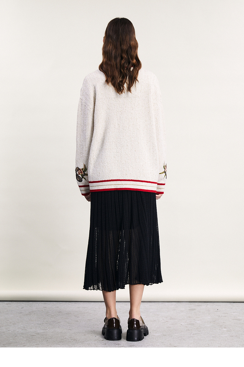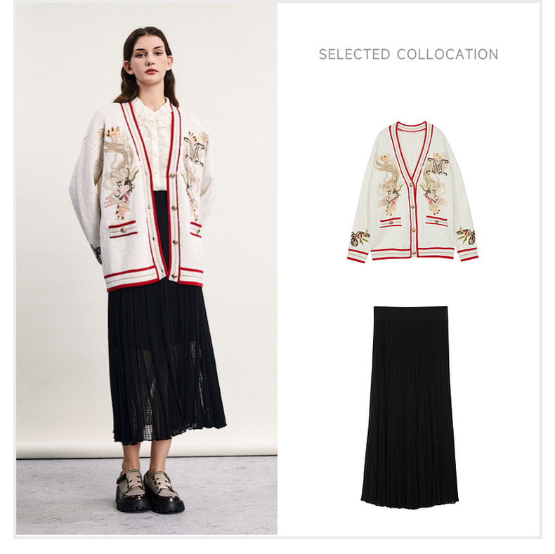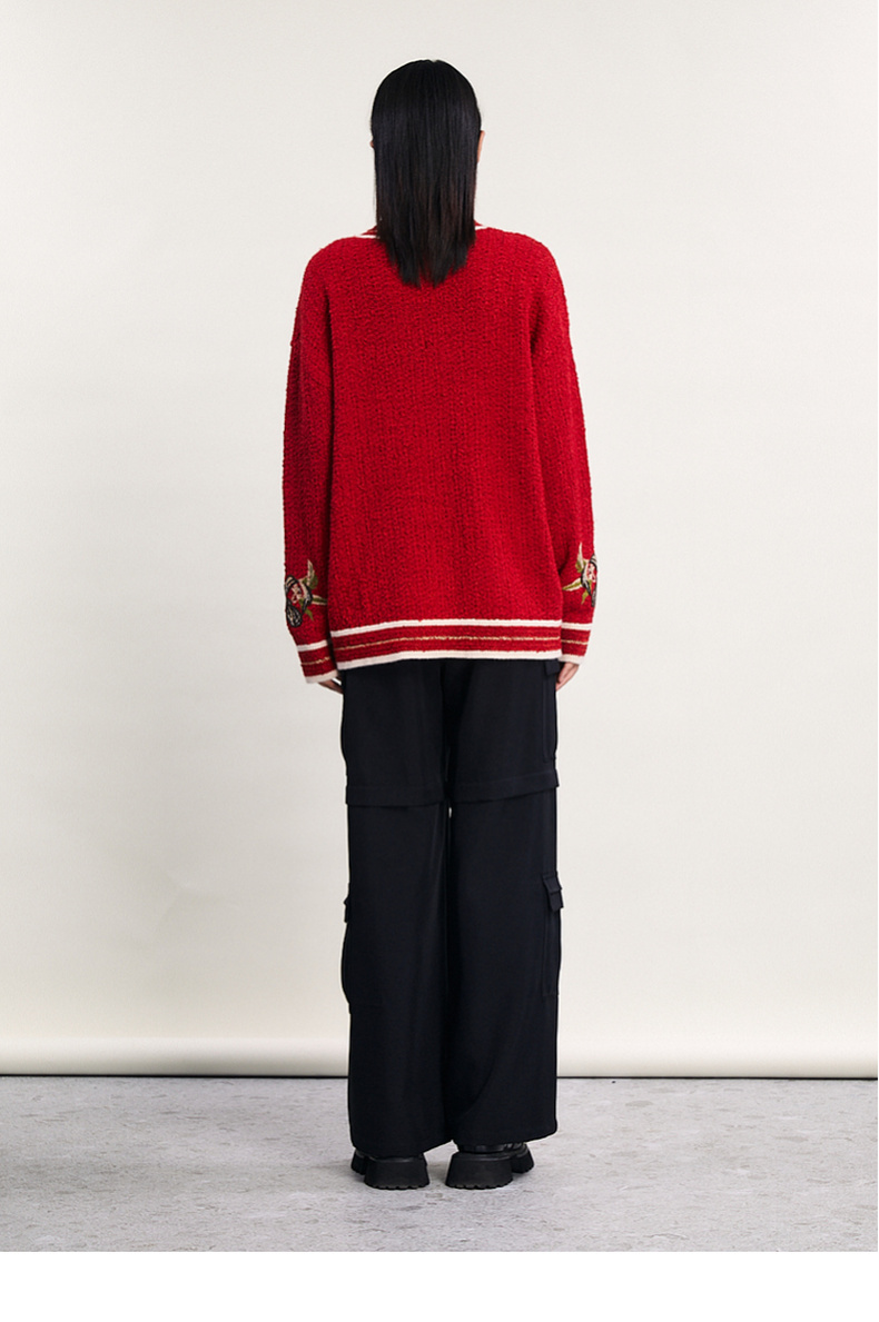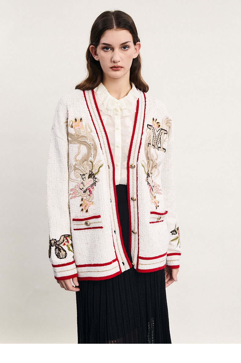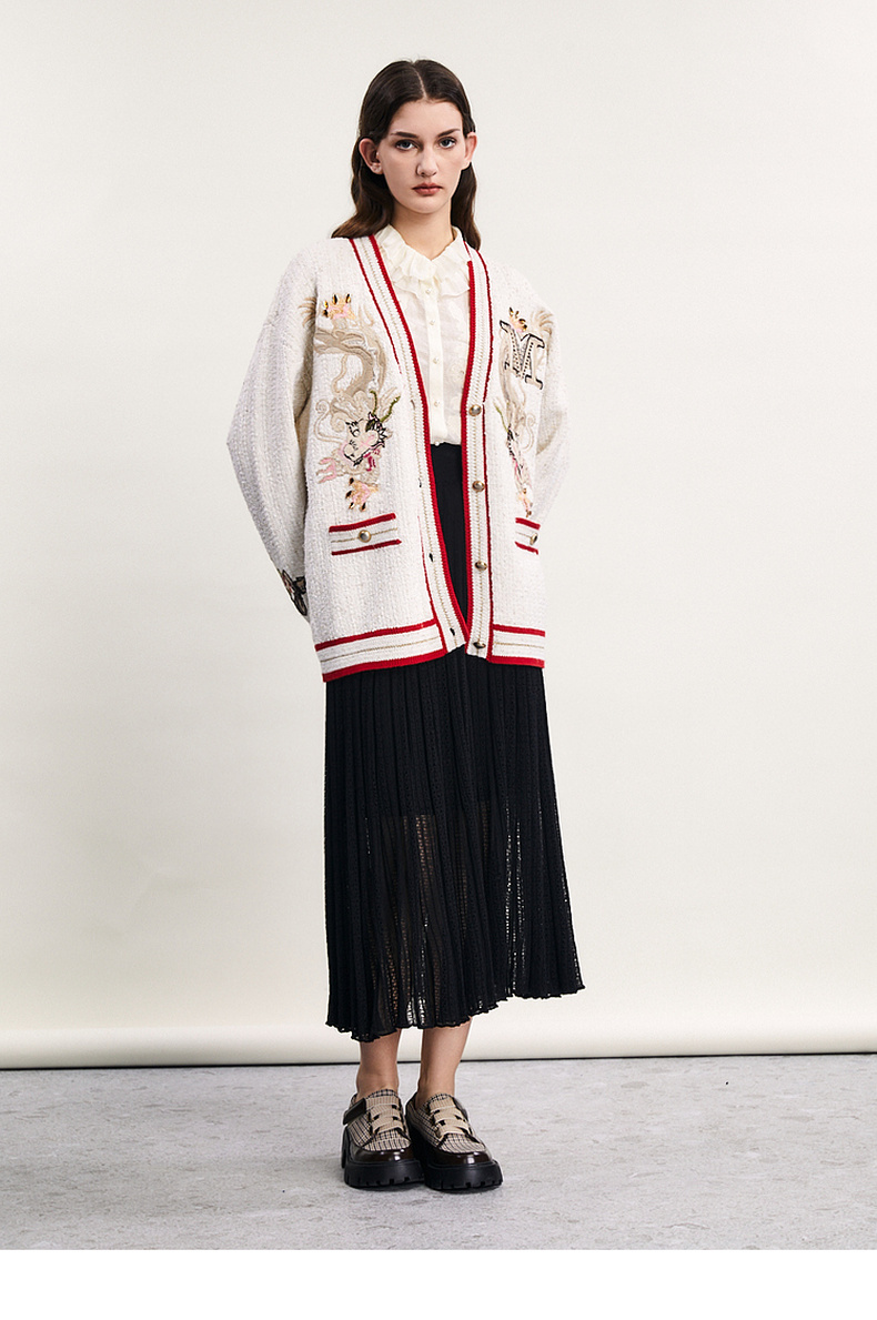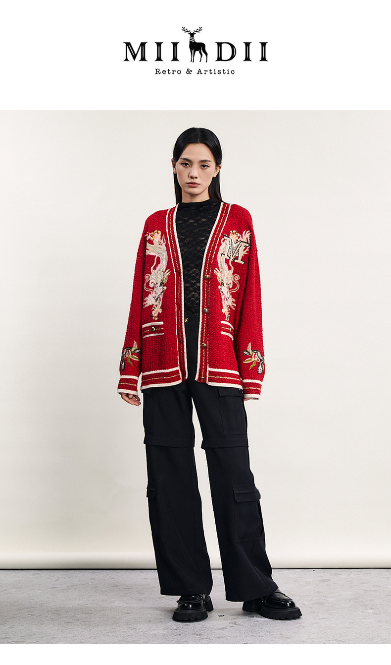 谜底新年红针织开衫女2024春新款V领中国龙绣花毛衣外套241MZ0317