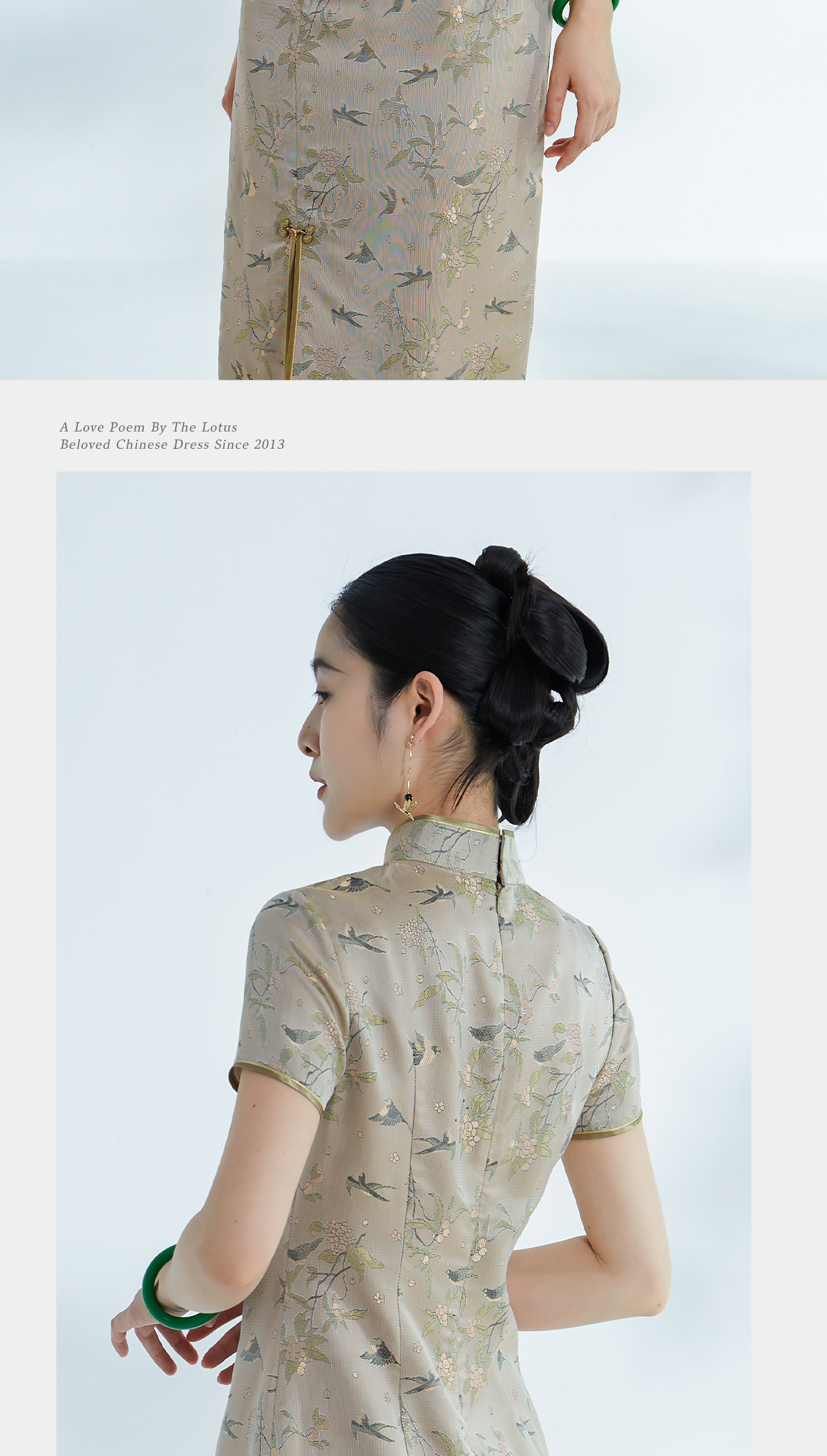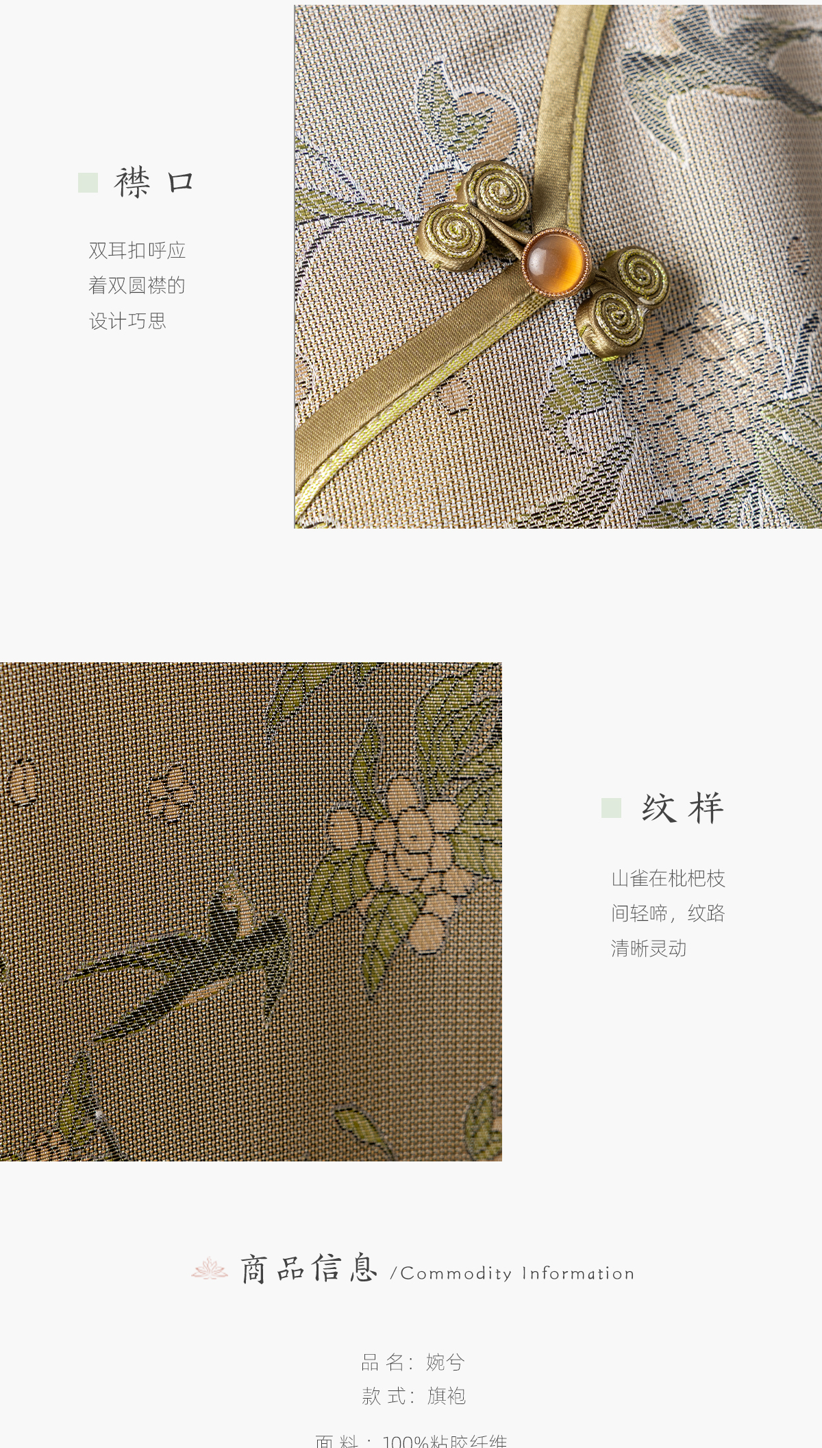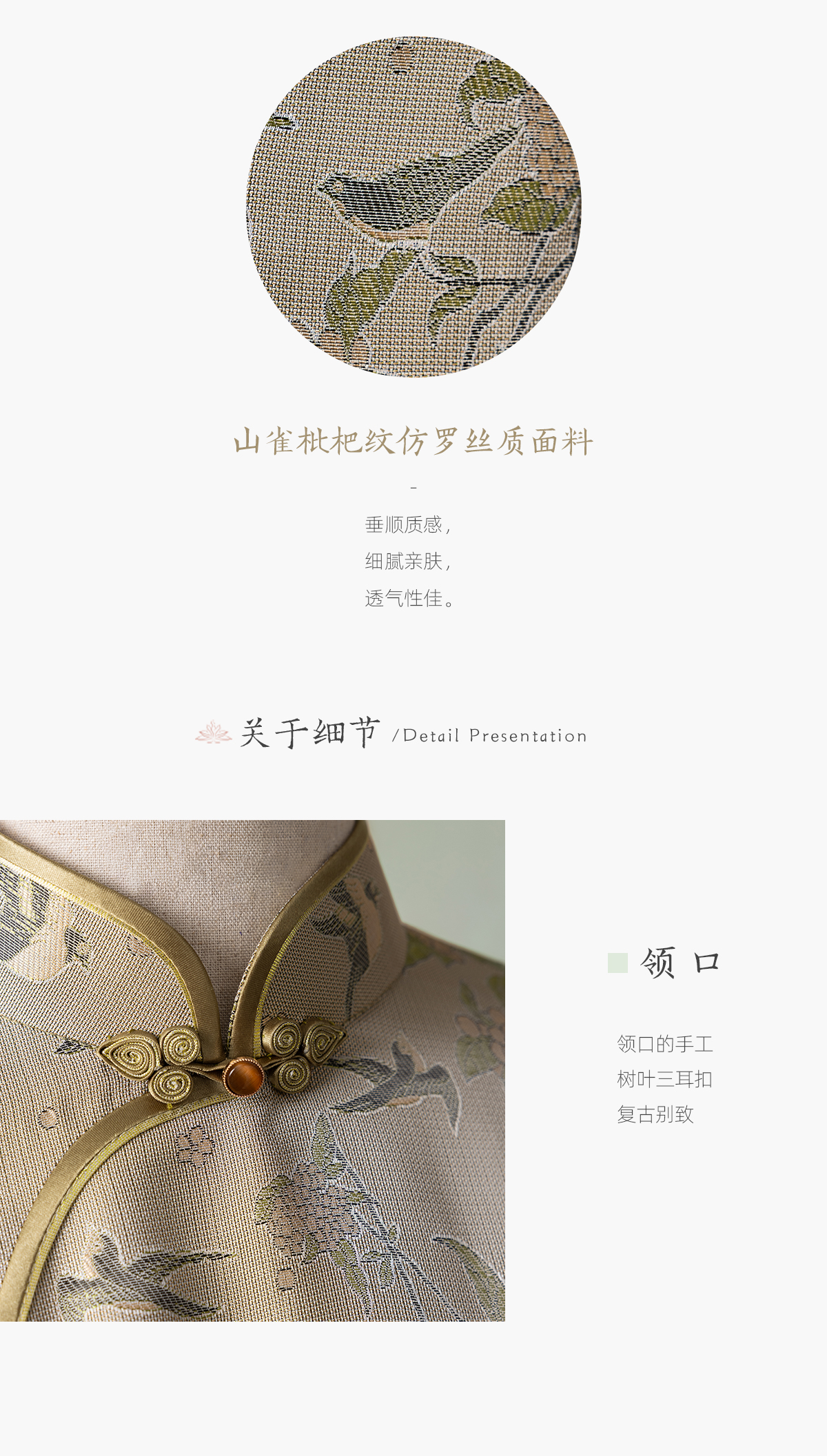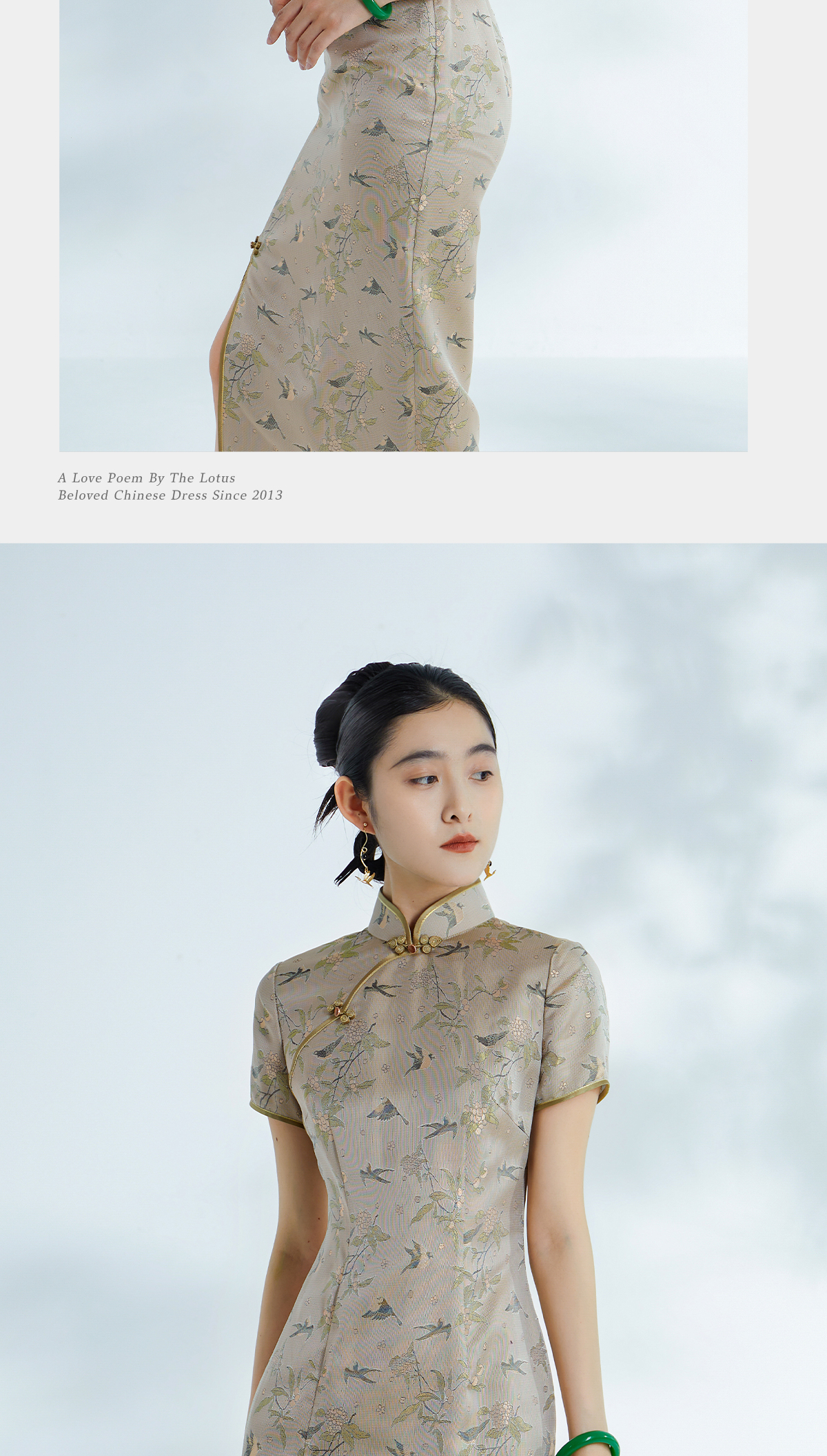 荷言GL 婉兮 山雀琵琶纹仿罗丝质旗袍浅绿色手工盘扣