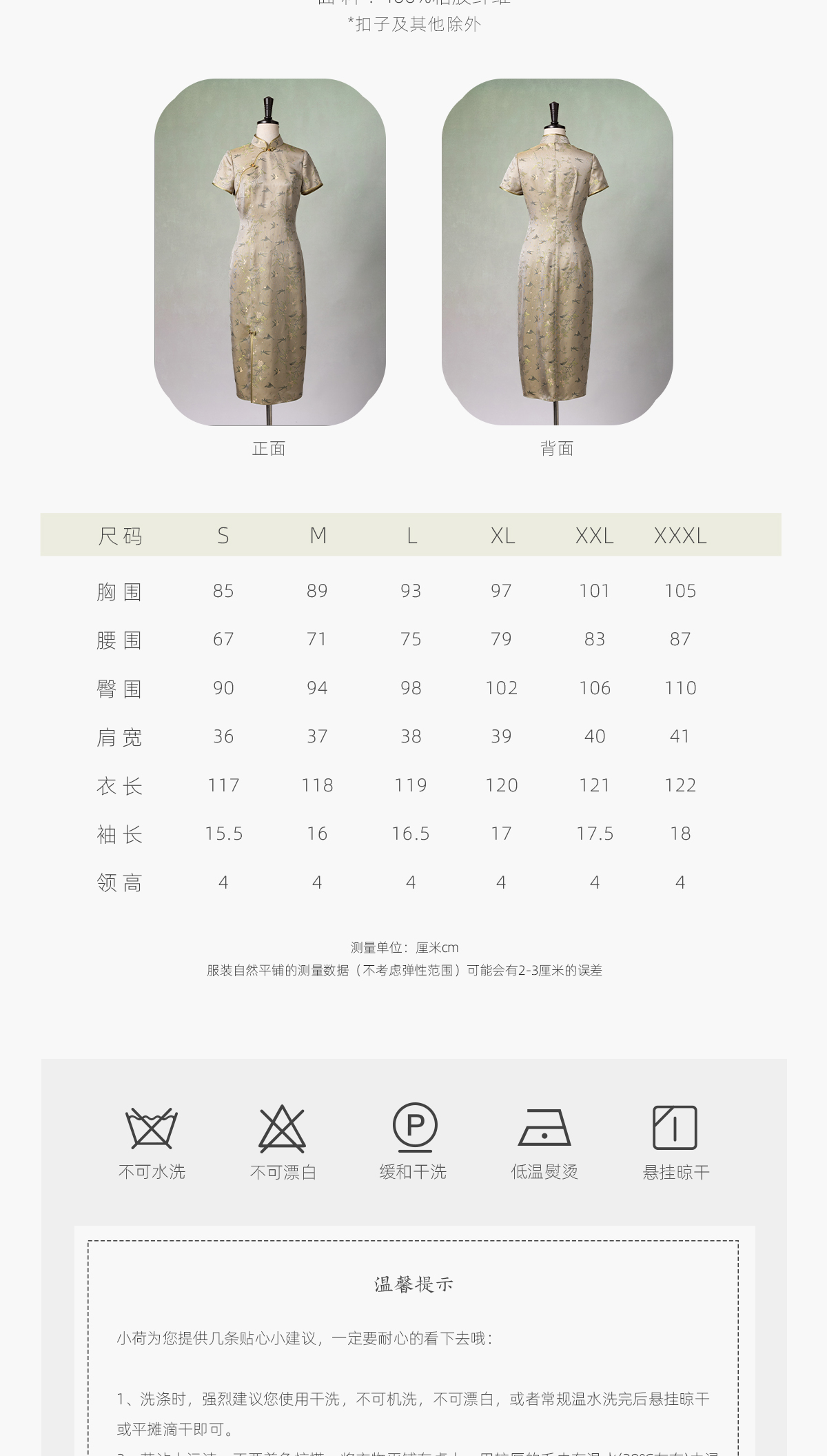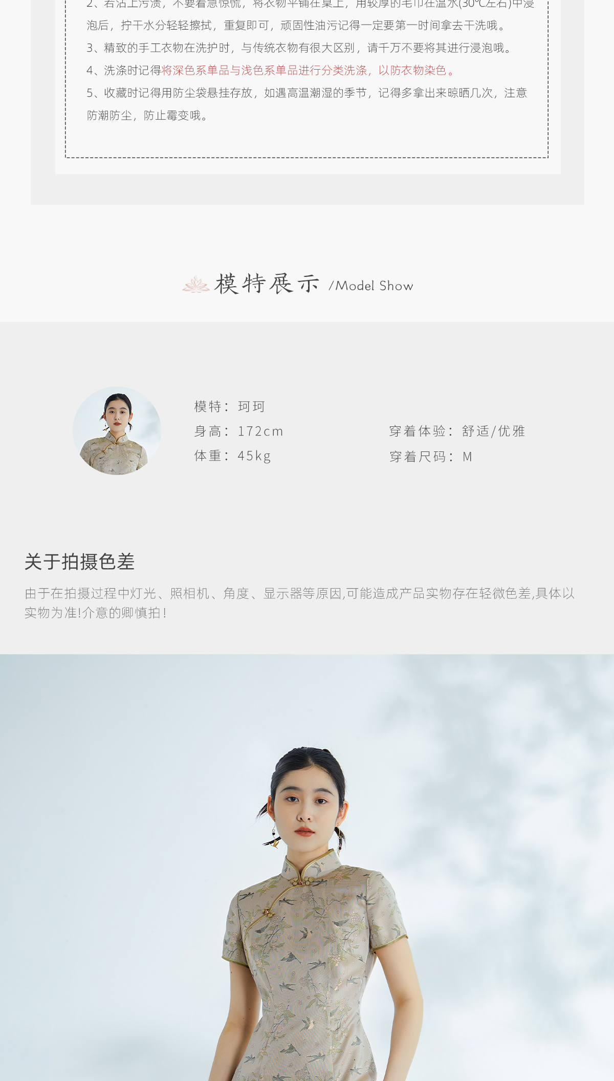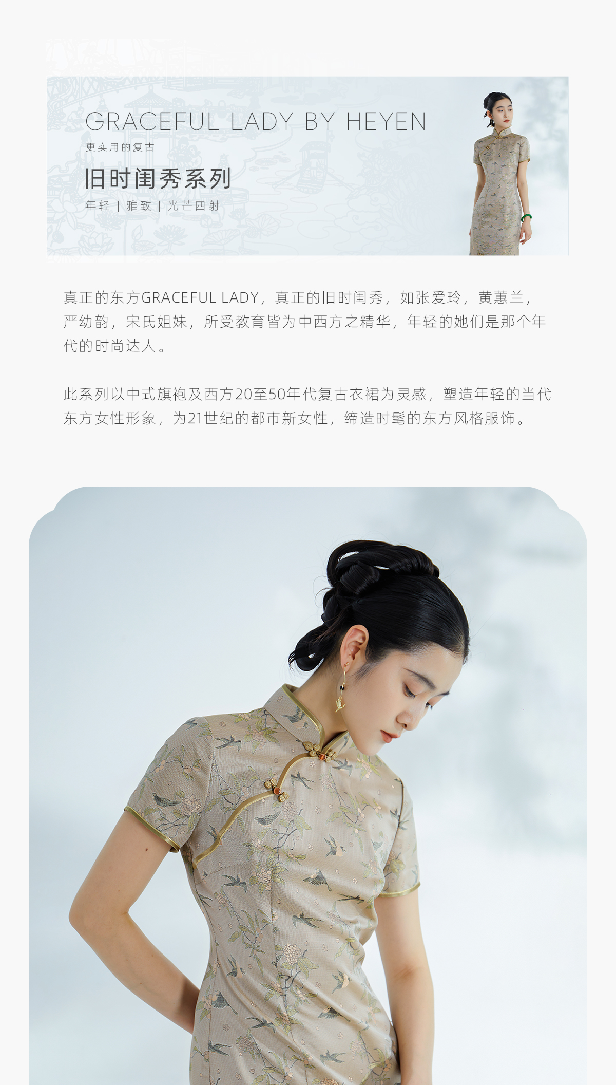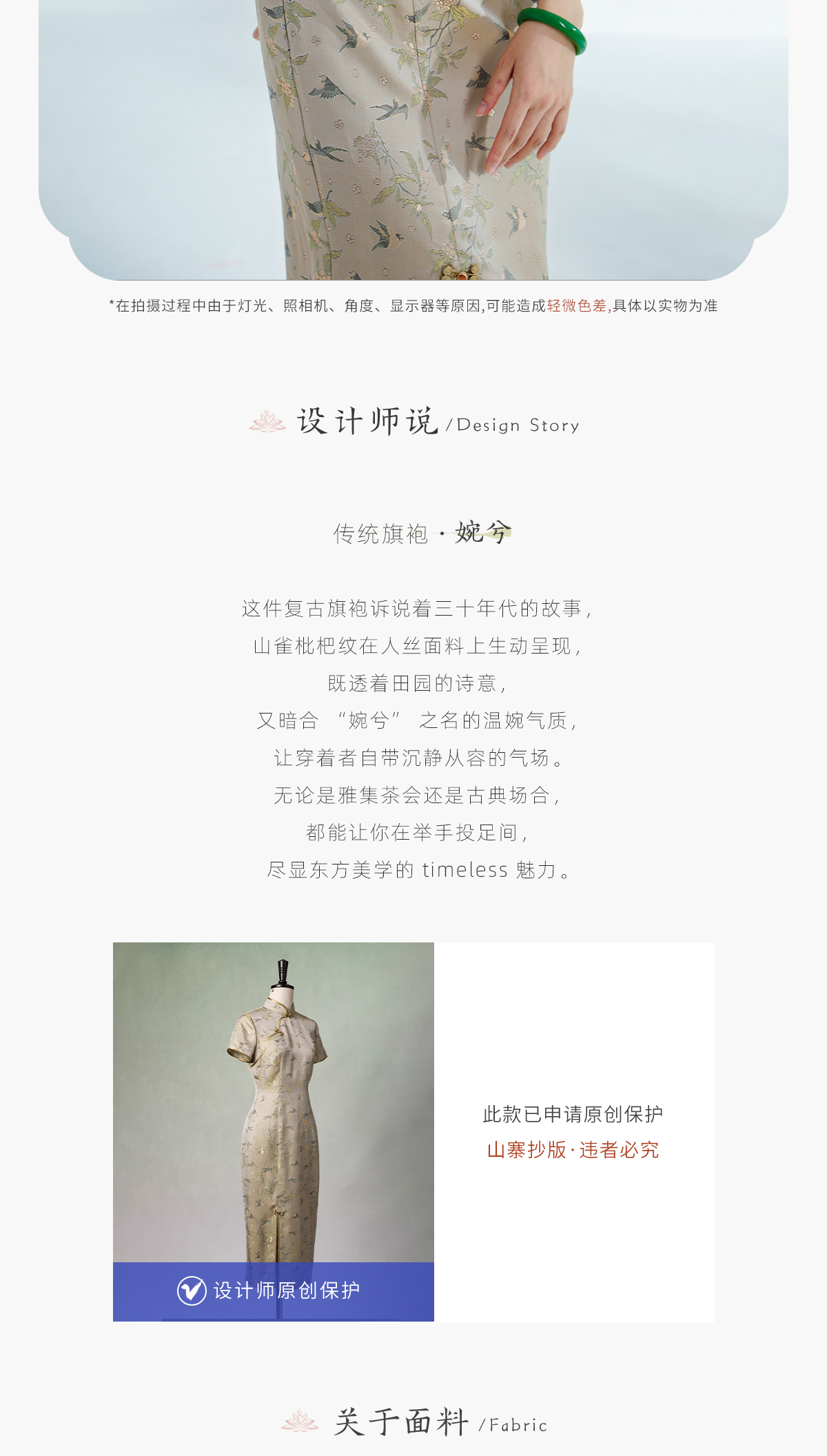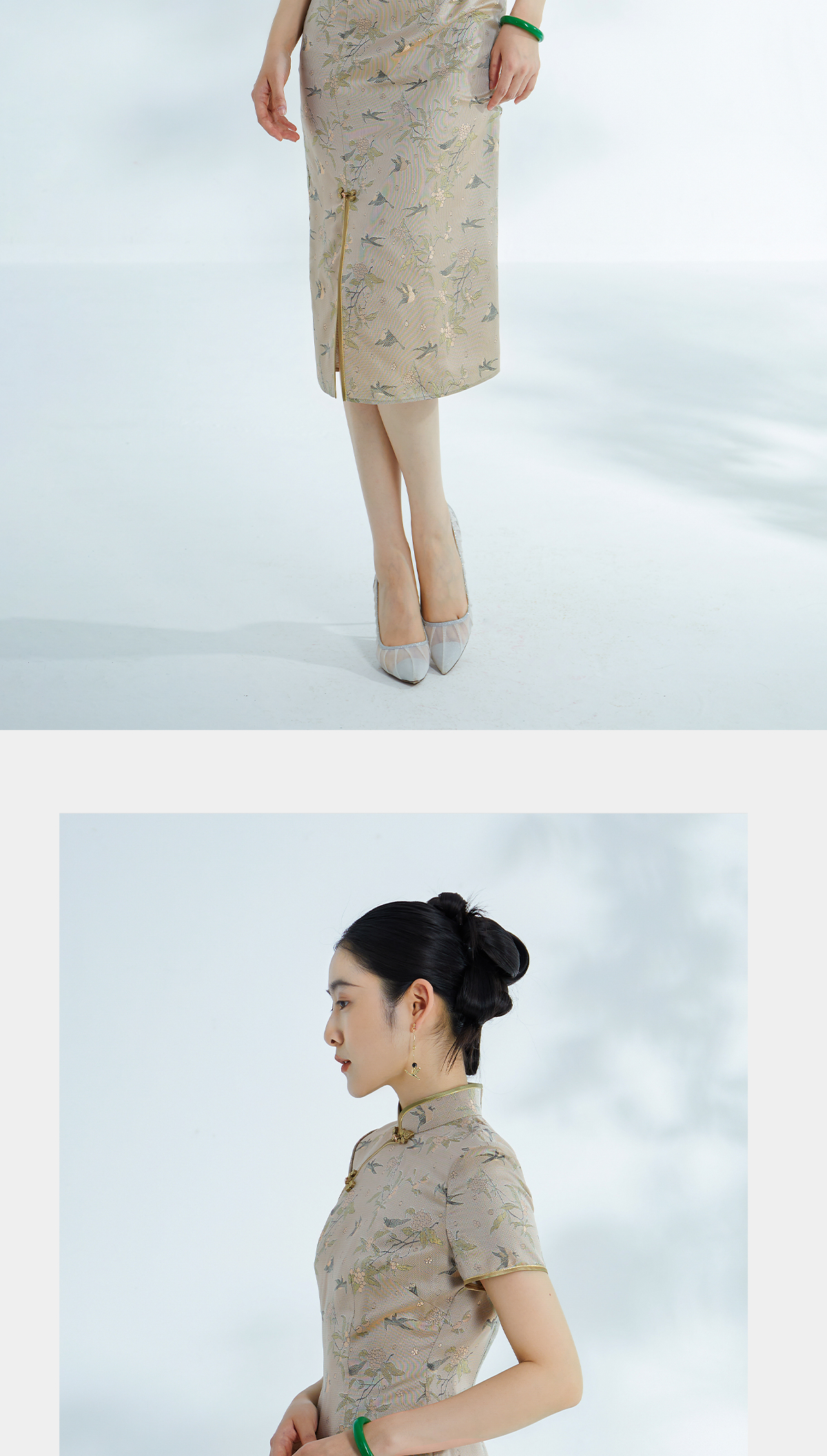 荷言GL 婉兮 山雀琵琶纹仿罗丝质旗袍浅绿色手工盘扣