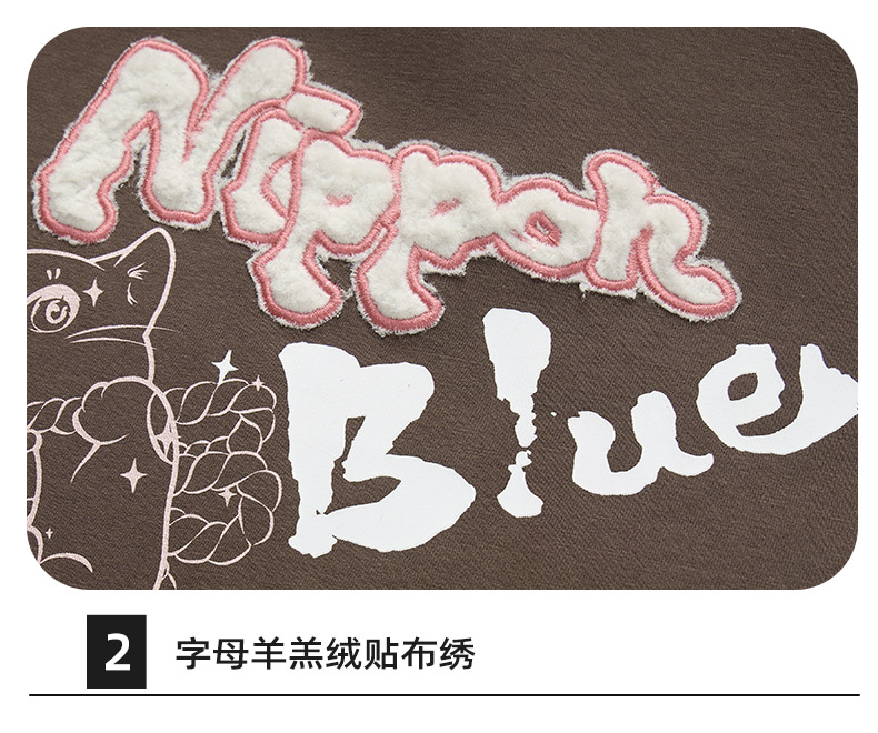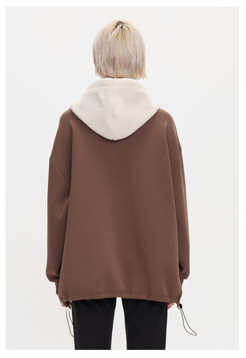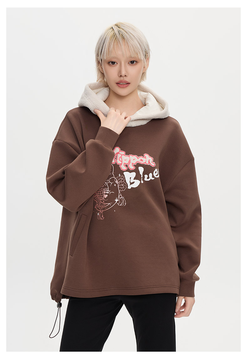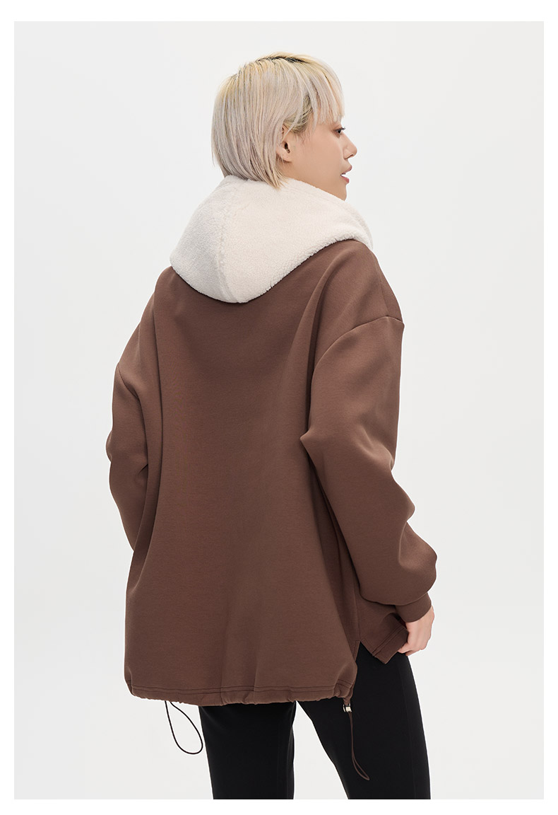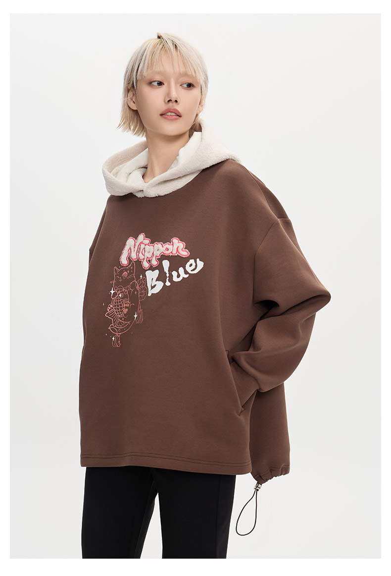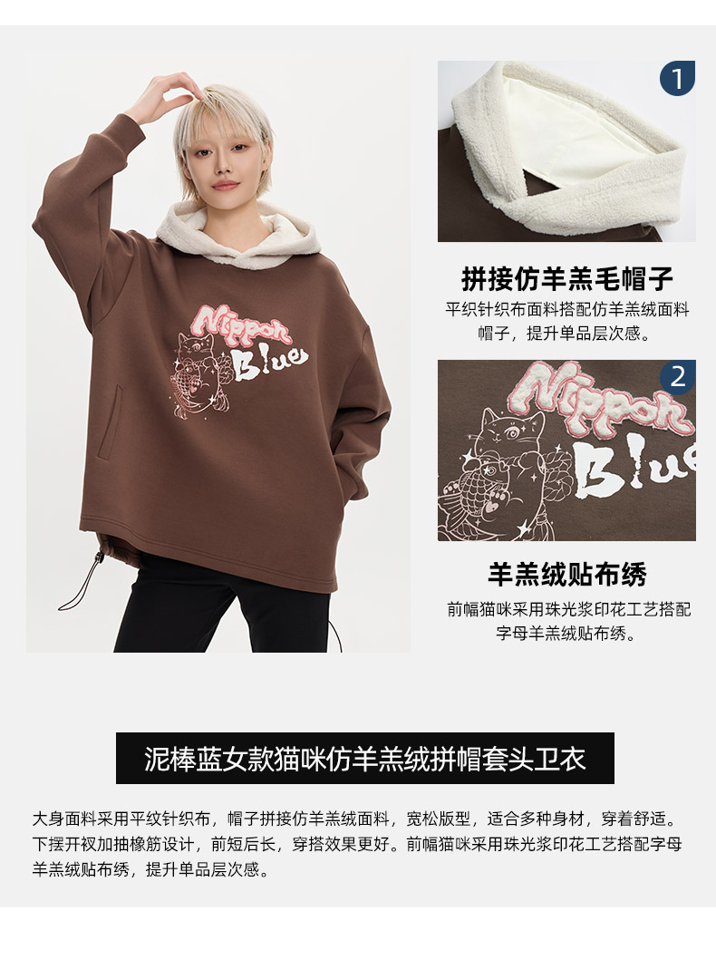 ONIARAI/鬼洗25秋冬泥棒蓝女款猫咪仿羊羔绒拼帽套头卫衣 N240159