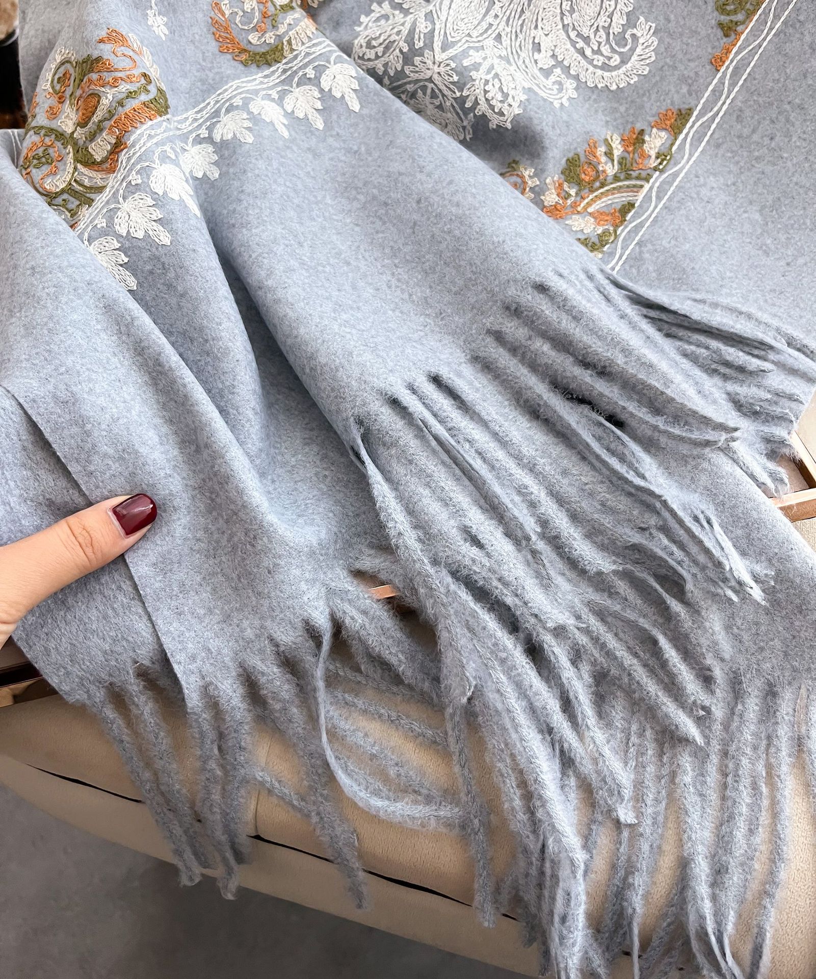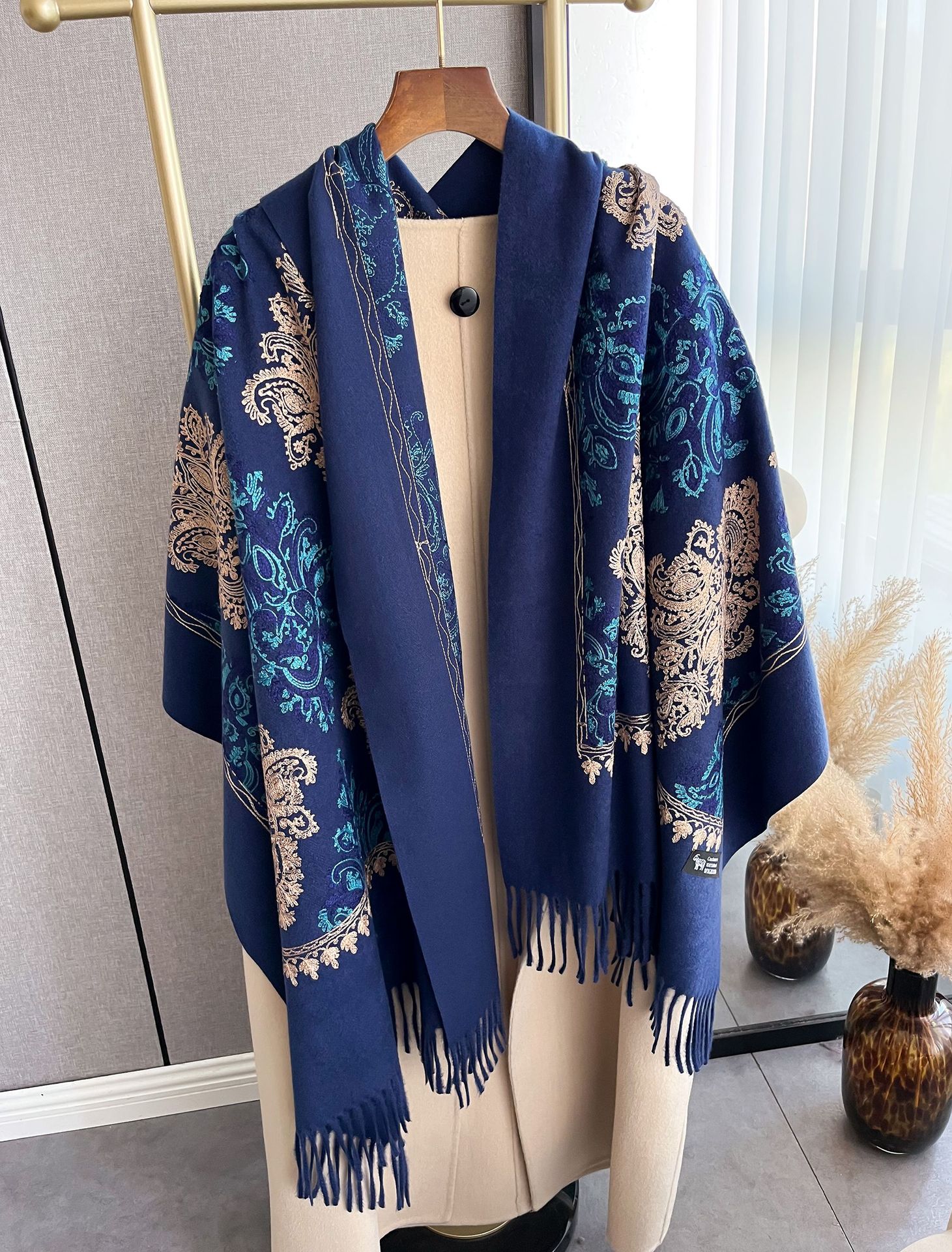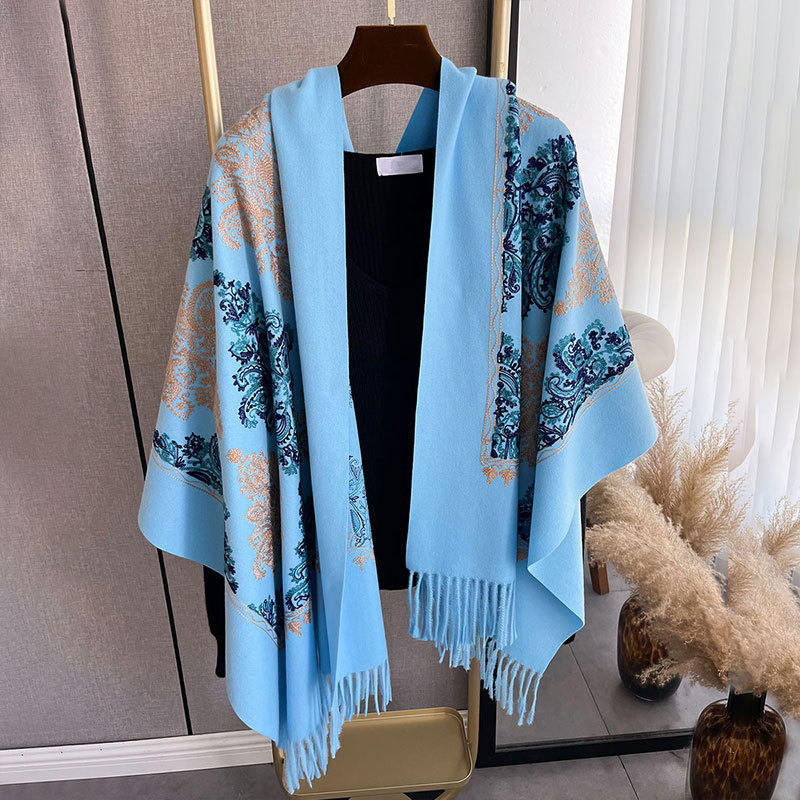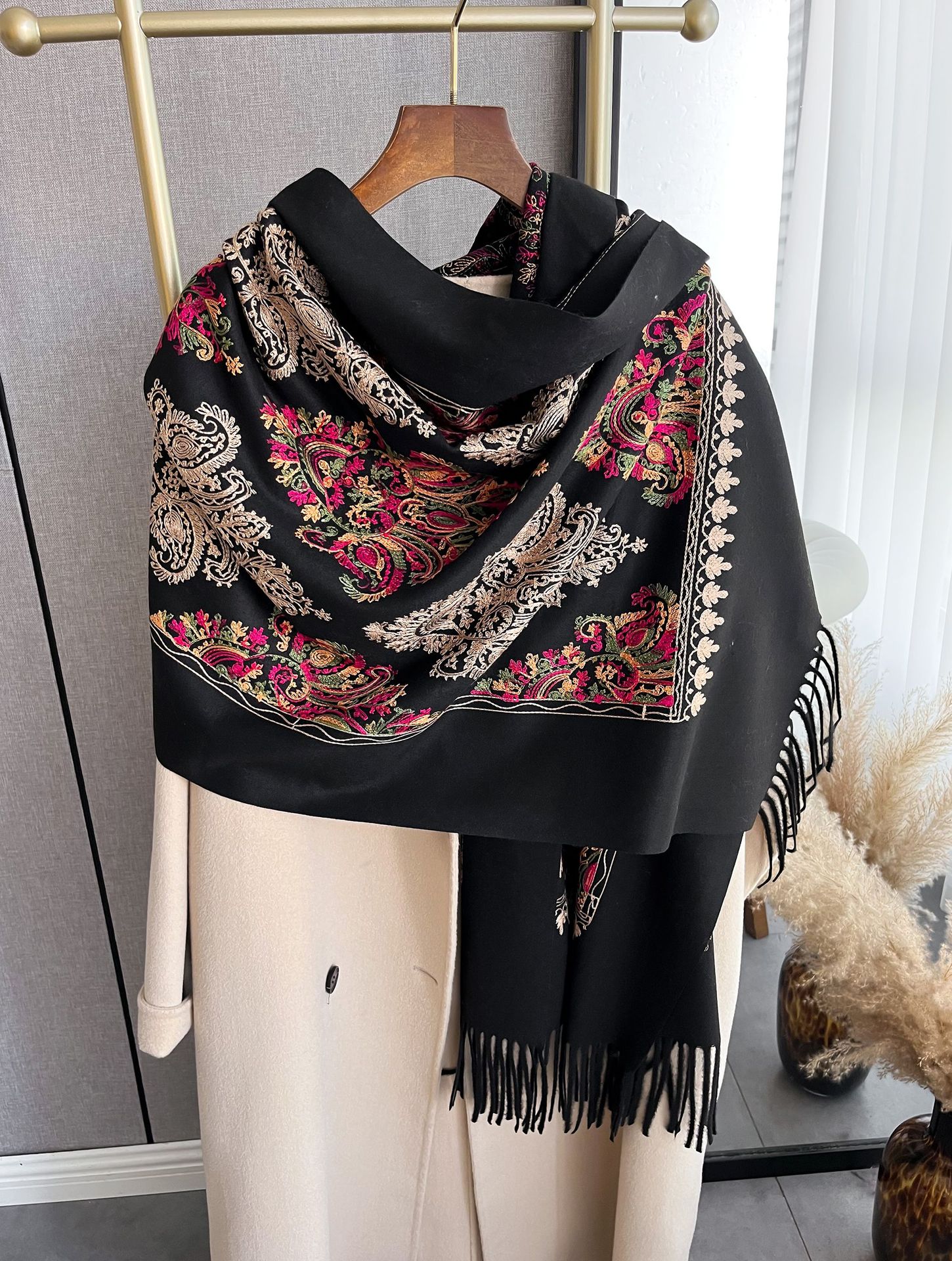 秋冬季仿羊绒刺绣围巾女 流苏花卉 加厚民族风 旅游搭配披肩长款微围