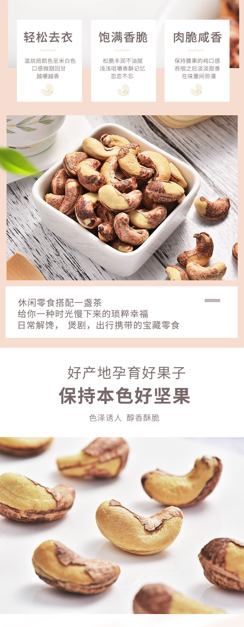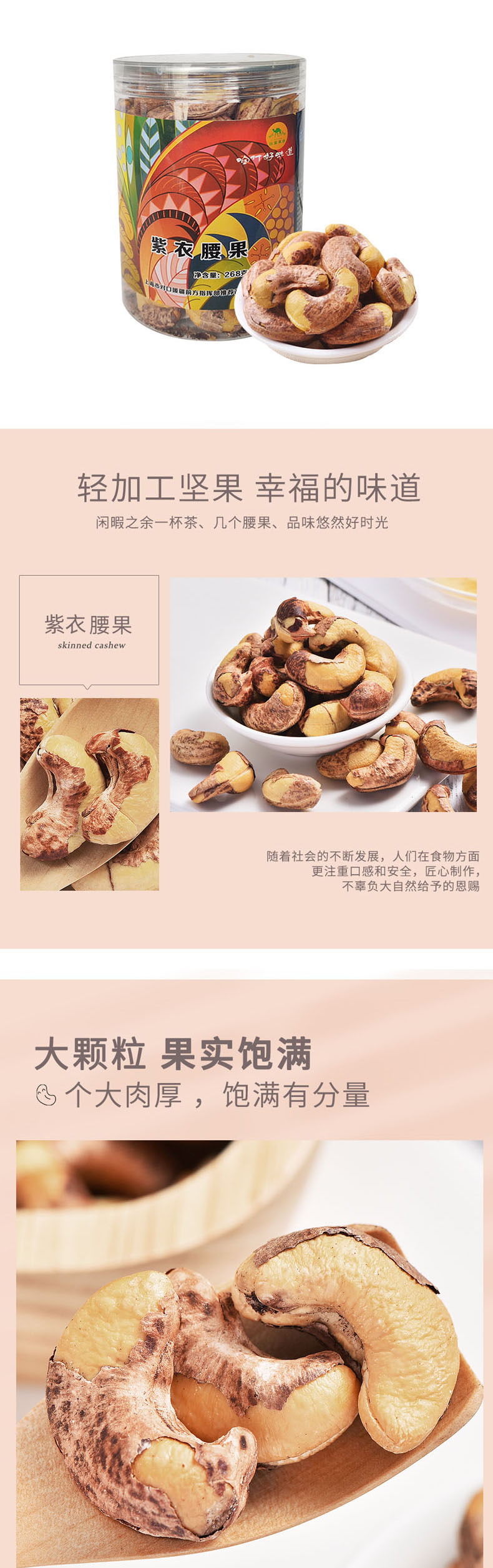 精选大颗粒完整果仁,淡紫色薄薄果衣轻捏即碎,剥开即是金黄饱满的肉粒,浓浓果香溢出,果仁粒大肉厚耐嚼,肉质丰富,松脆醇香,回味甘甜,轻度烘培保留美味健康,口感微咸,爽脆甘香