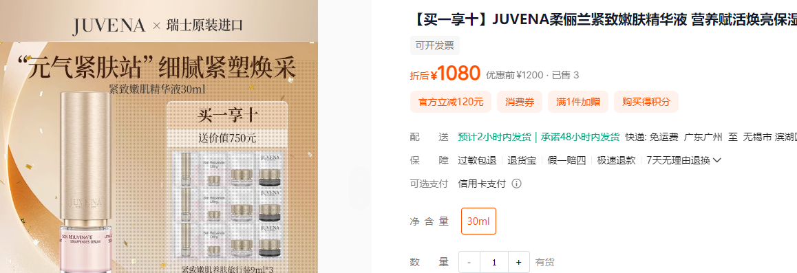 【品名】JUVENA柔俪兰 紧致嫩肤精华液30ml