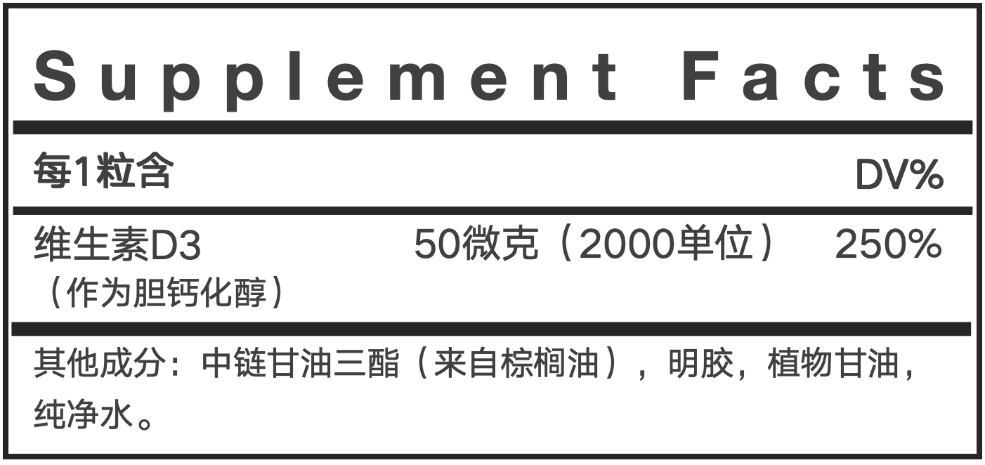 每粒提供2000国际单位来自羊毛脂的天然维生素D3,可以满足希望补充高剂量维生素D人群的需求。