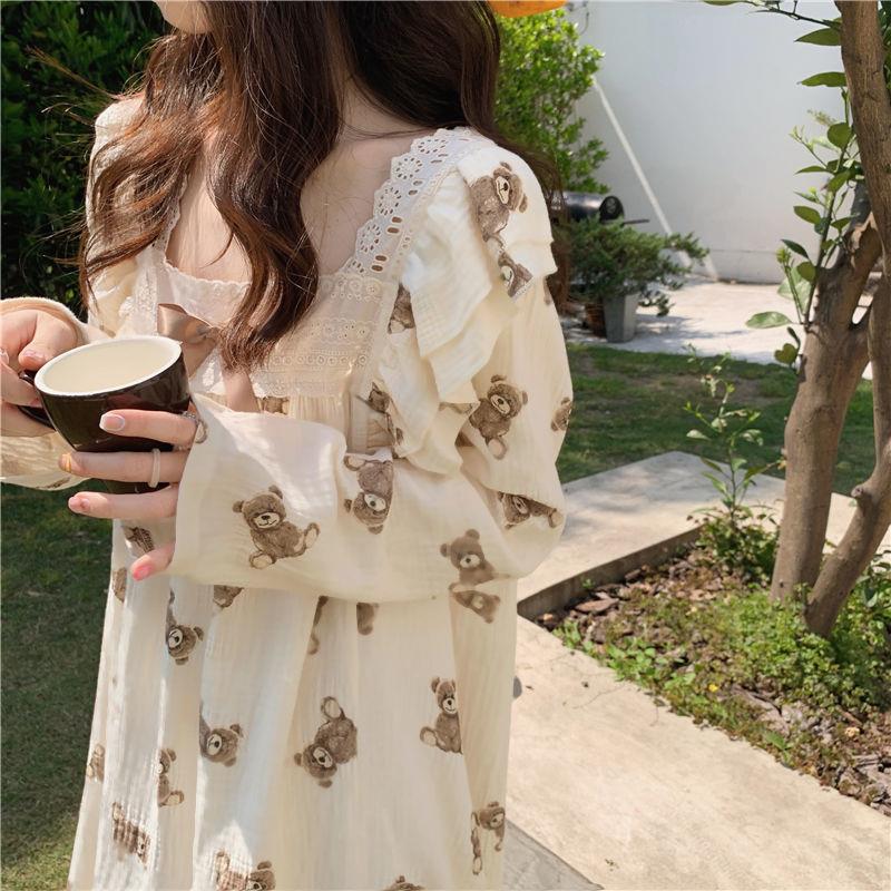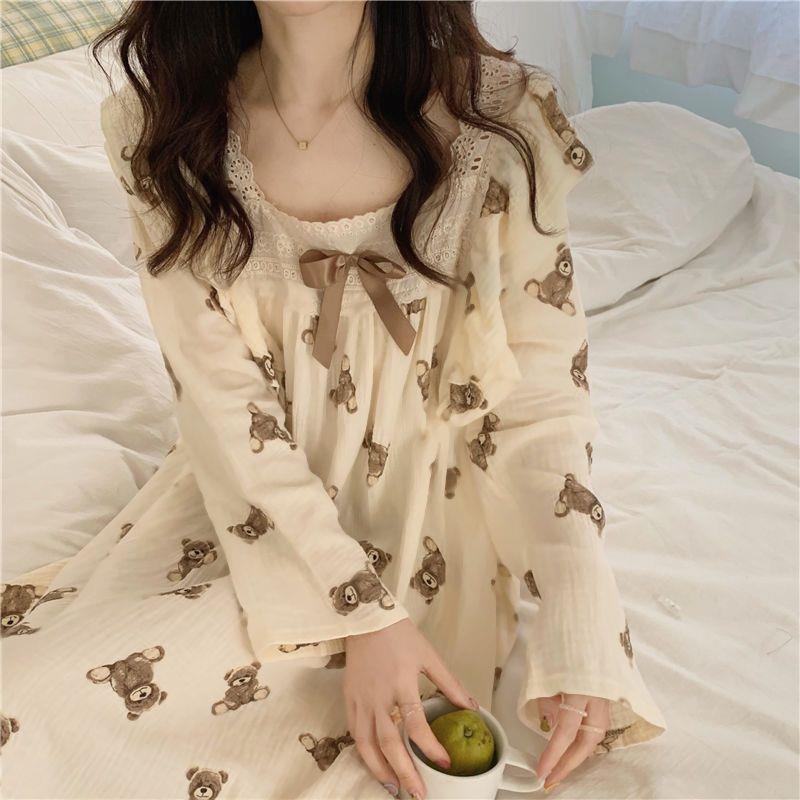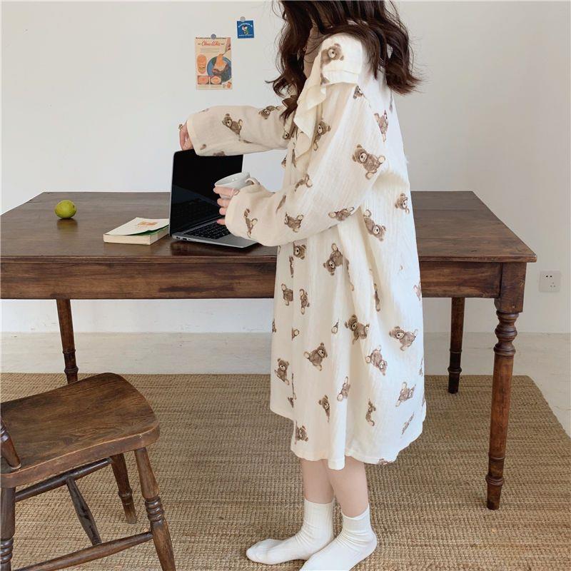 【超美纯欲风!可爱甜美小熊睡裙】舒适到像裸穿,穿上不想脱下来!日系甜美长款睡衣,长袖韩版睡裙宽松睡衣女秋冬款宽松家居服可外穿春