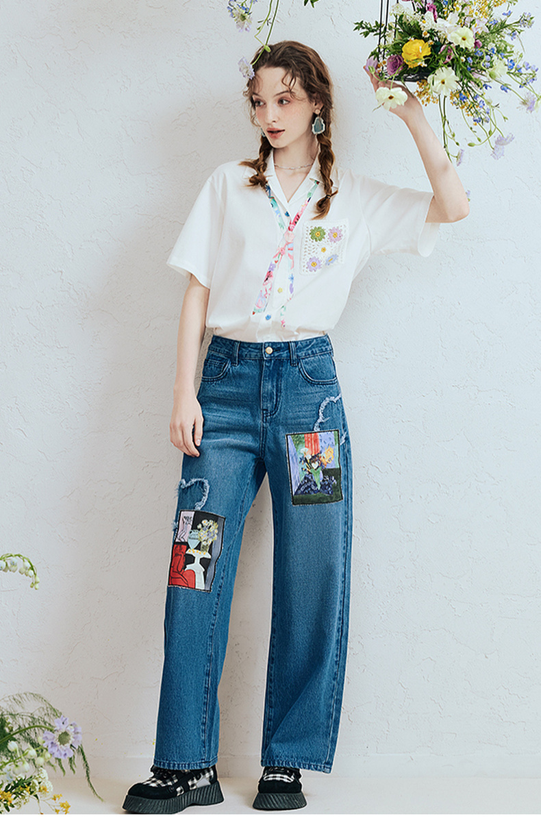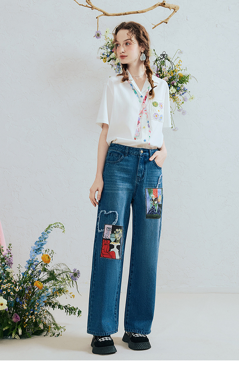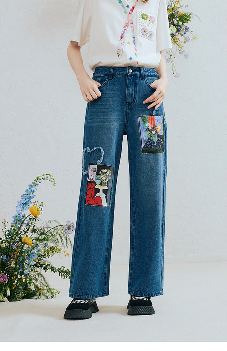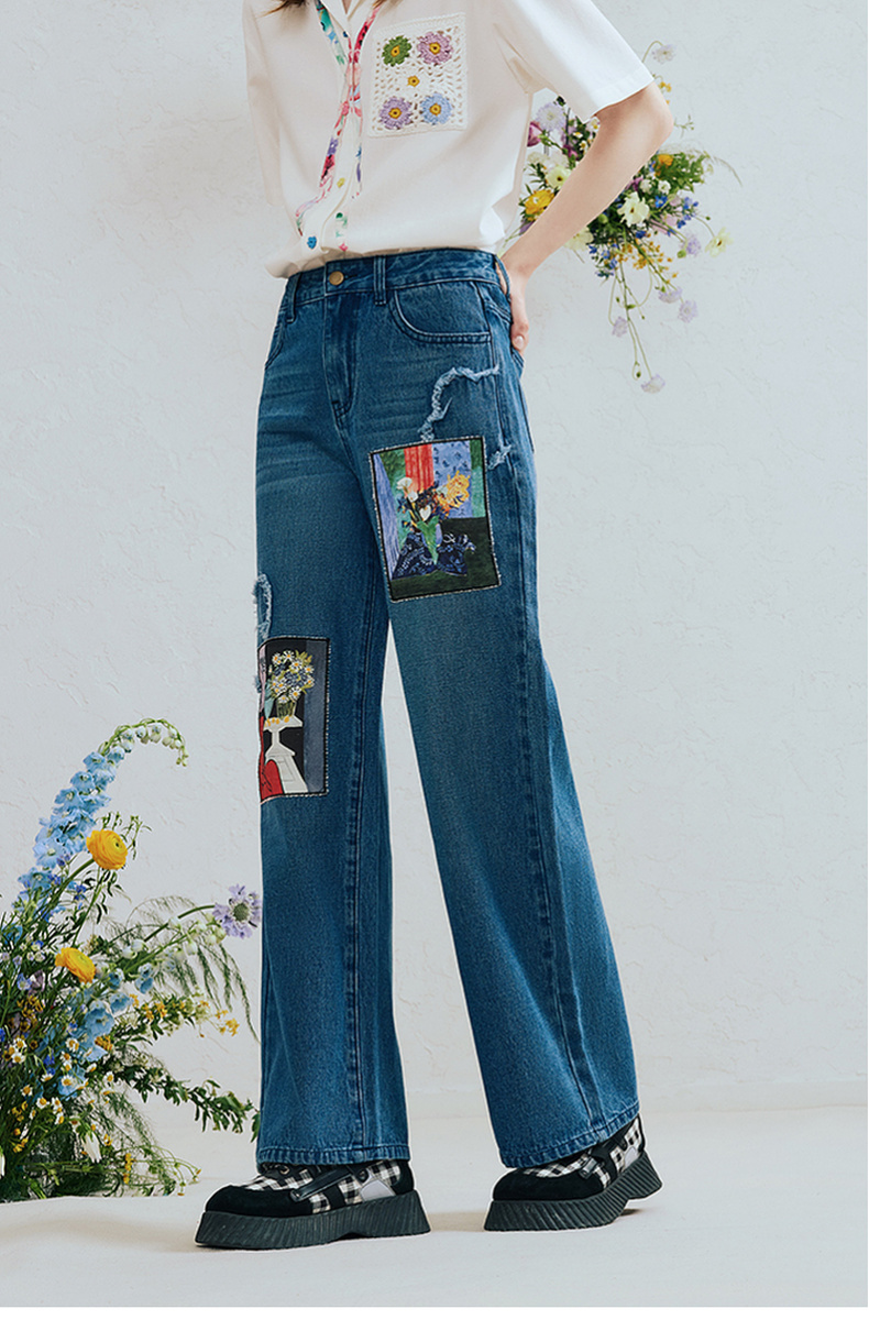 两三事 初梦终章 2025夏季新款复古印花贴布绣直筒牛仔裤女