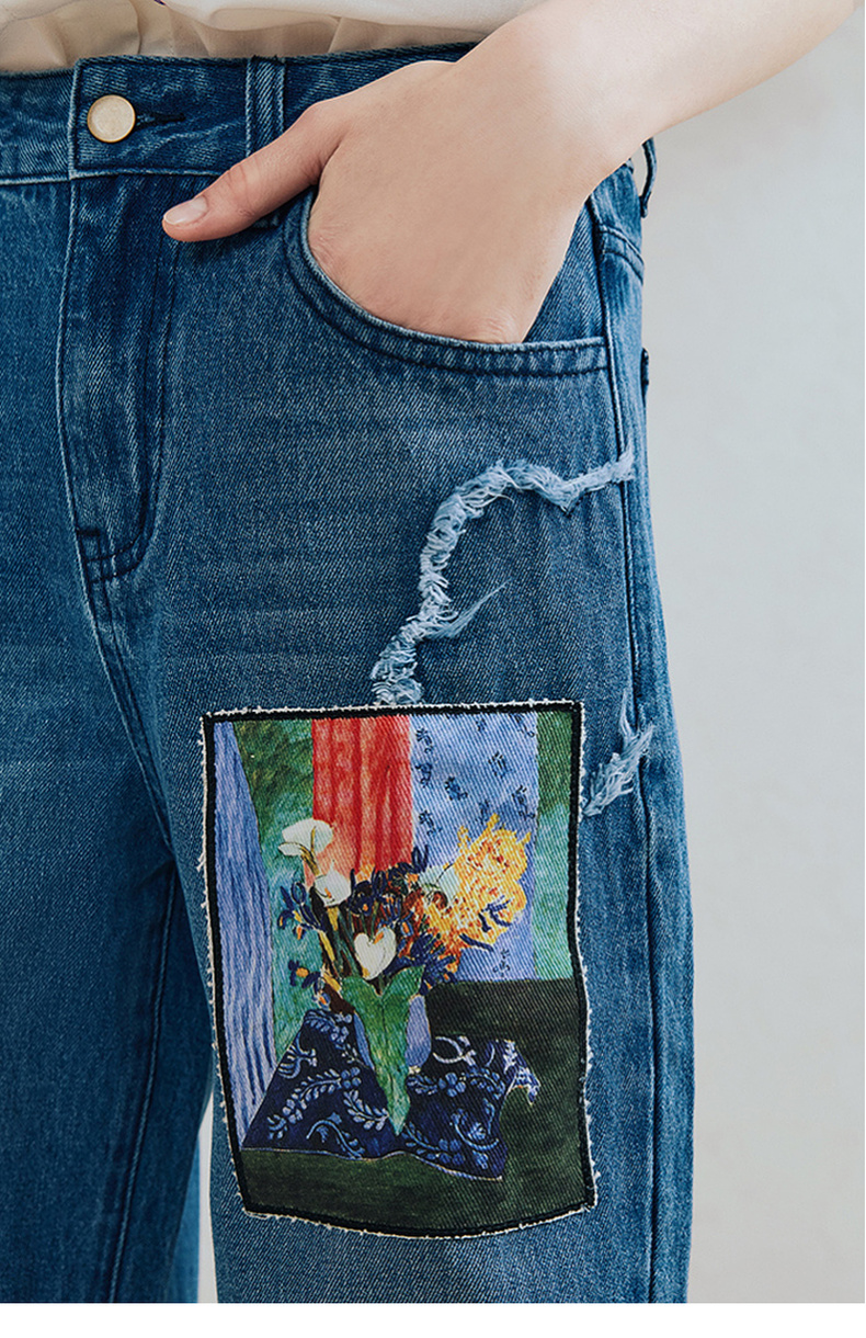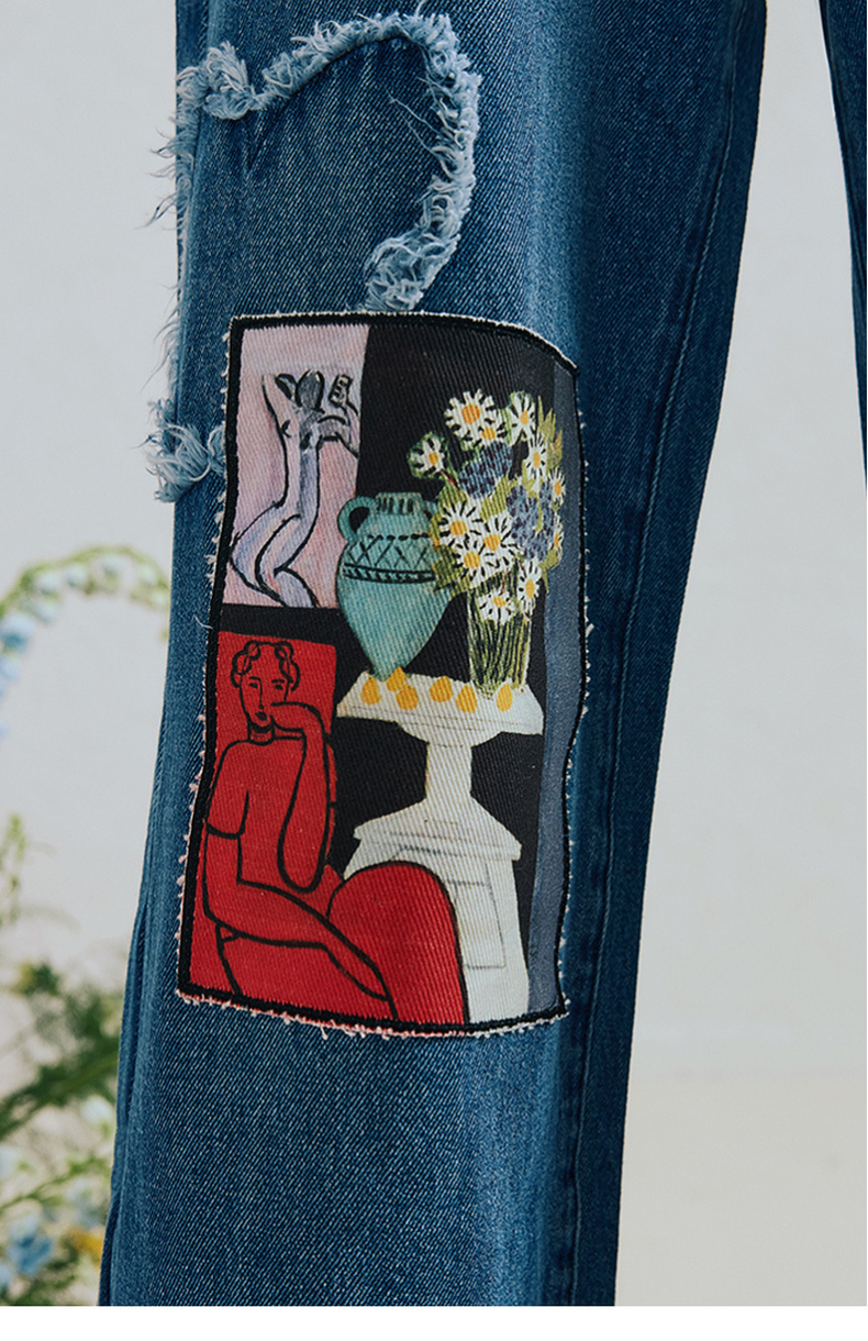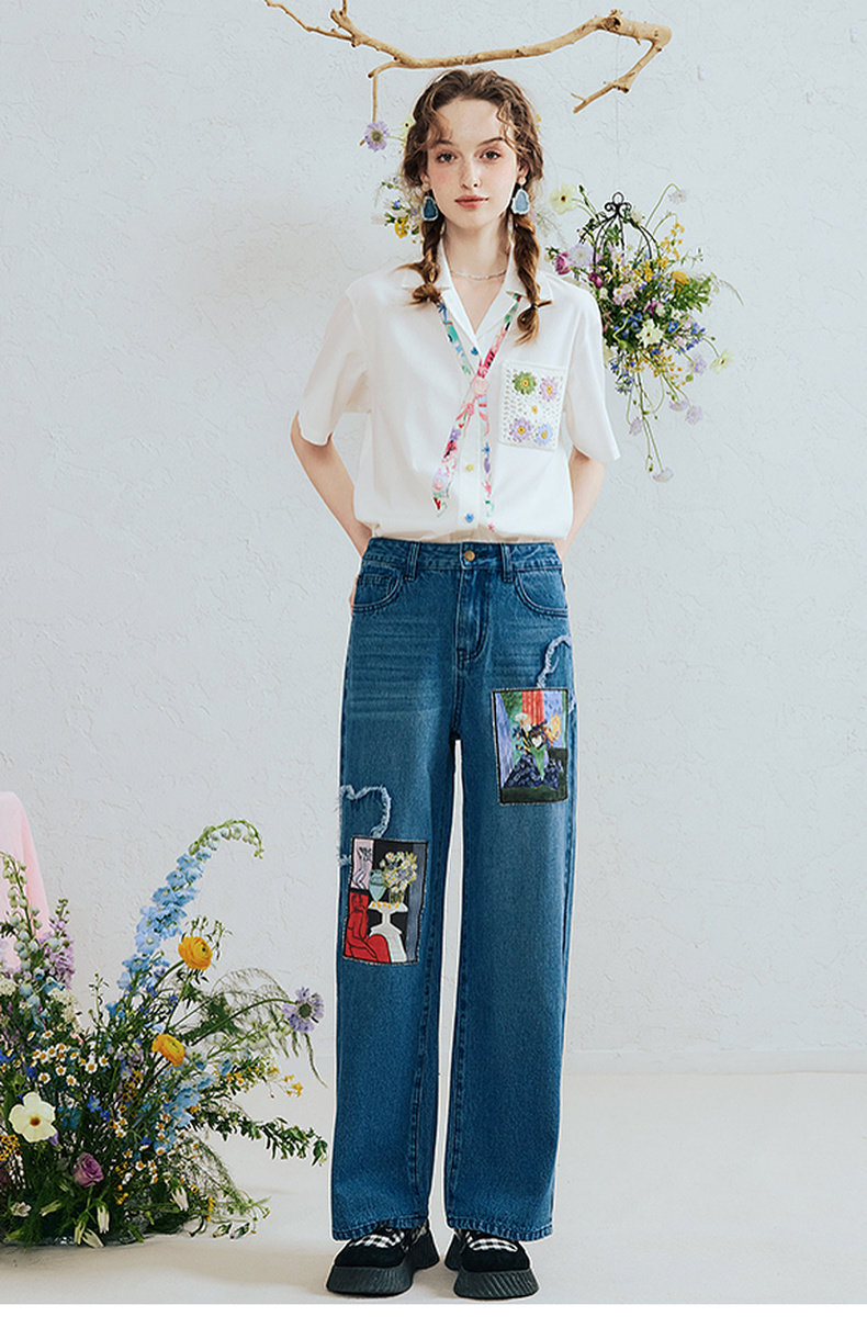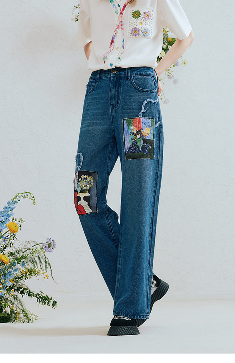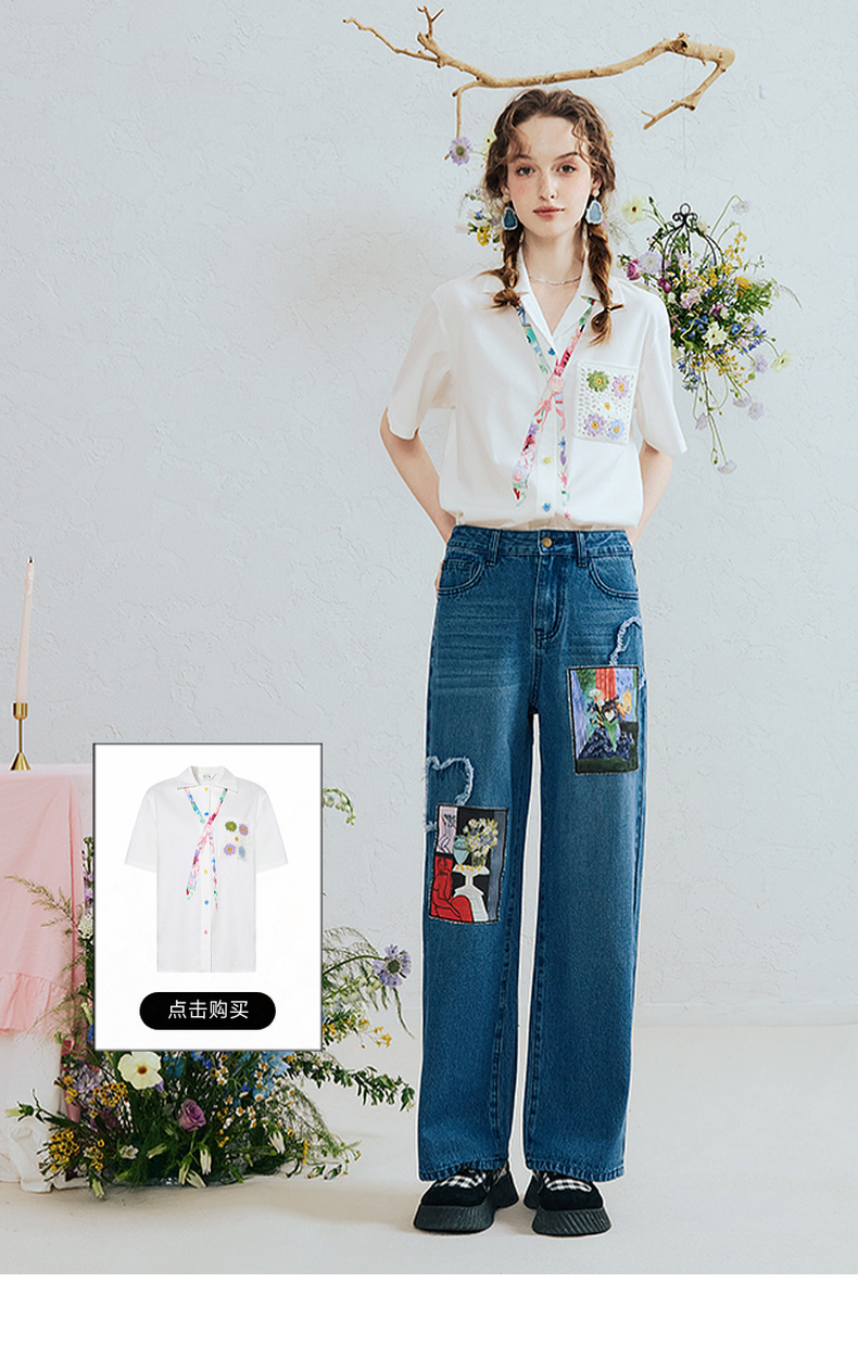 两三事 初梦终章 2025夏季新款复古印花贴布绣直筒牛仔裤女