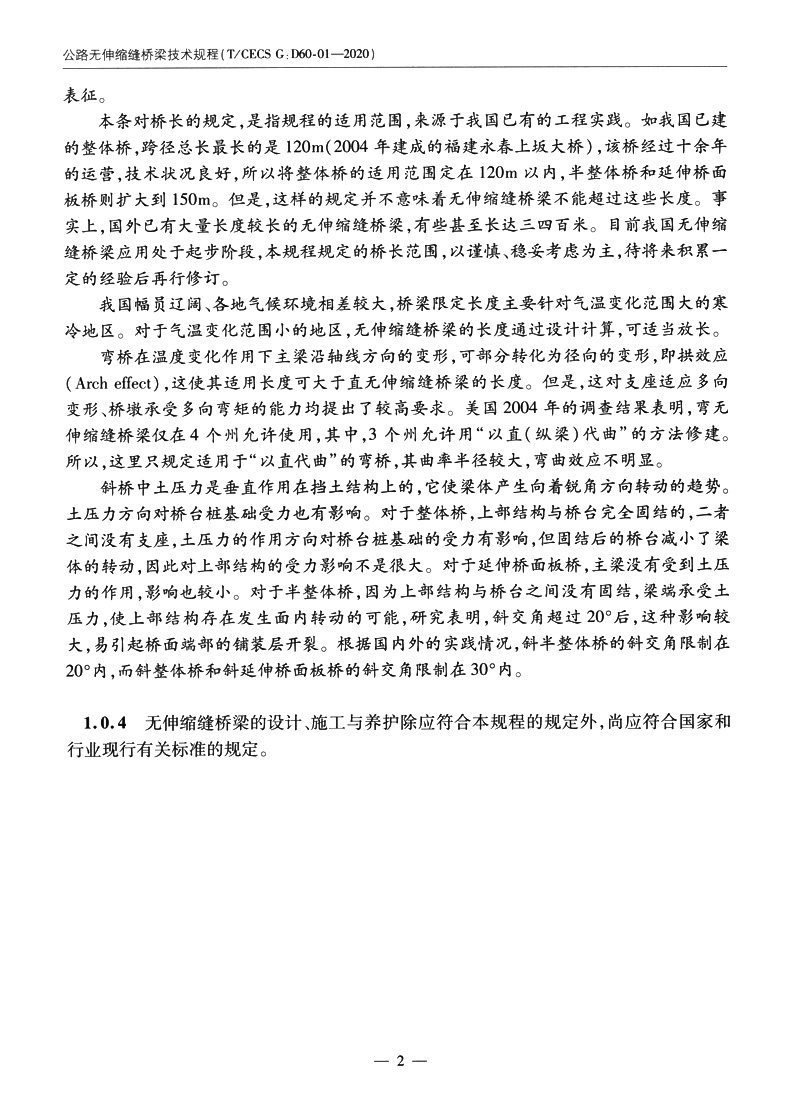 | 公路无伸缩缝桥梁技术规程(T/CECS G:D60-01—2020) | ||