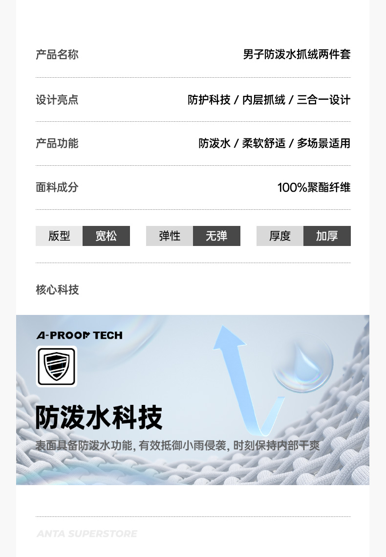 超级安踏抓绒两件套男子秋冬防泼水外套抓绒内胆三合一152546608U
