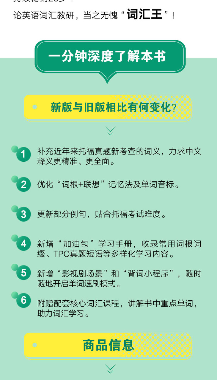 伴随着托福真题的更新迭代,本书也迎来了全新改版升级。本次改版补充了近年来托福真题新考查的词义,完善了单词的中文释义;更新部分例句,更加贴合托福真题难度;同时对单词的音标和记忆法进行了优化。