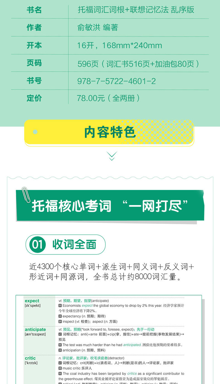 《托福词汇词根+联想记忆法 乱序版》收录近4300个托福核心单词,提供大量派生词、同义词、形近词和同源词,收录托福常考搭配,全书总计约8000词汇量。