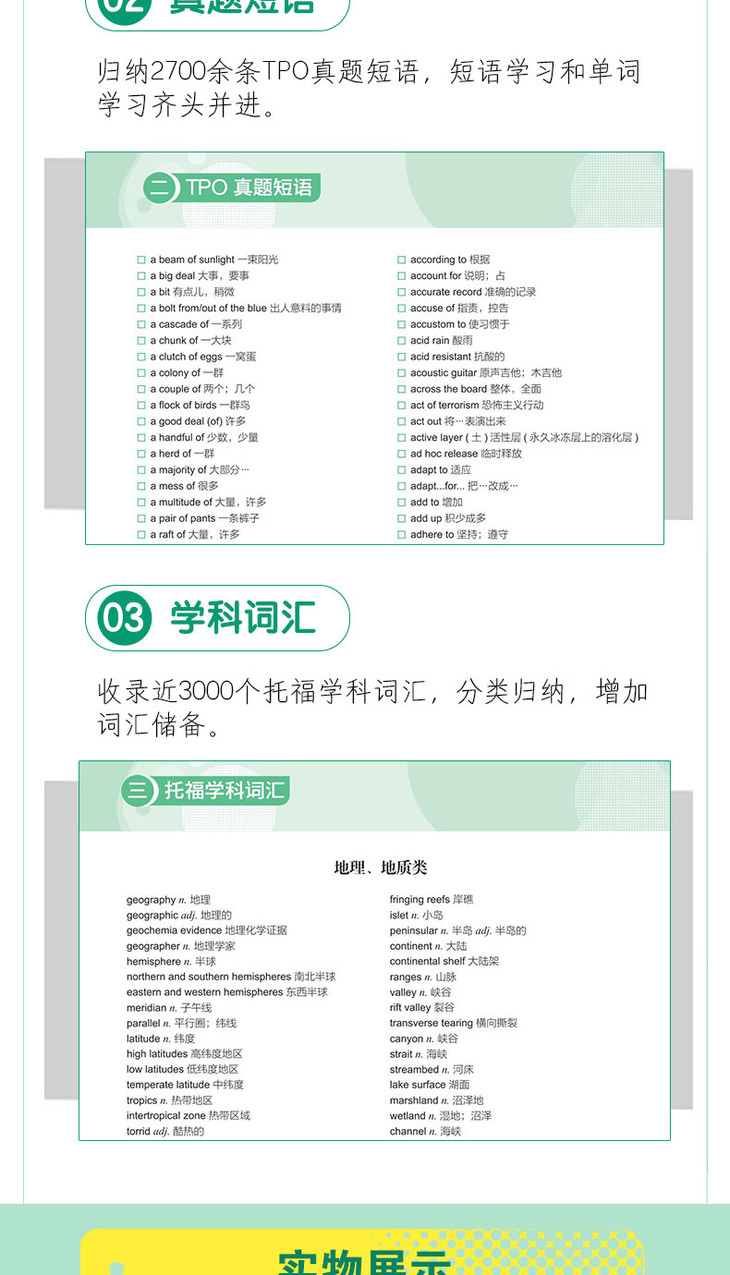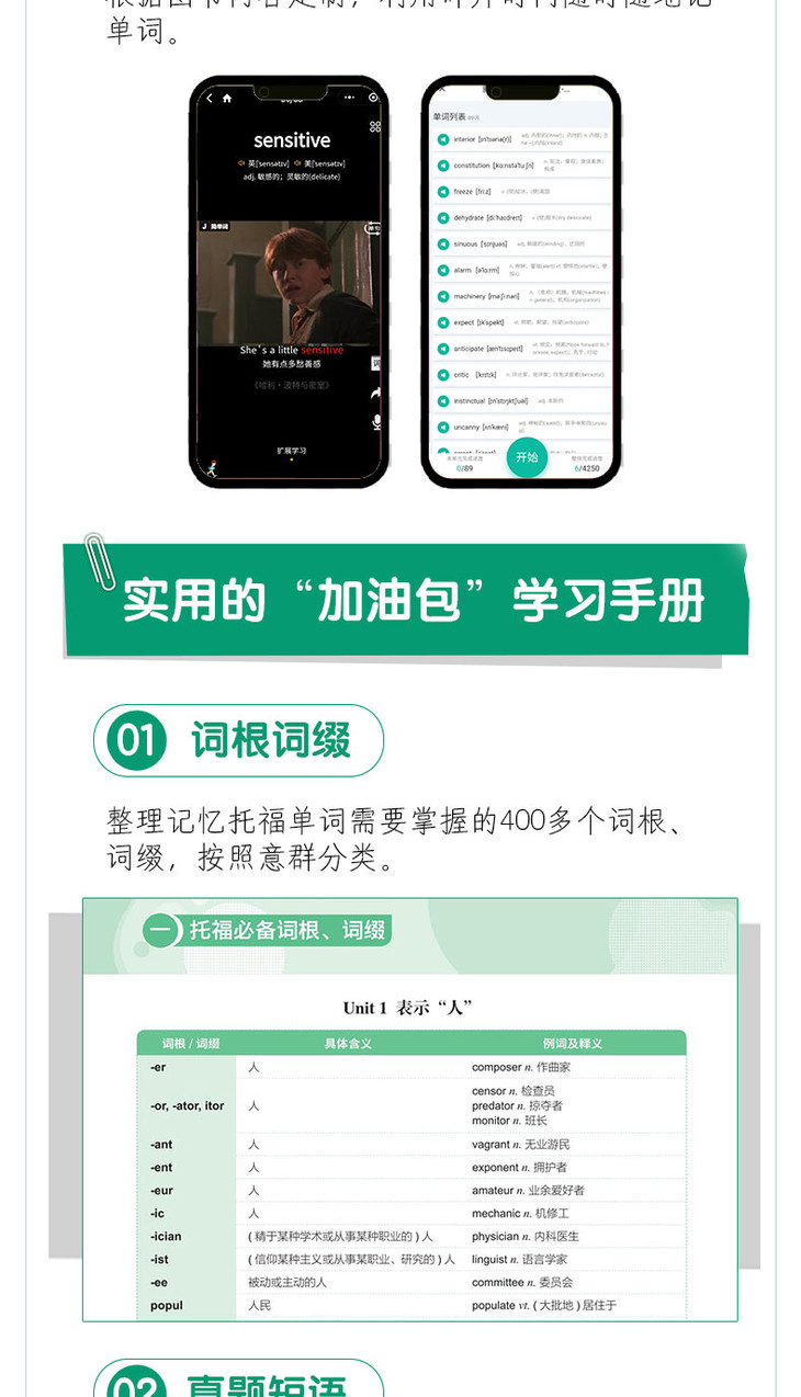 ★ “加油包”学习手册收录400多个词根、词缀,2700余条真题短语,近3000个托福学科词汇等实用内容,拓展词汇学习的深度和广度。