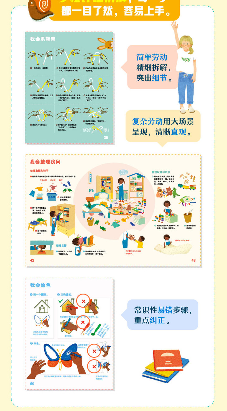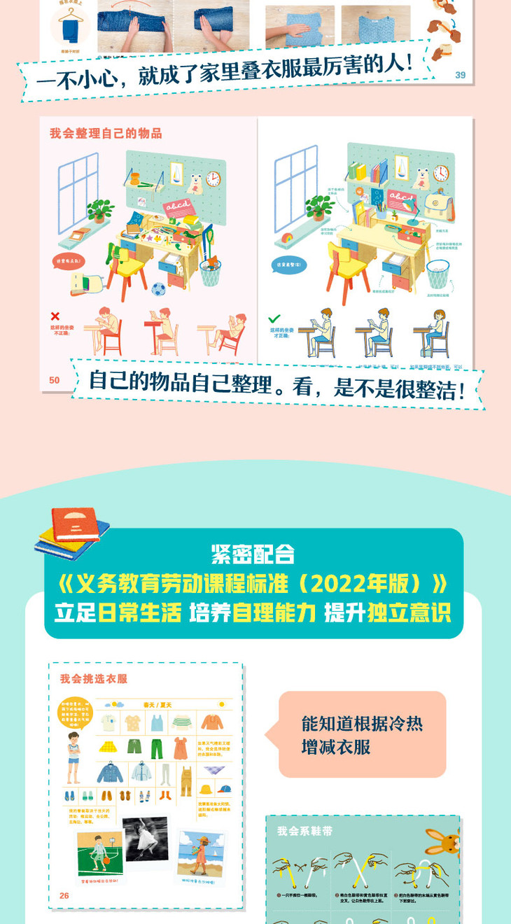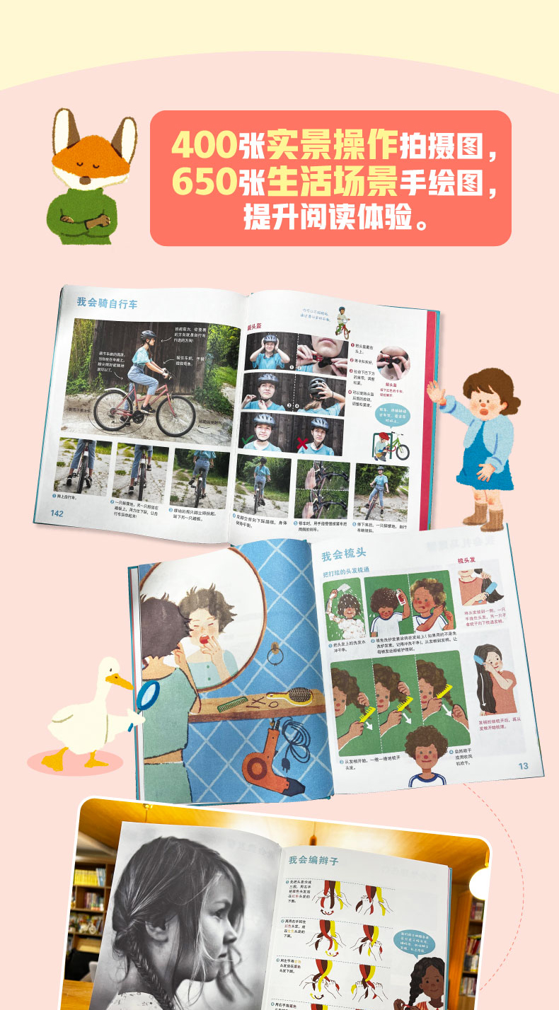 本书通过在浴室、在卧室、在书桌前、在厨房、在家里、在外面、在学校7个场景,将近百种生活行为拆解成1000个动作,并通过650张手绘图和400张实景拍摄图的形式讲解操作步骤。主题涵盖《义务教育劳动课程标准(2022年版)》的对适龄孩子的自理能力要求,小到如何系扣子、穿鞋、梳头发,大到整理房间、打包行李、外出乘车如何系安全带……涵盖孩子的日常生活,提升孩子独立生活的能力。书中照片均来自小朋友实景操作,手绘图也十分生活化,色调温暖明亮,提升阅读体验,代入感强。