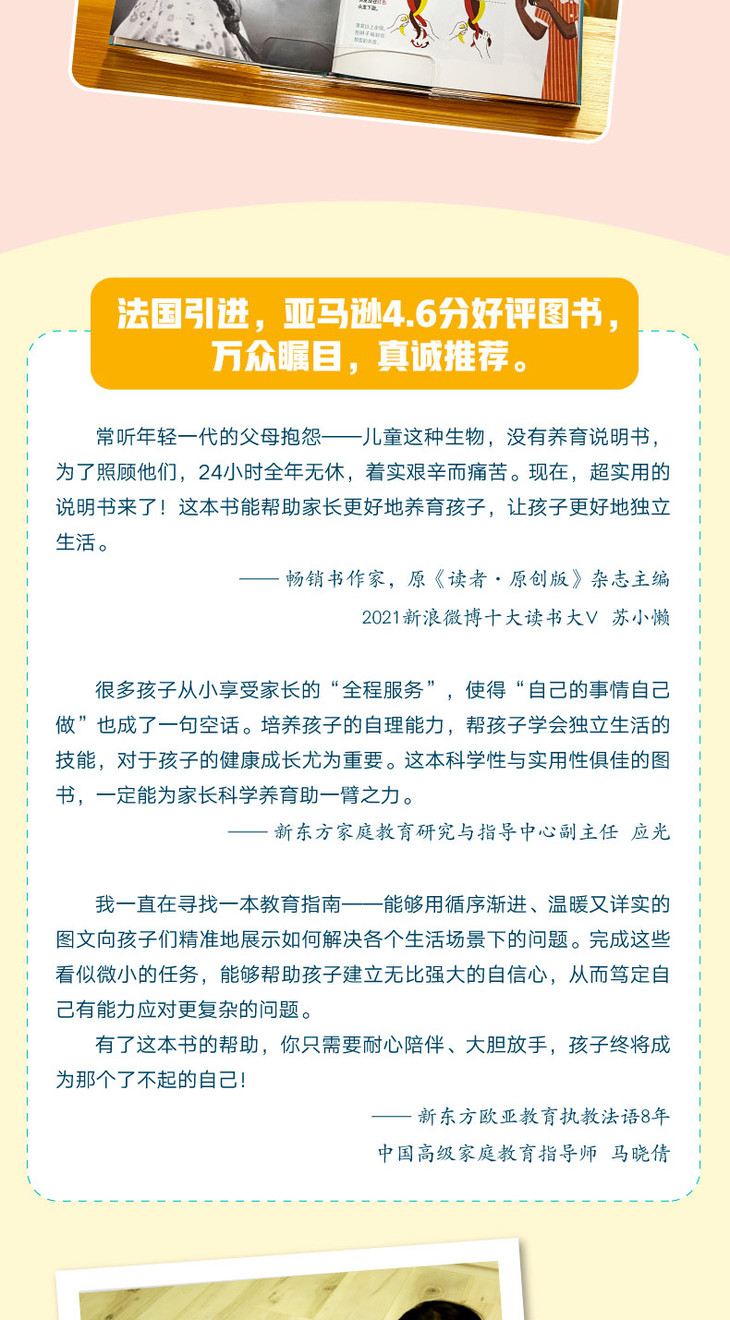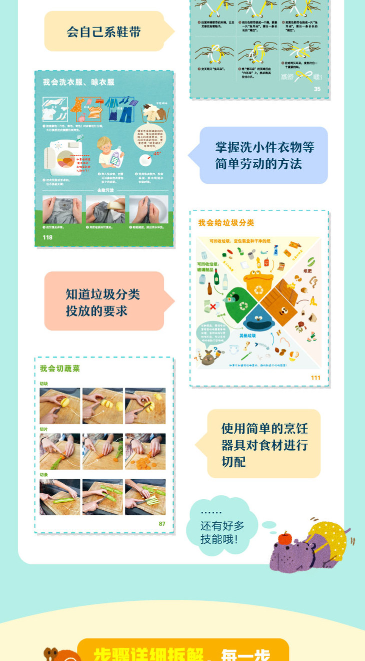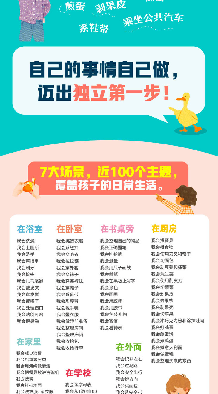 循序渐进的学习形式让生活就像一场冒险,鼓励孩子大胆尝试、自由探索。每完成一个主题,都能增强孩子的自信心,让孩子收获充实的成就感。这每一次的成就感,也将汇聚成一股力量,带给孩子生活独立的自信,引领孩子走向人格独立的未来!